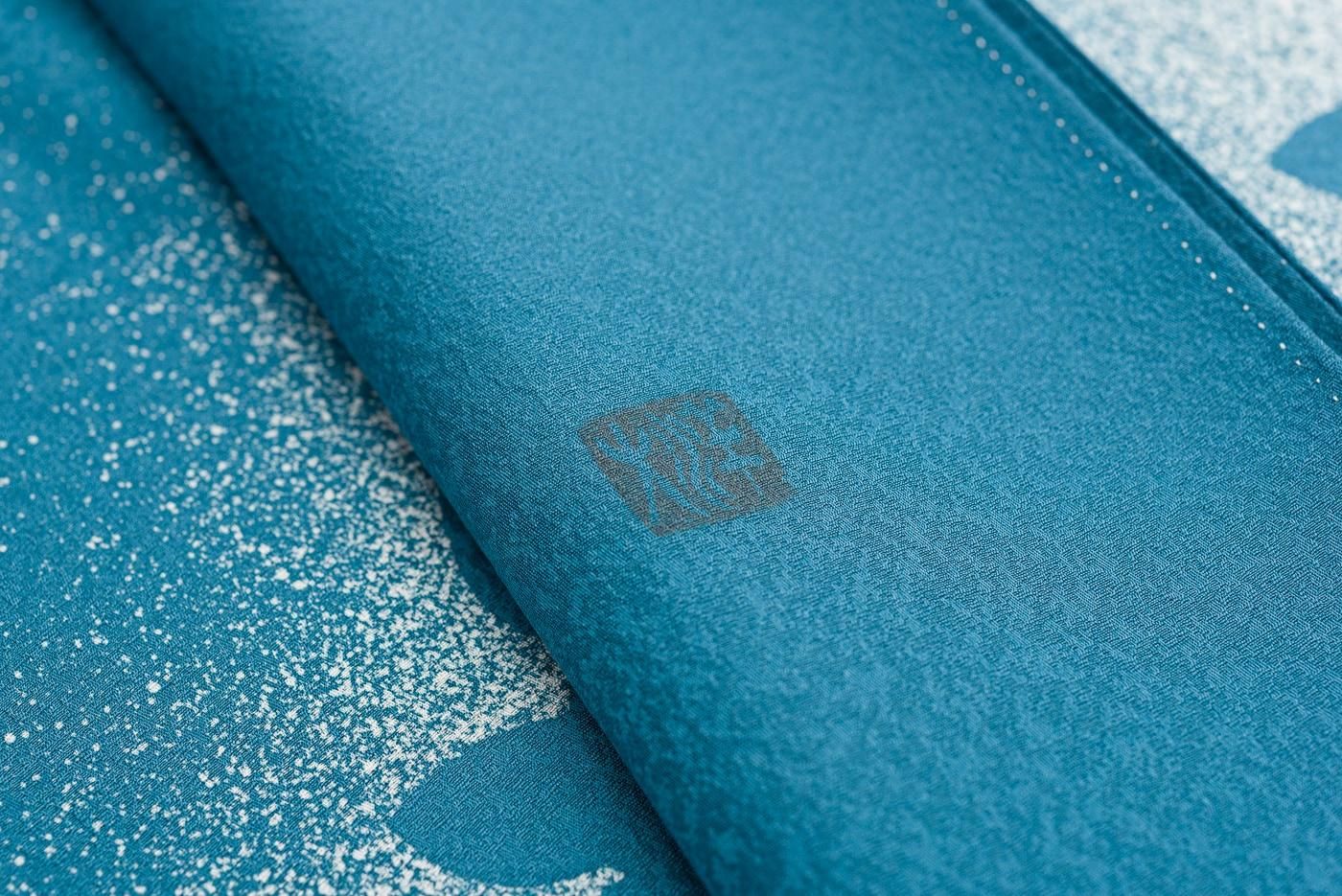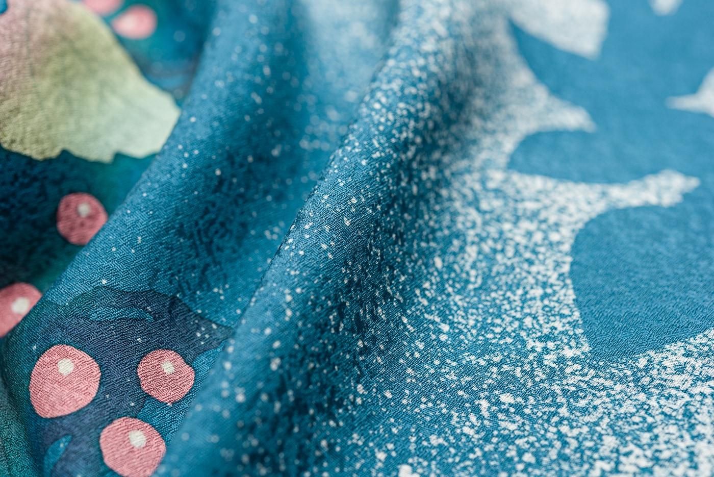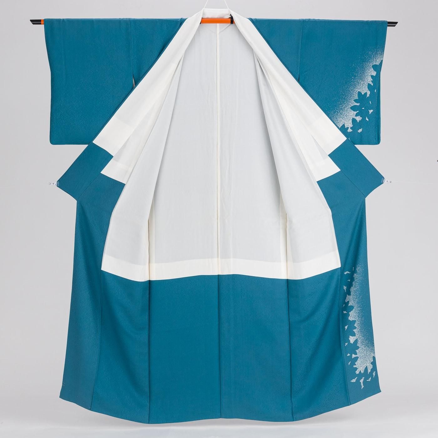 鮮やかなピーコックブルーの地に葉のシルエットとピンク色の実を描いた付下げです。