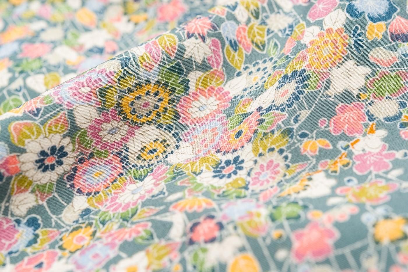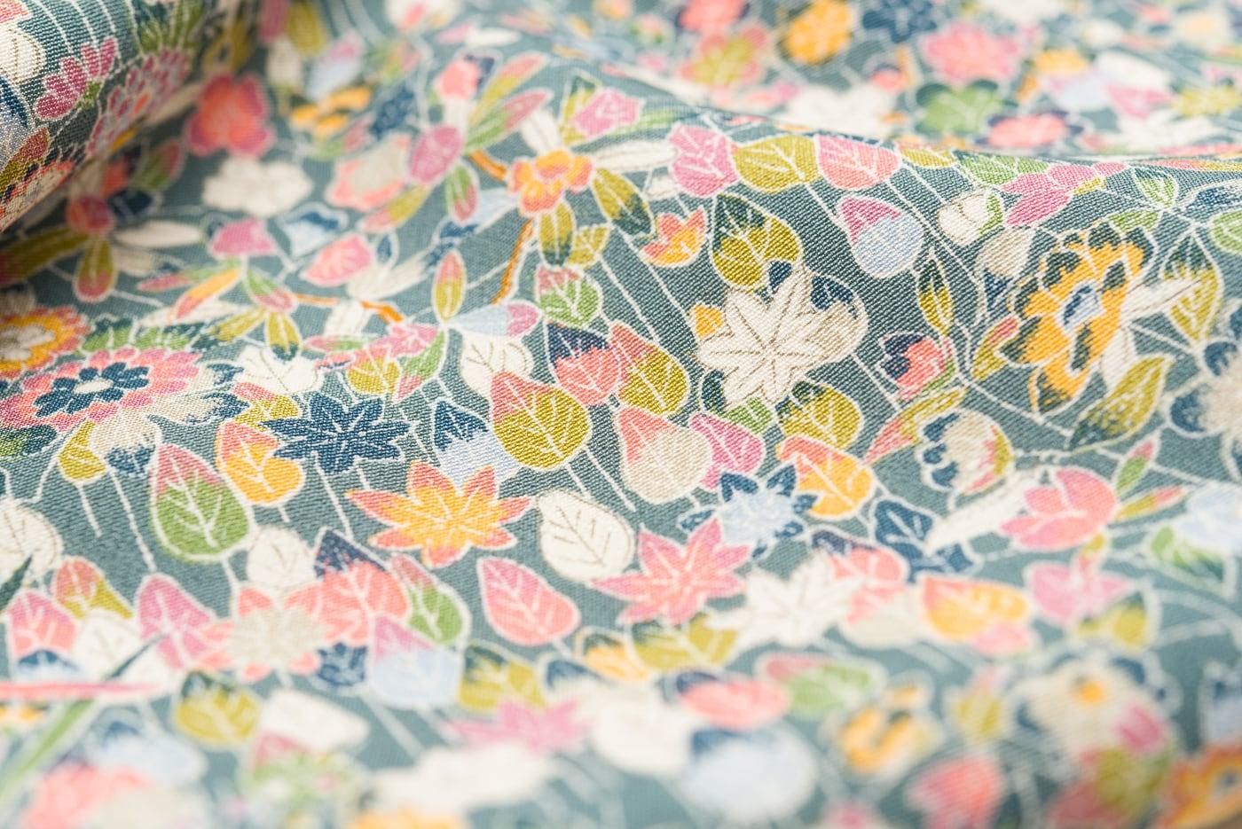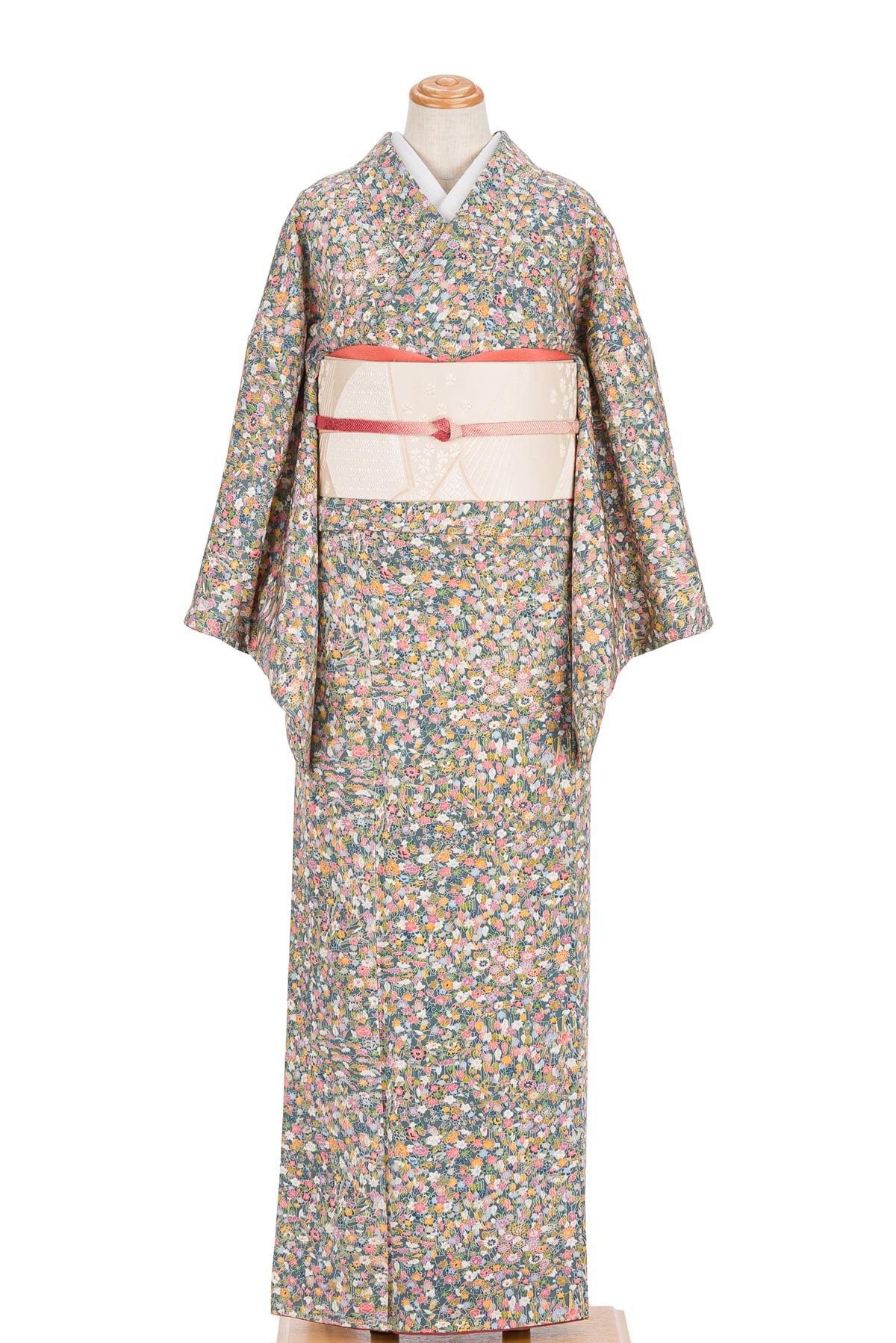 青緑色の地に小さな葉や花などを染めた小紋の着物です。
