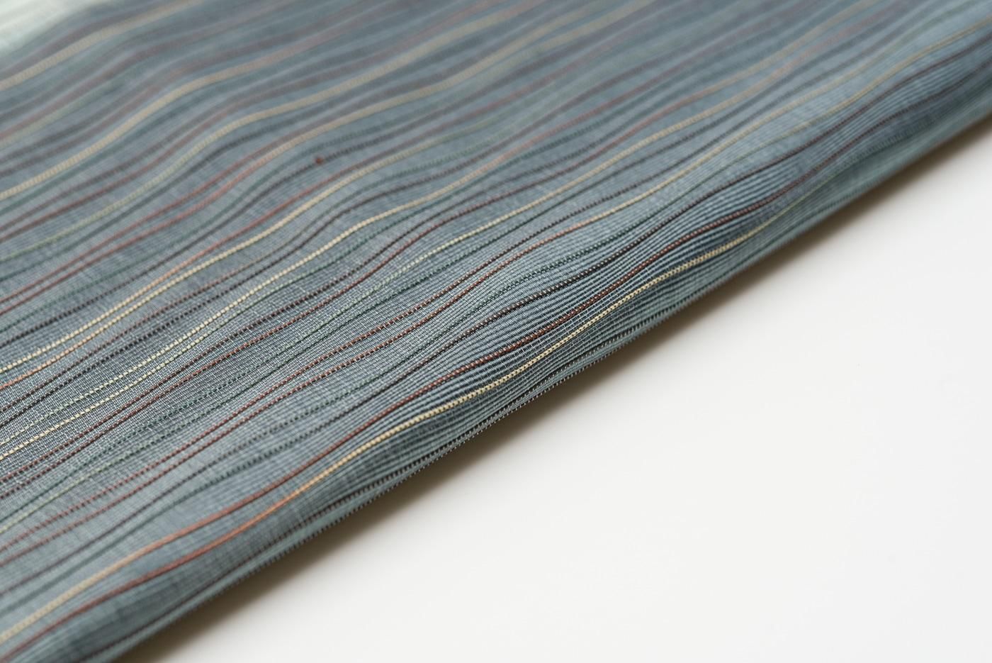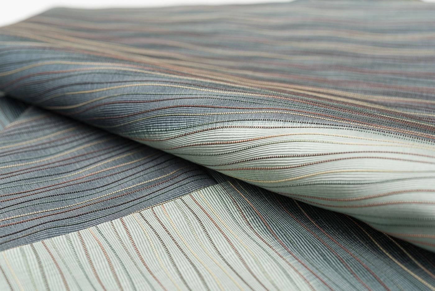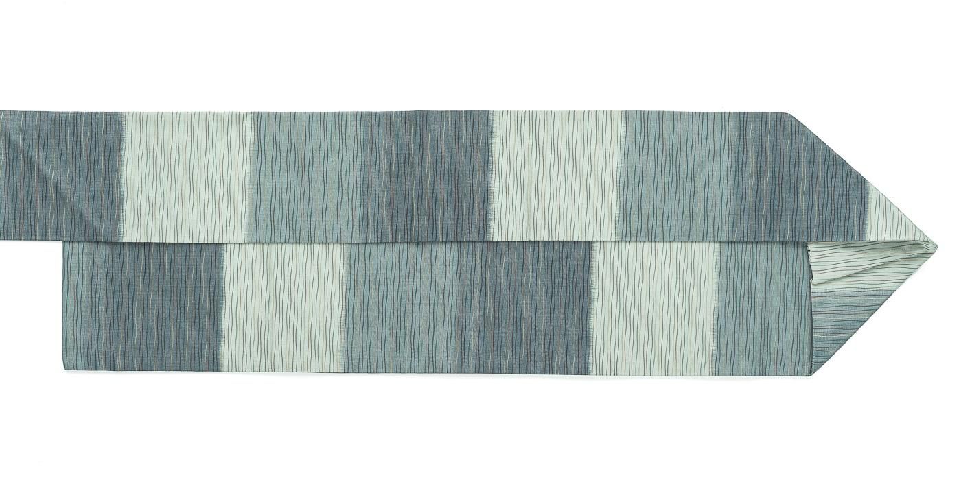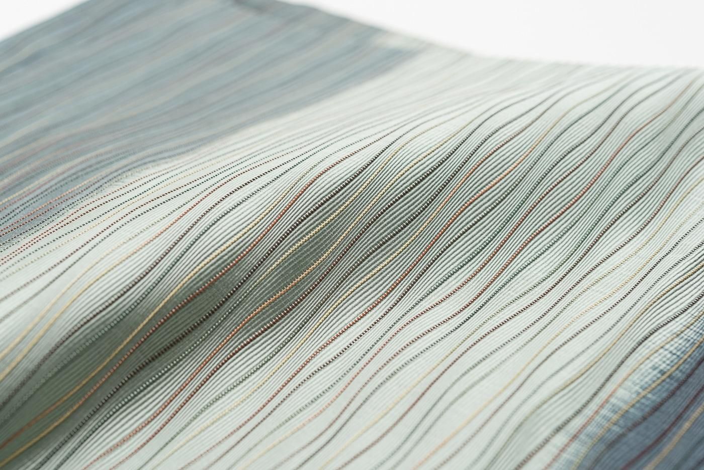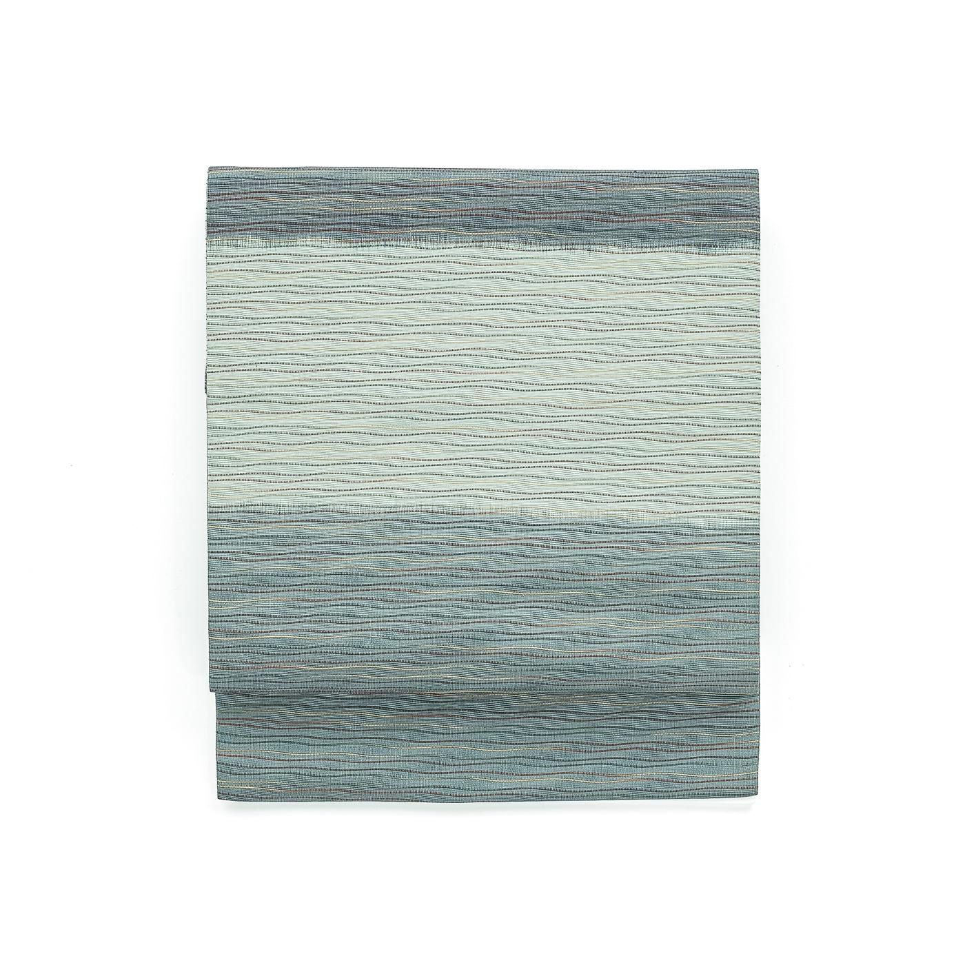 青緑系の横段に極細のよろけ縞を重ねた九寸名古屋帯です。