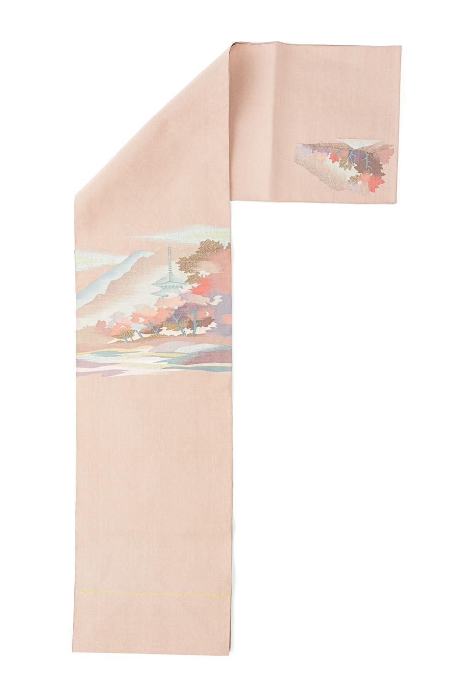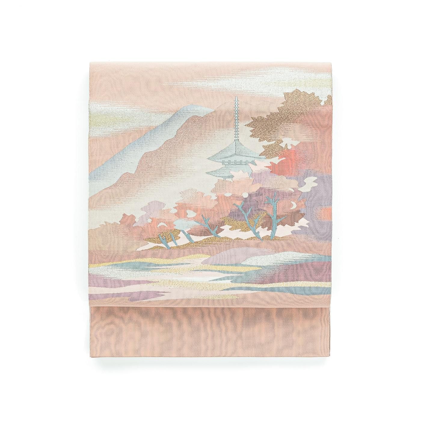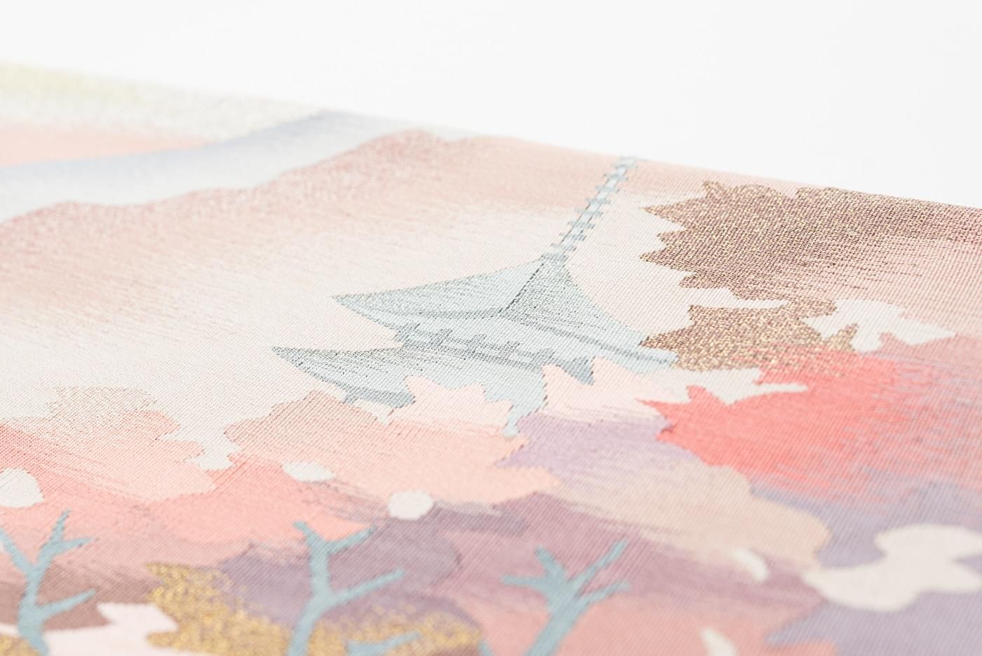 水柿色の地に山と寺塔を織り出した本綴れの八寸名古屋帯です。