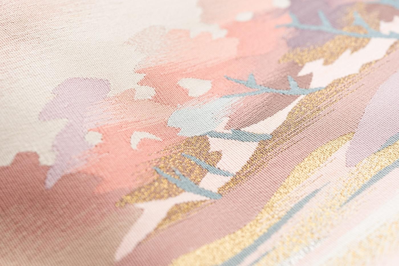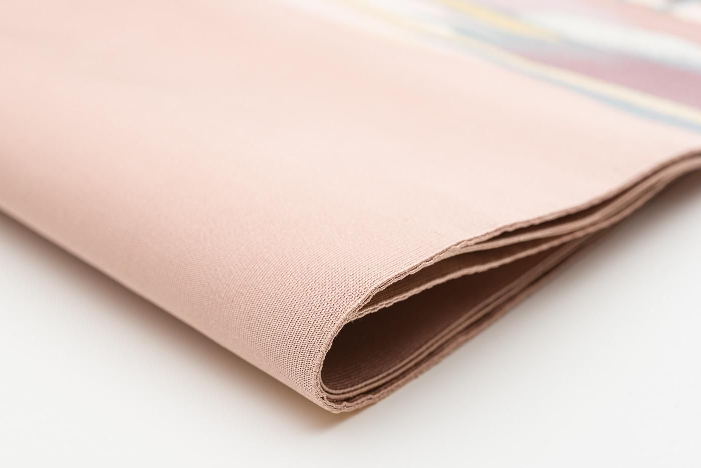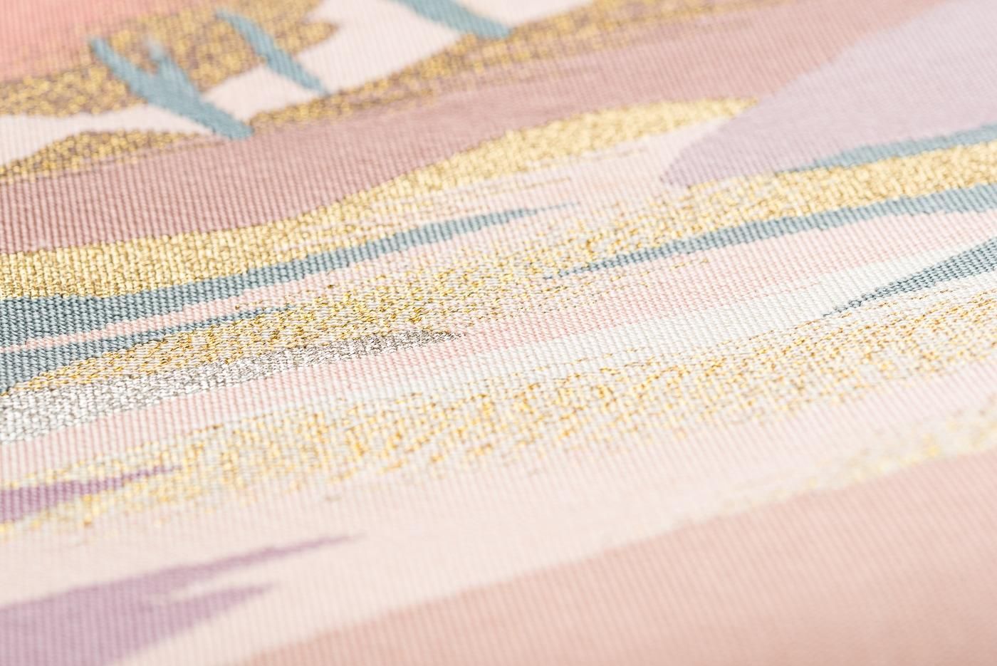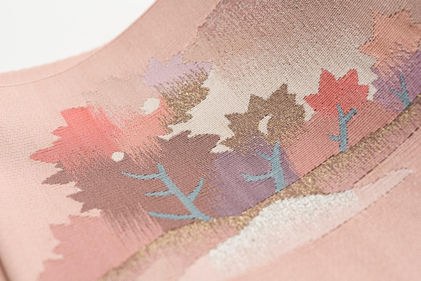 水柿色の地に山と寺塔を織り出した本綴れの八寸名古屋帯です。