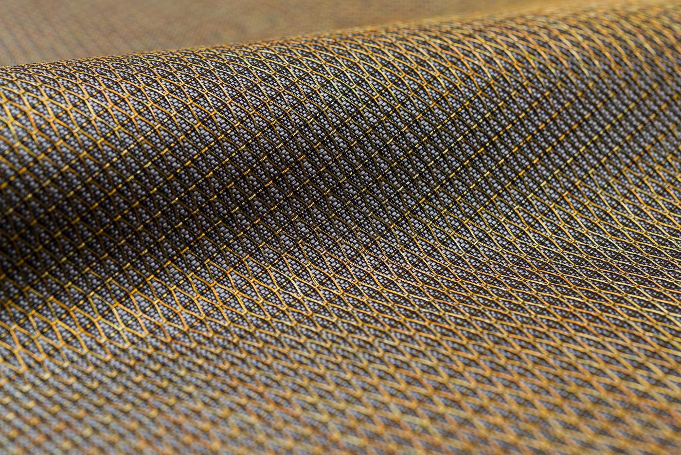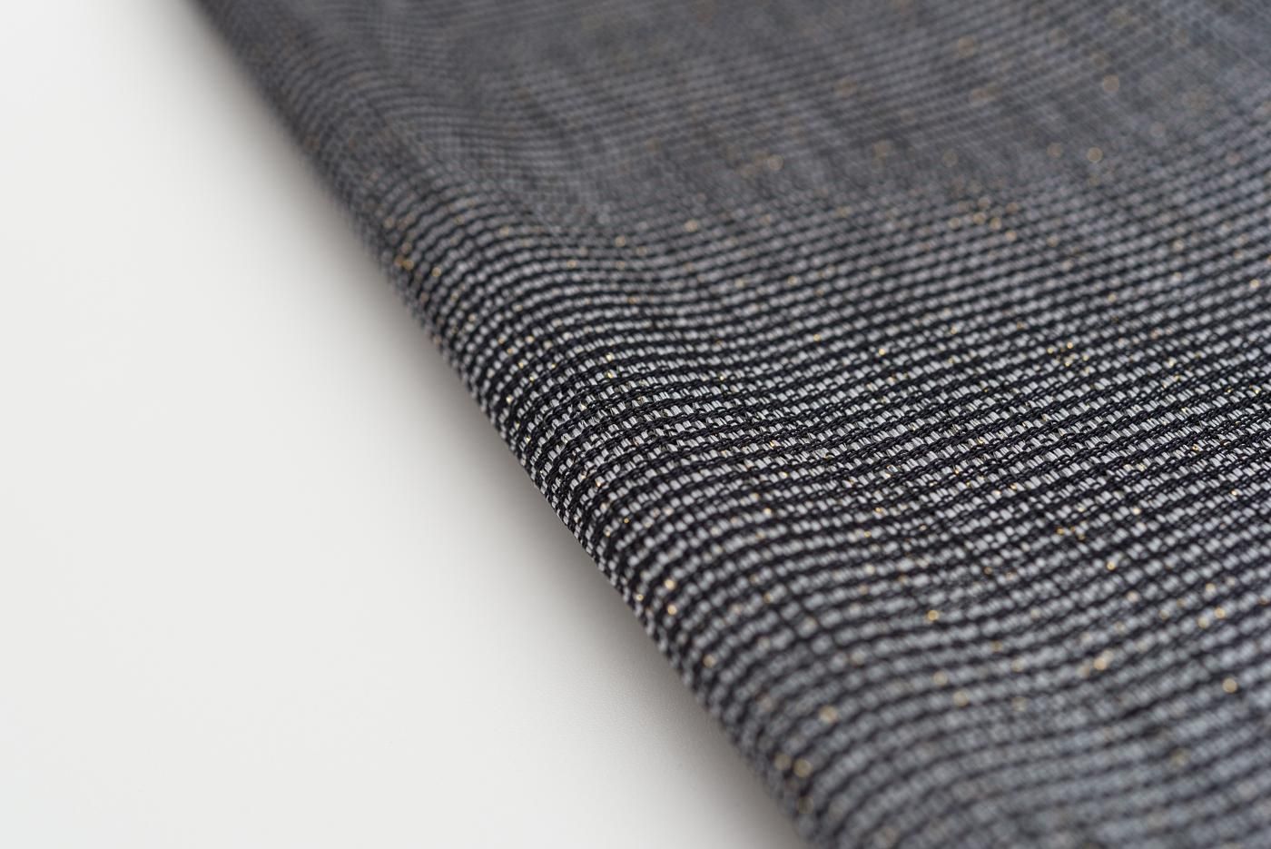 片面は黒やグレーを基調にしたボーダー柄、もう片面はシャンパンゴールドに細かな網目柄。