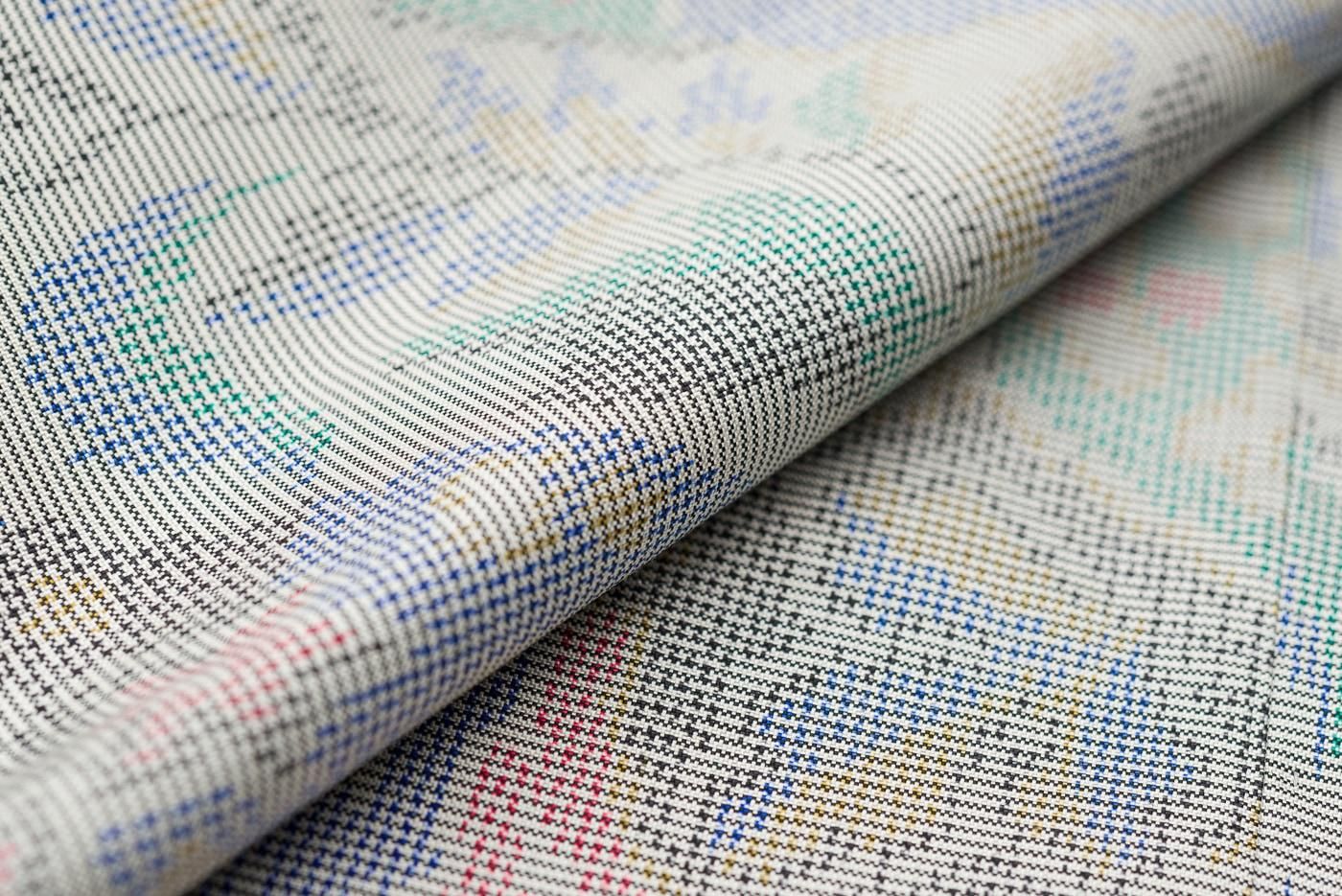 花絵札模様を織り出した白大島の着物です。