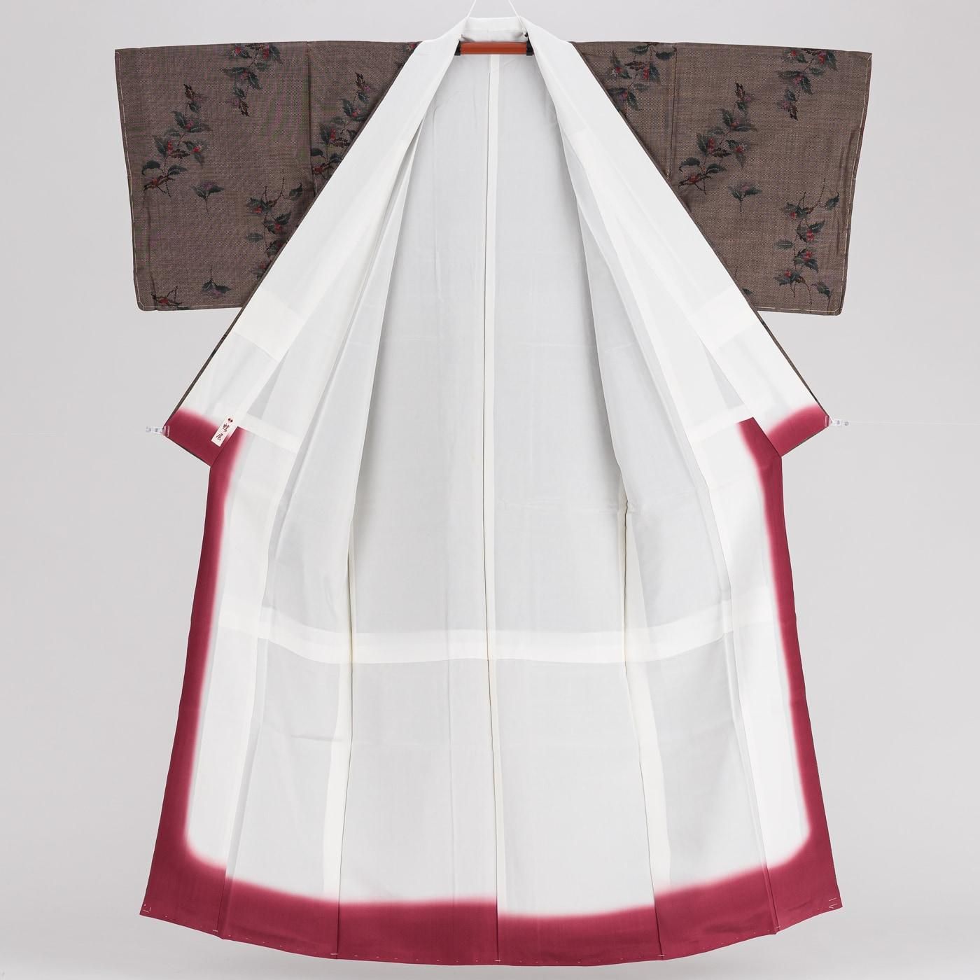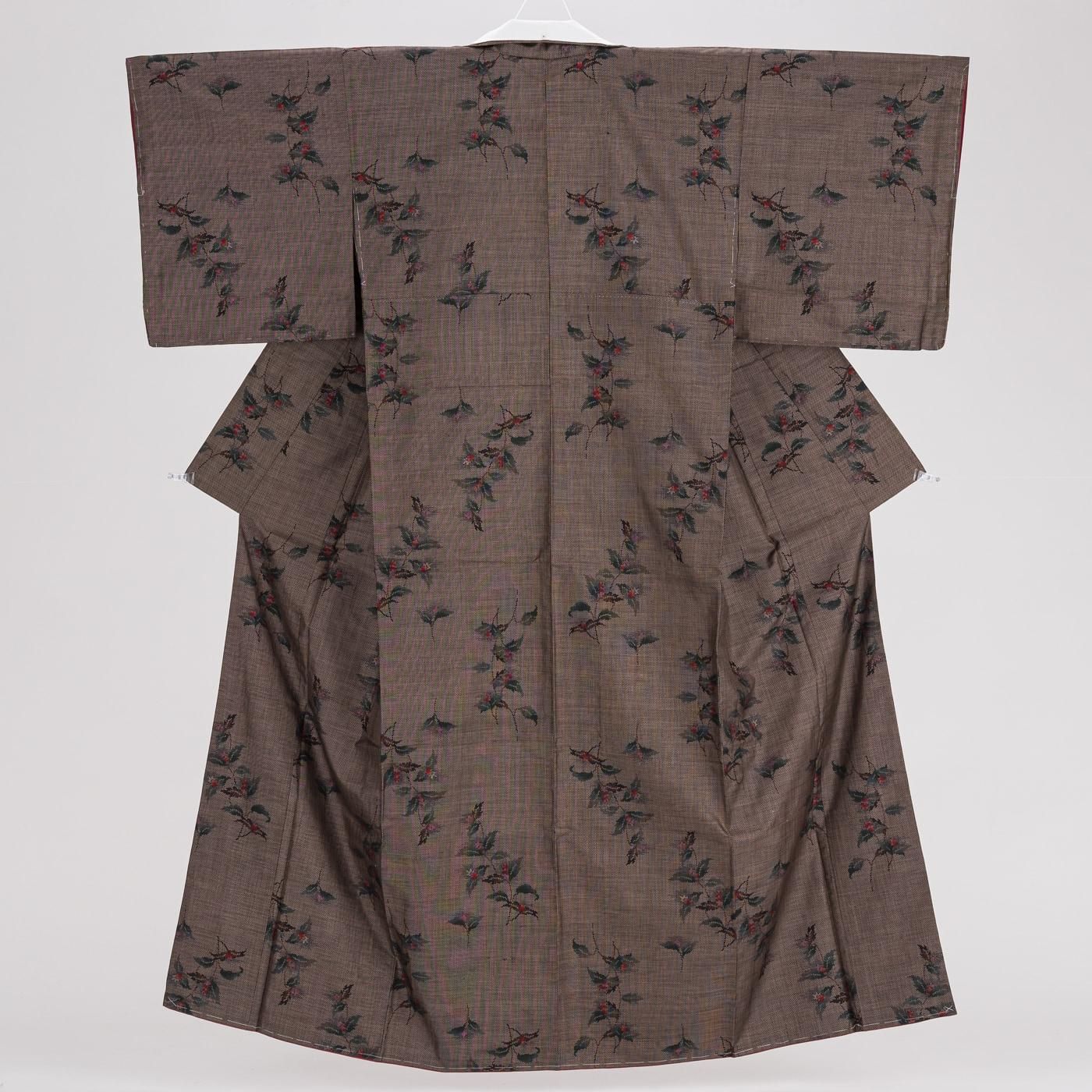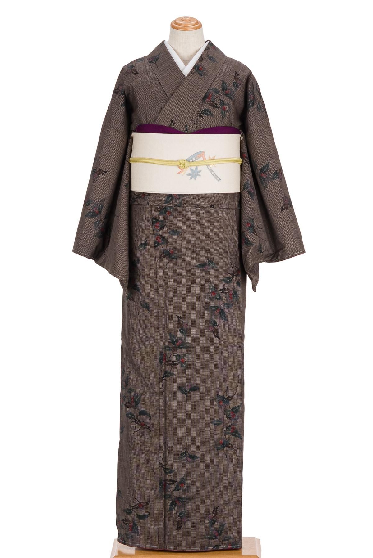 焦げ茶の地に枝花模様を織り出した大島紬の着物です。