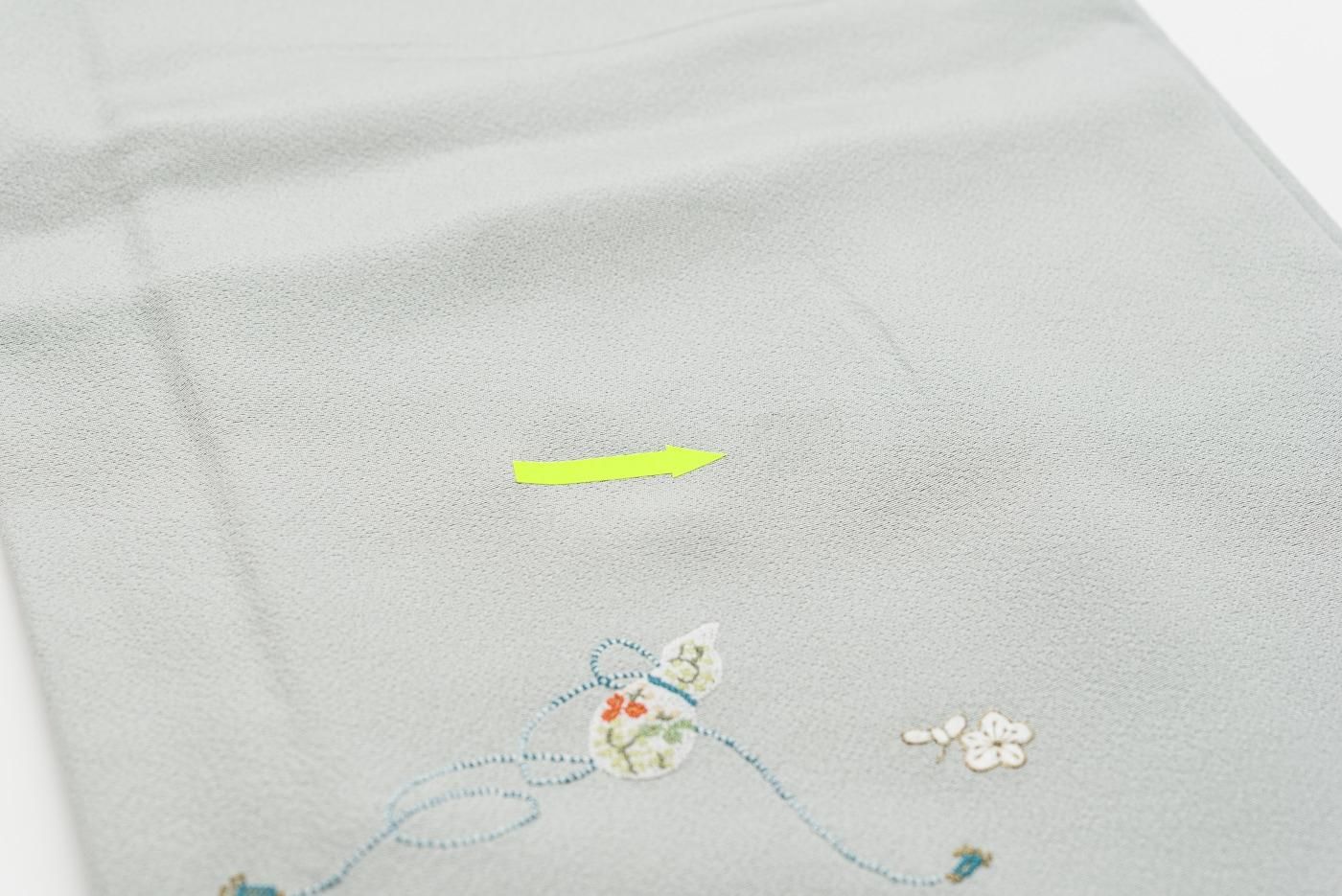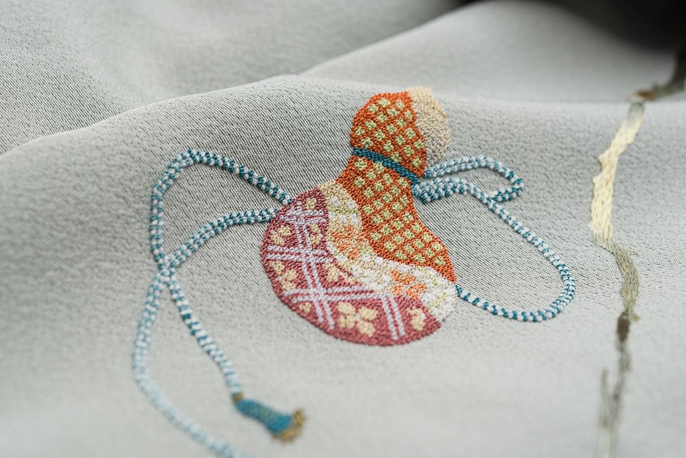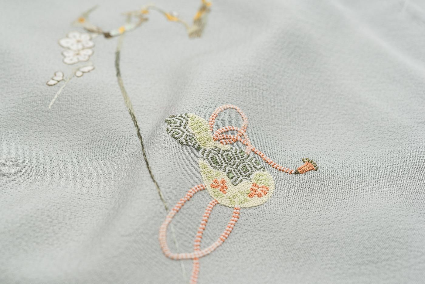 薄水浅葱色の地に枝梅と瓢箪を刺繍した訪問着です。