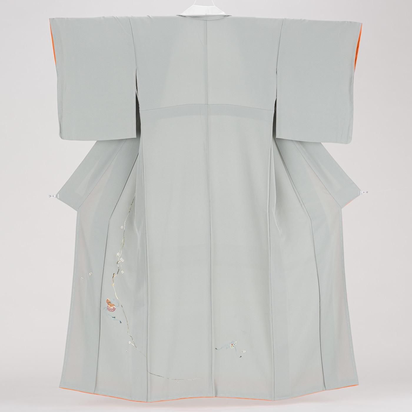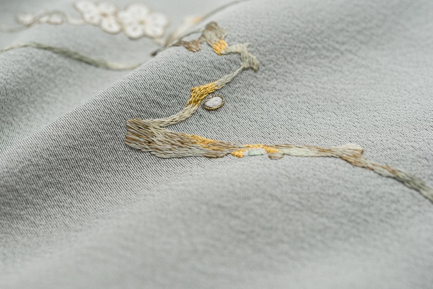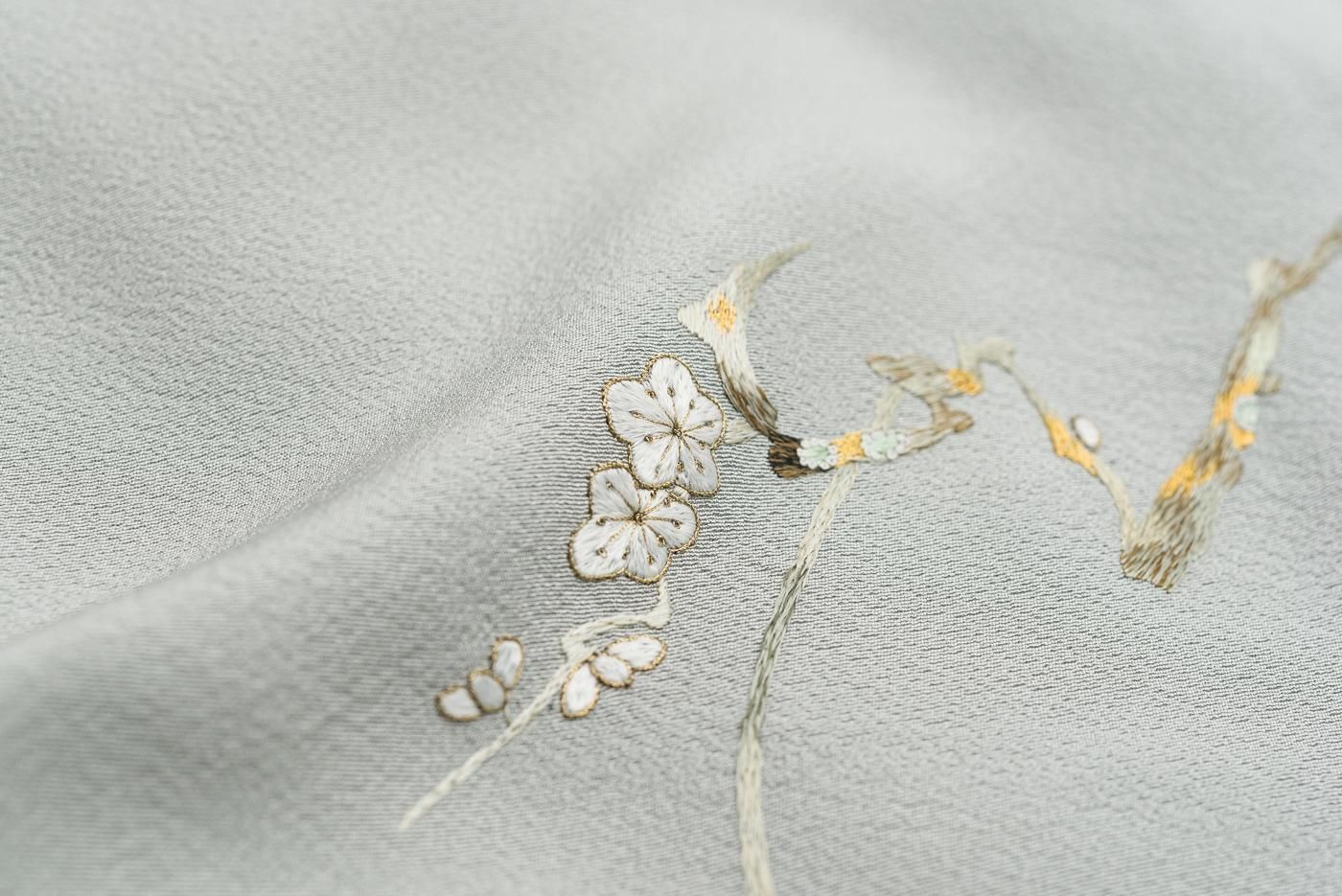 薄水浅葱色の地に枝梅と瓢箪を刺繍した訪問着です。