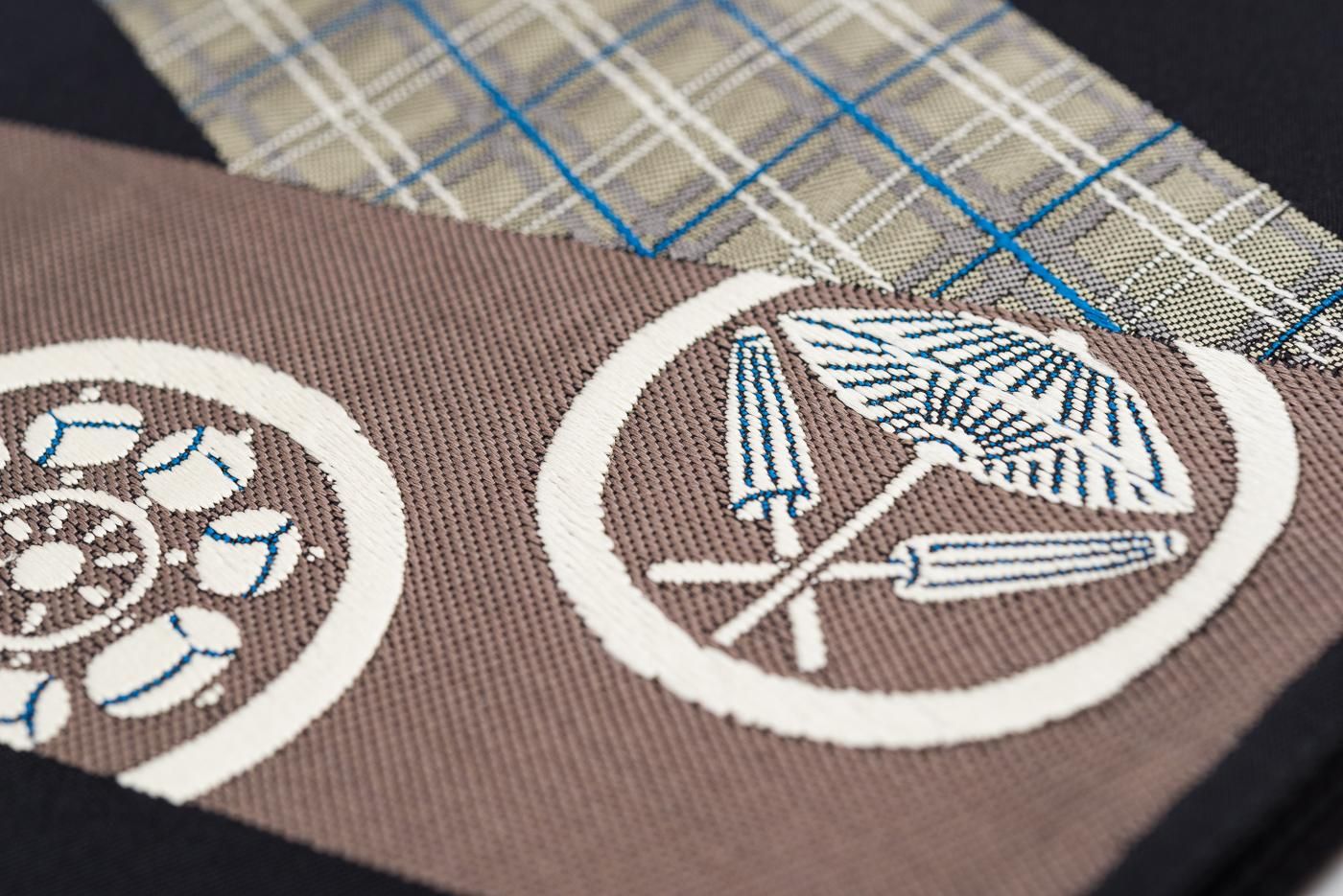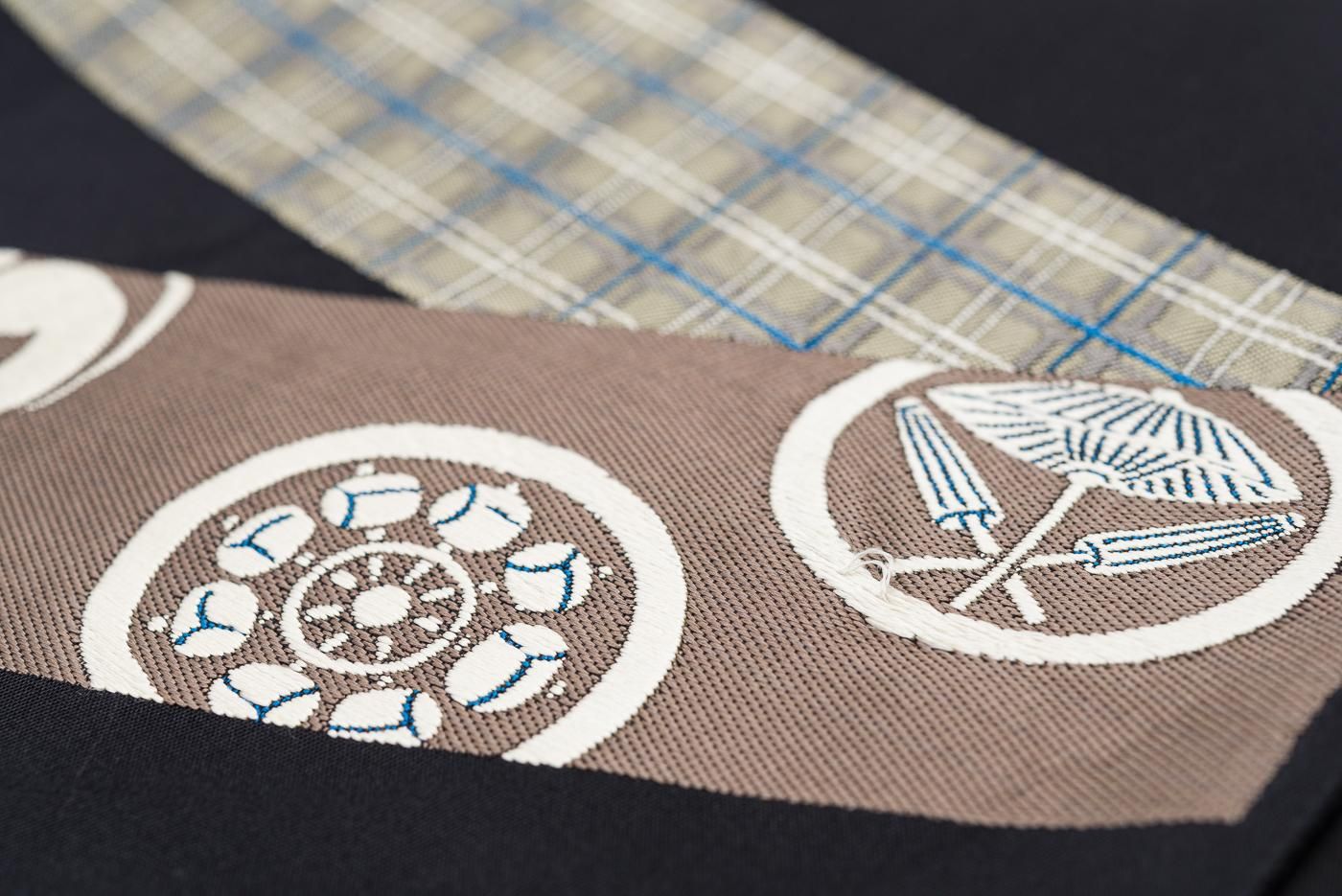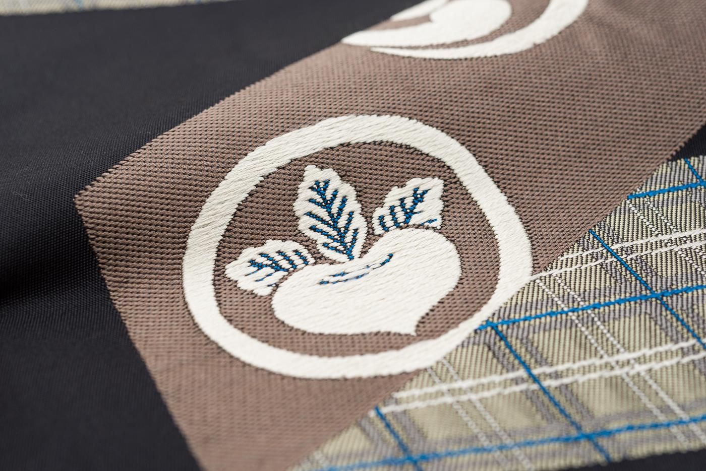 鬘帯に小槌、蕪、三階松、石臼などの丸紋を添えた洒落袋帯です。