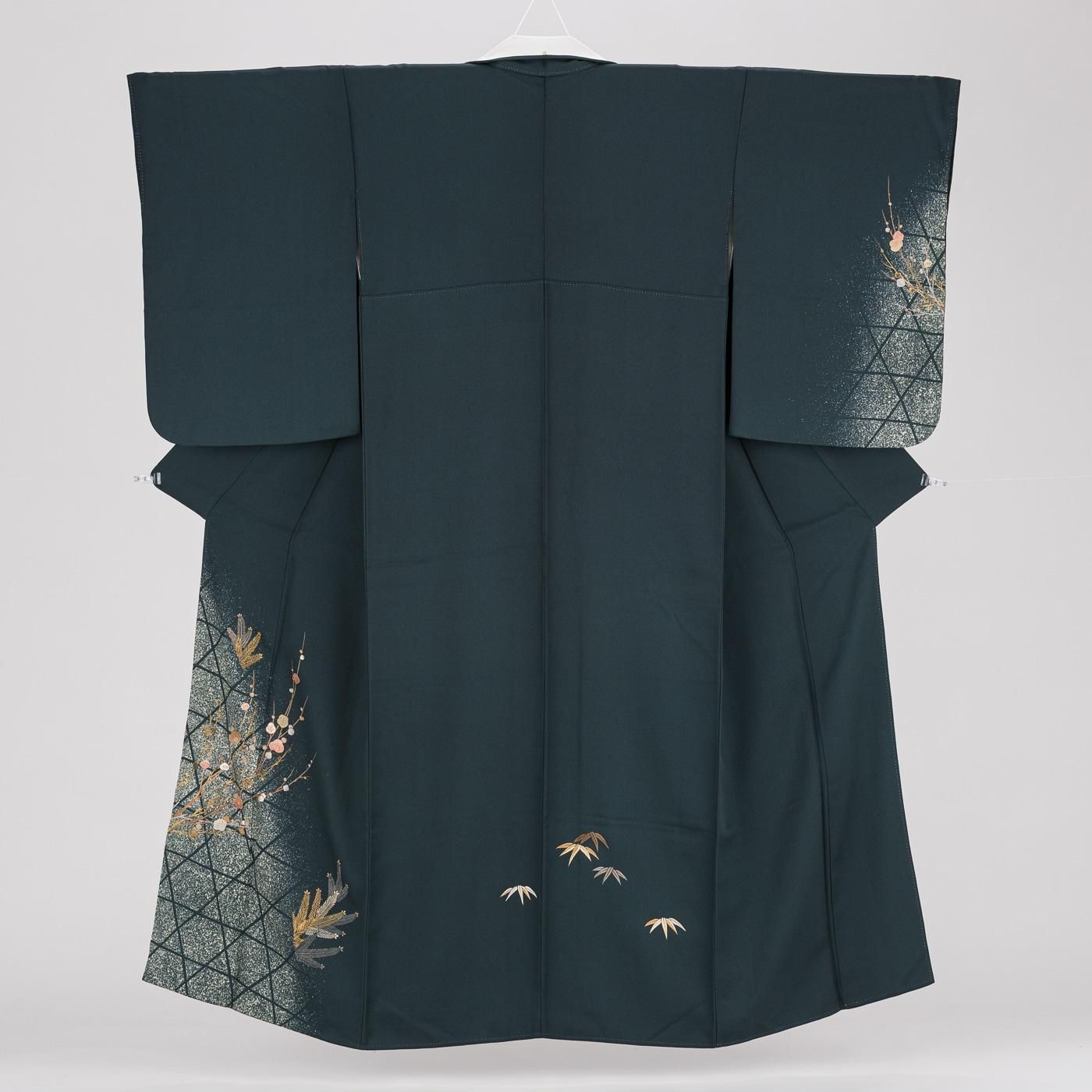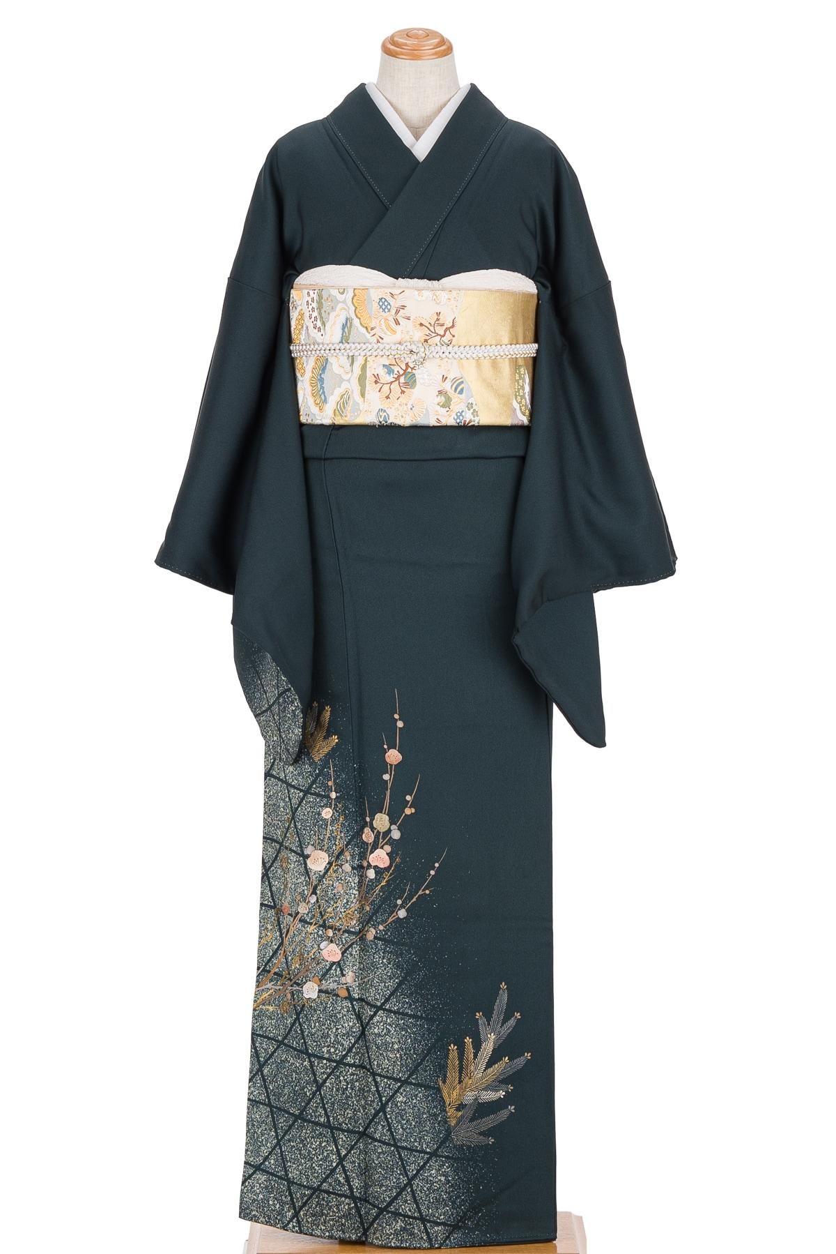 暗い深緑色の地に松竹梅を描いた付下げ訪問着です。