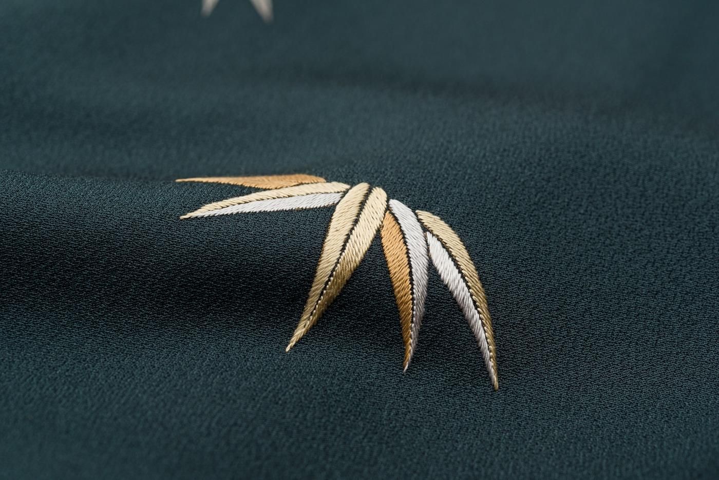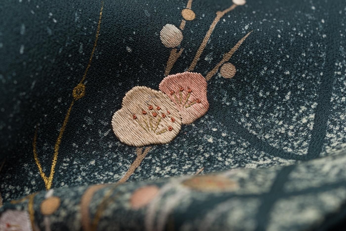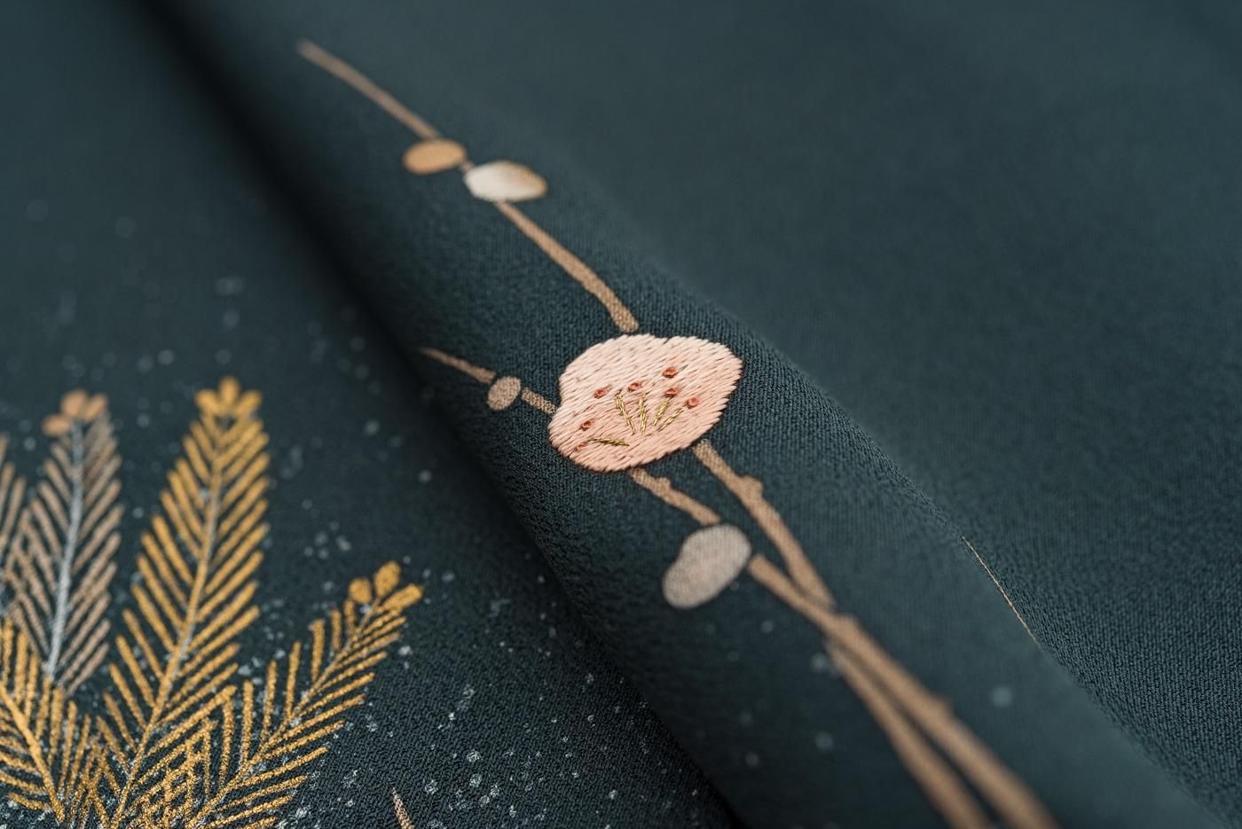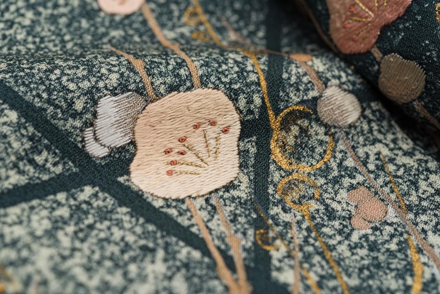 一部には刺繍も施されており落ち着いた色柄ながらさりげない華やかさも感じさせます。