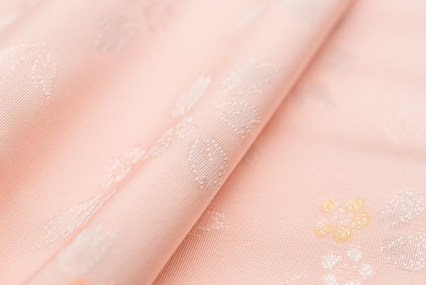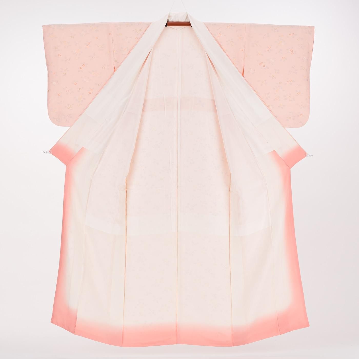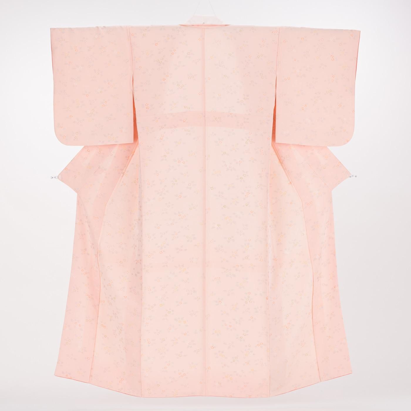 パウダリーなピンク色の地に地紋起こしの小花を染めた小紋の着物です。