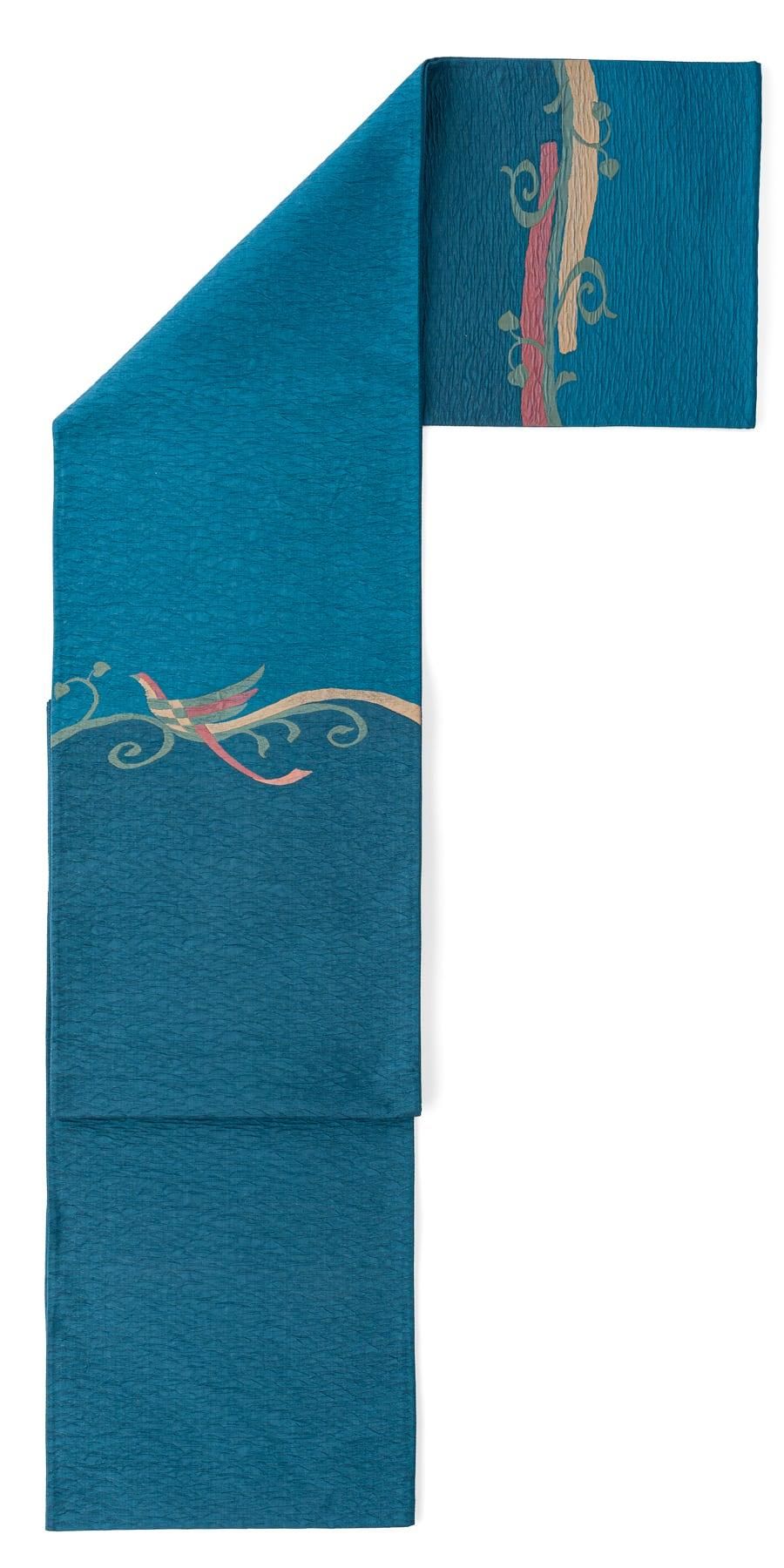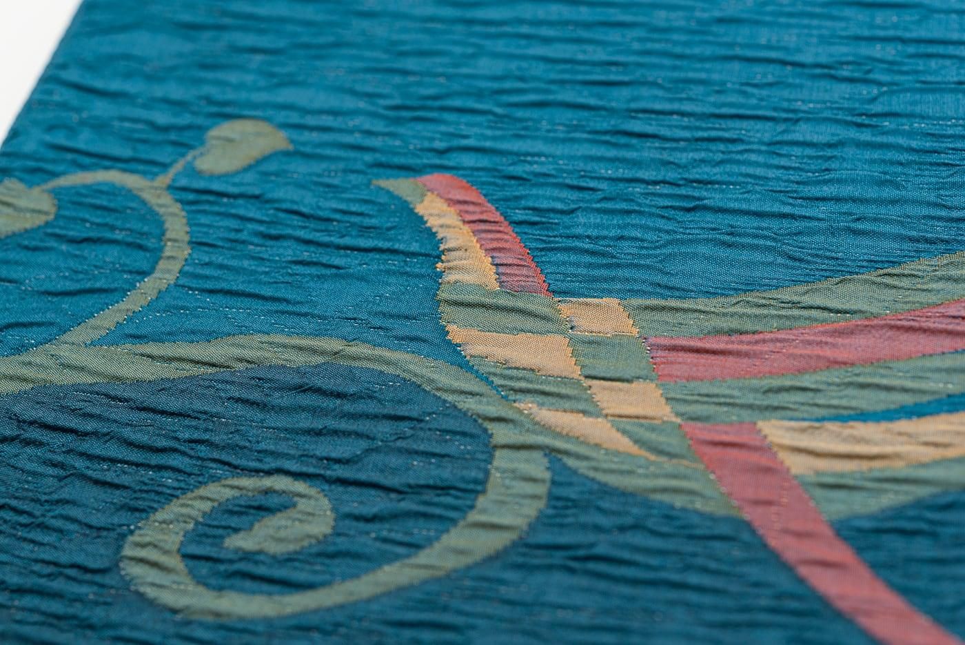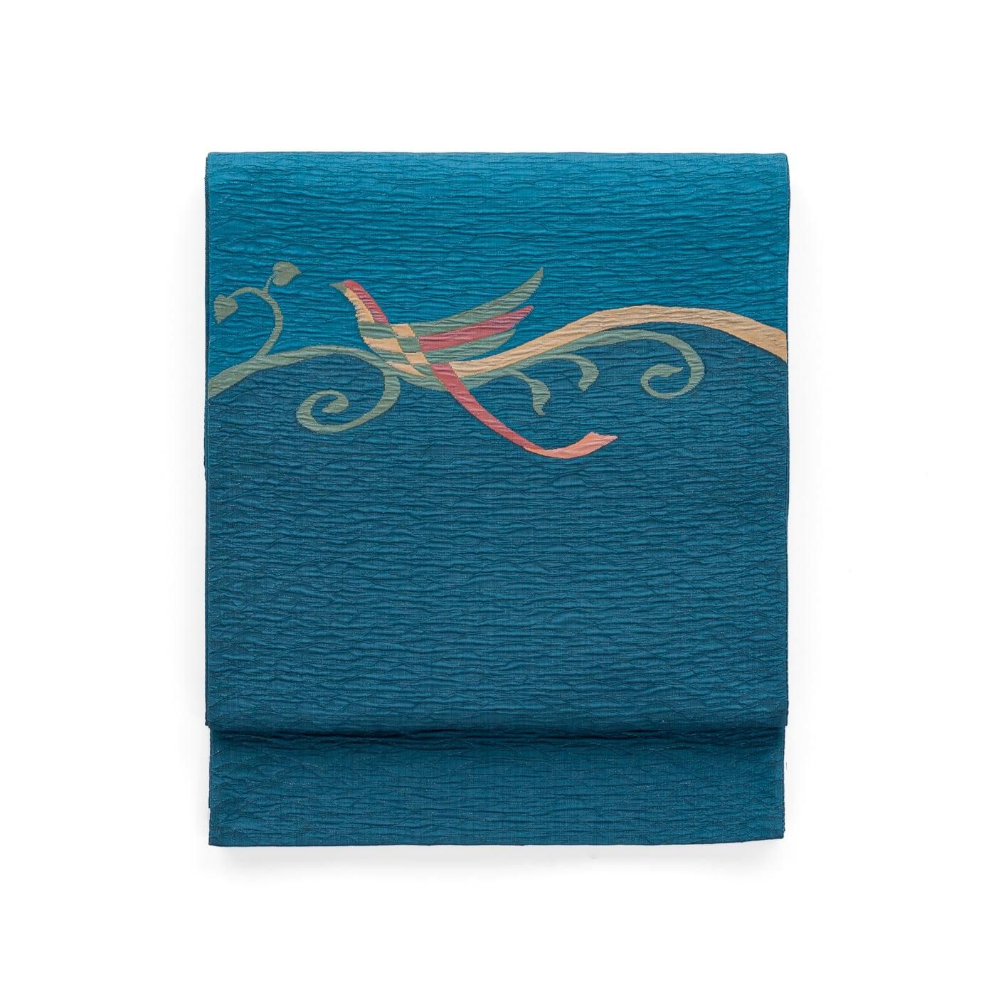 鮮やかなブルーの地に一羽の鳥を染めたお太鼓柄の洒落袋帯です。