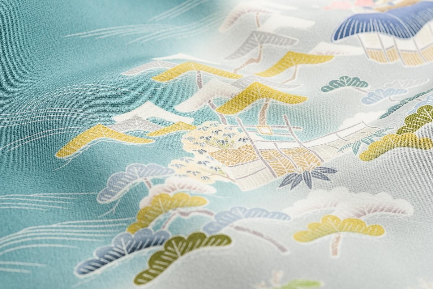 すっきりとした青緑色の地に茶屋辻模様を手描きした訪問着です。