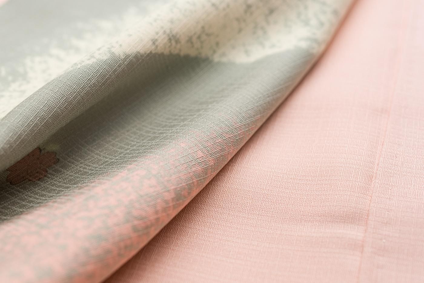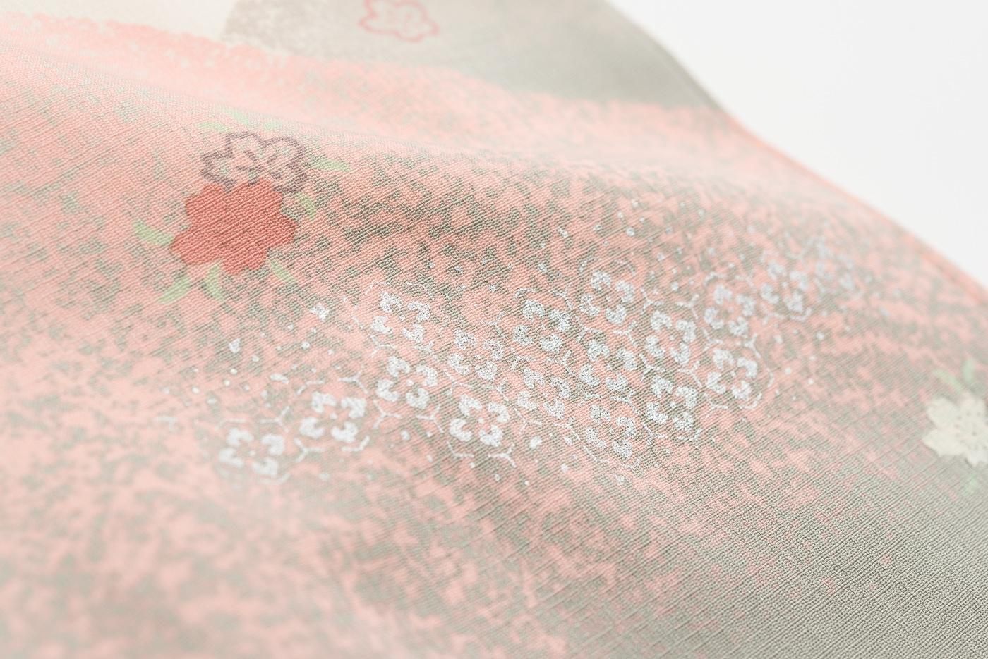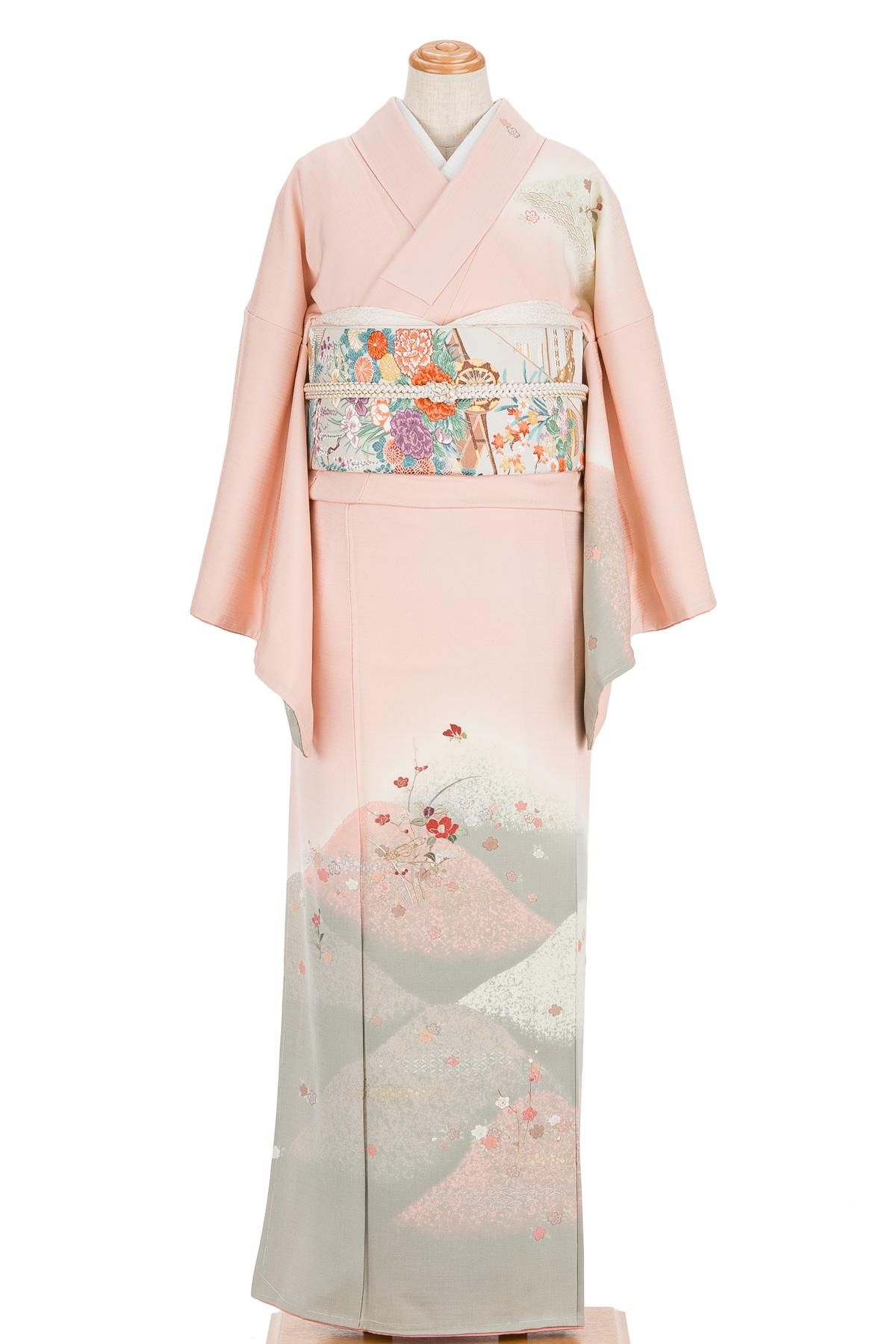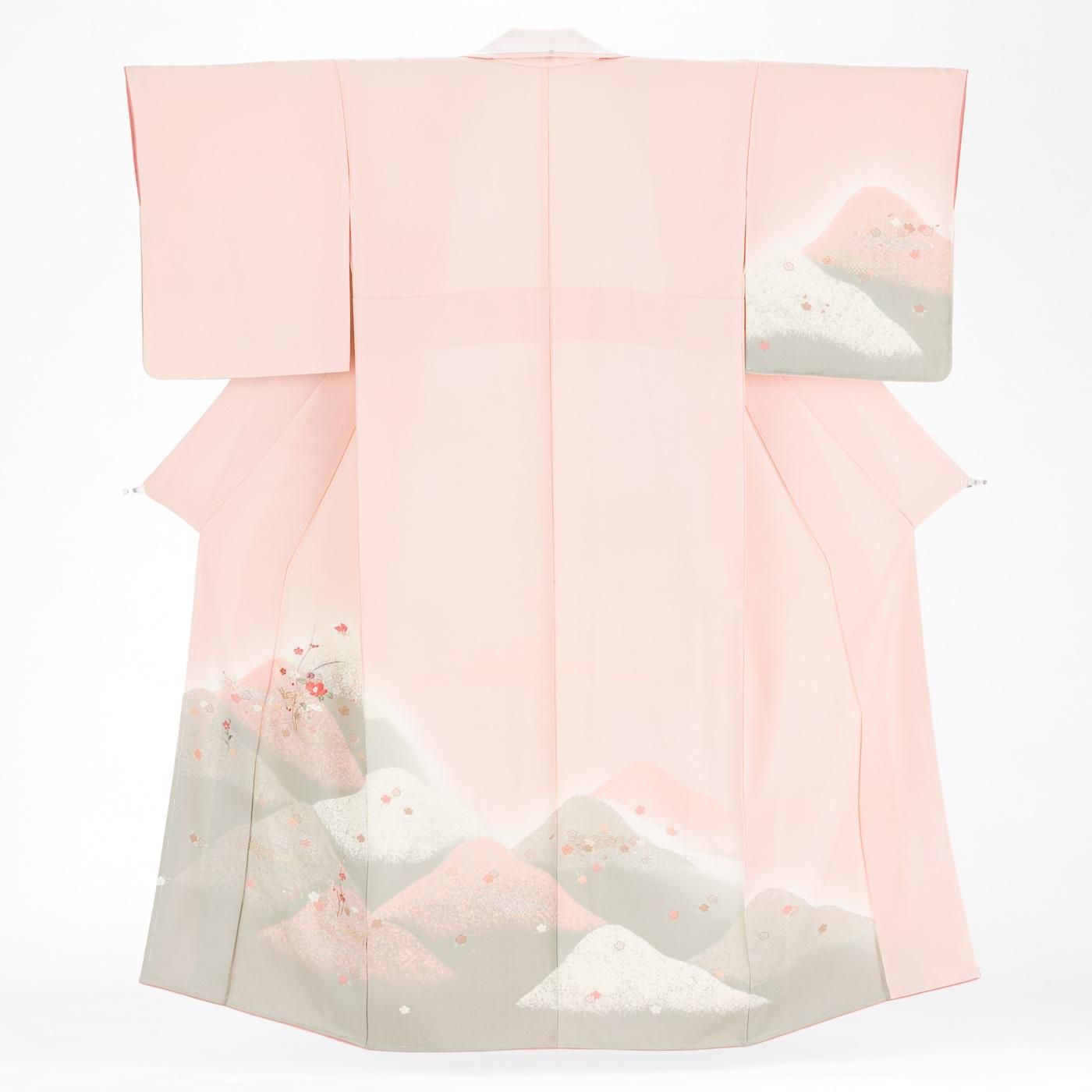 白、グレー、桃色の遠山に愛らしい花の刺繍を添えた訪問着です。