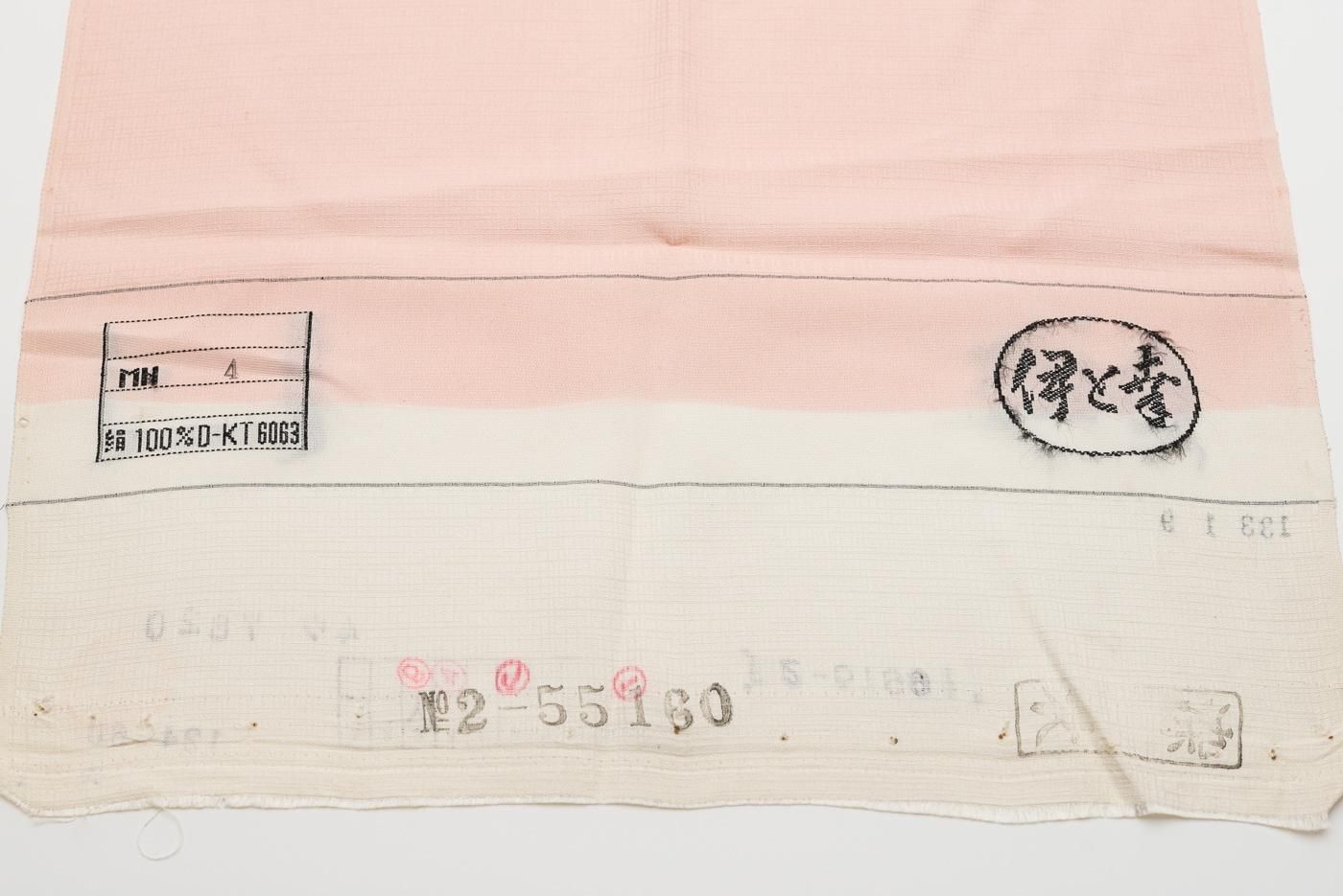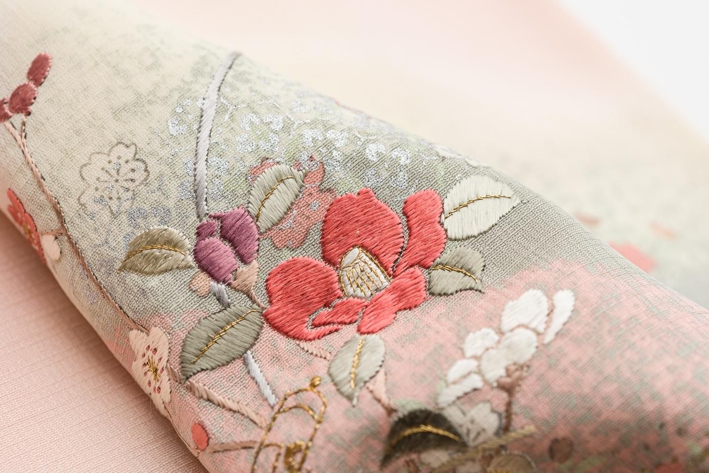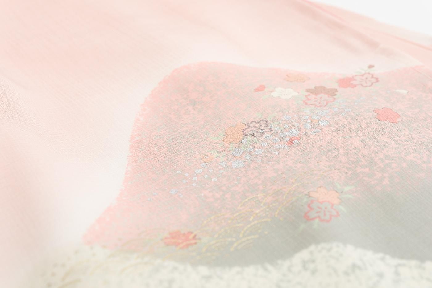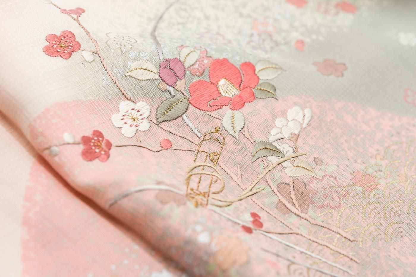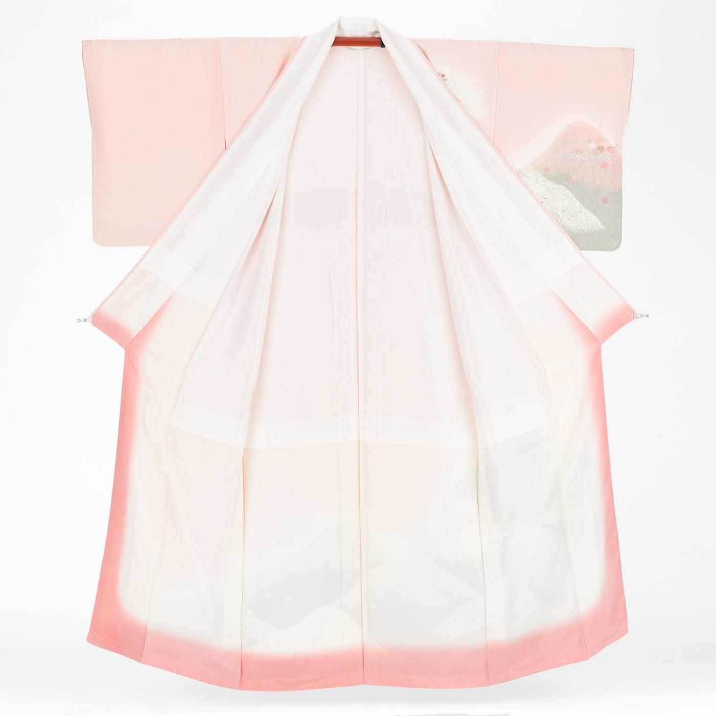 白、グレー、桃色の遠山に愛らしい花の刺繍を添えた訪問着です。