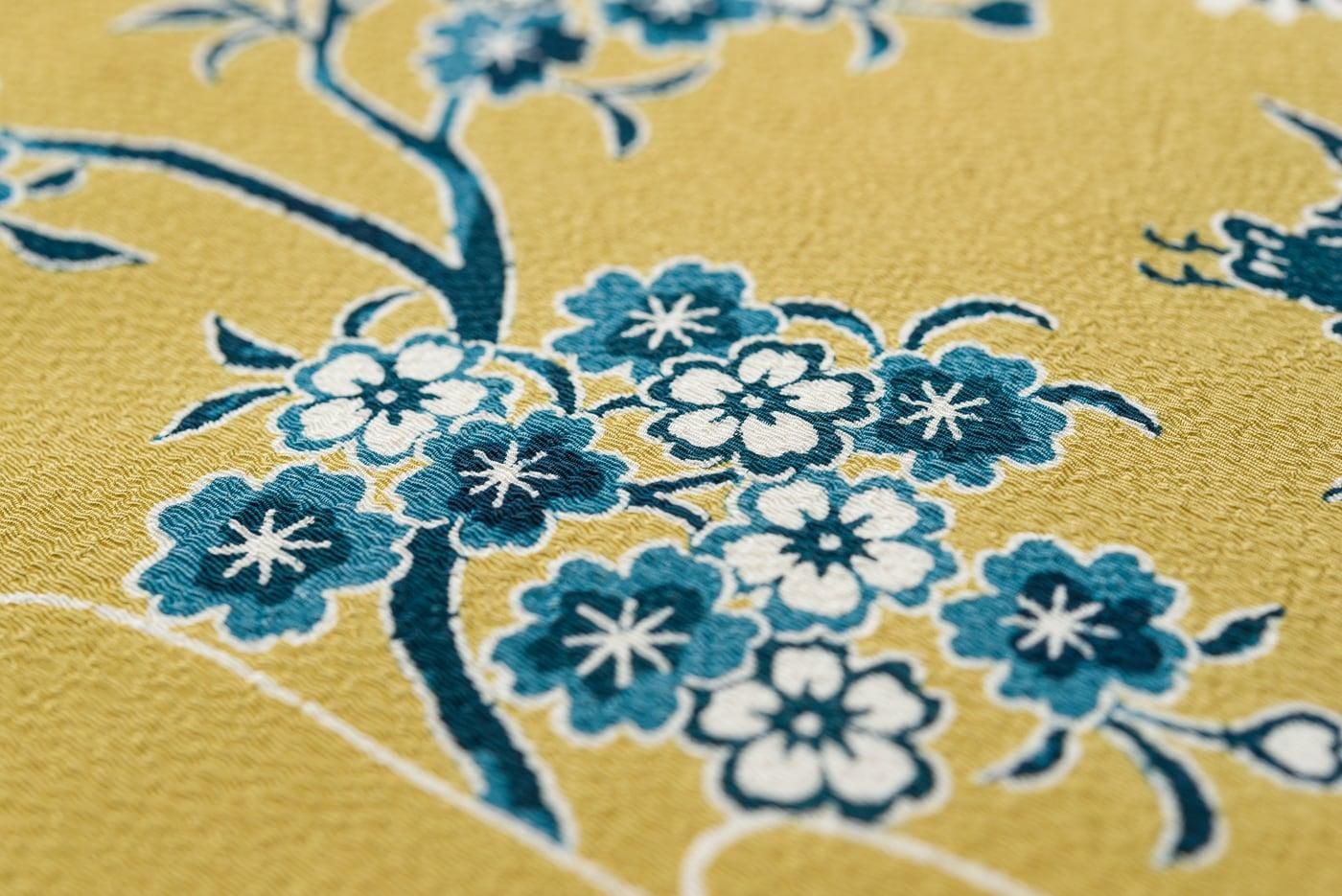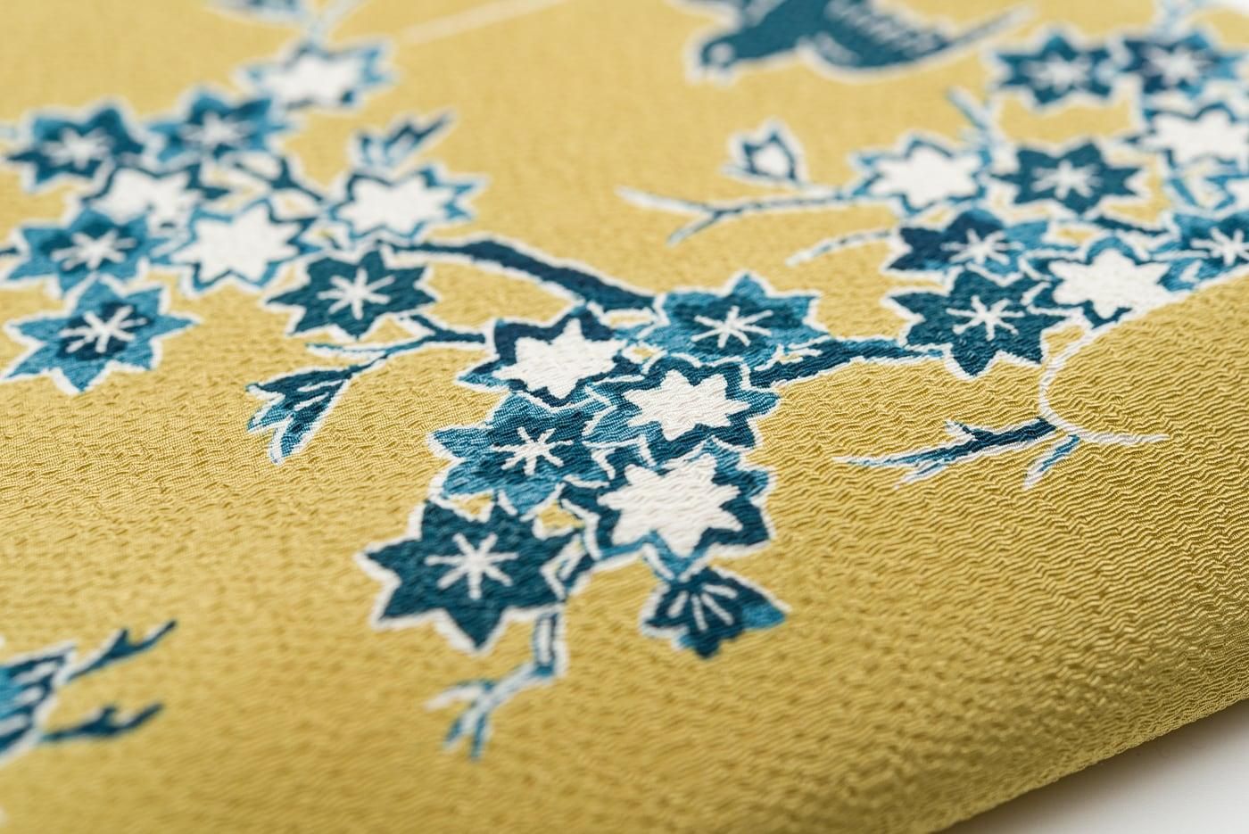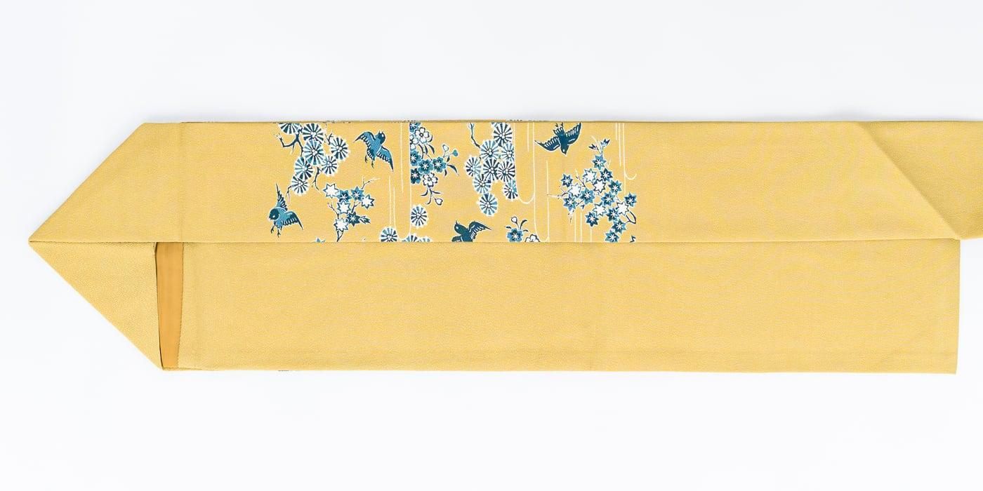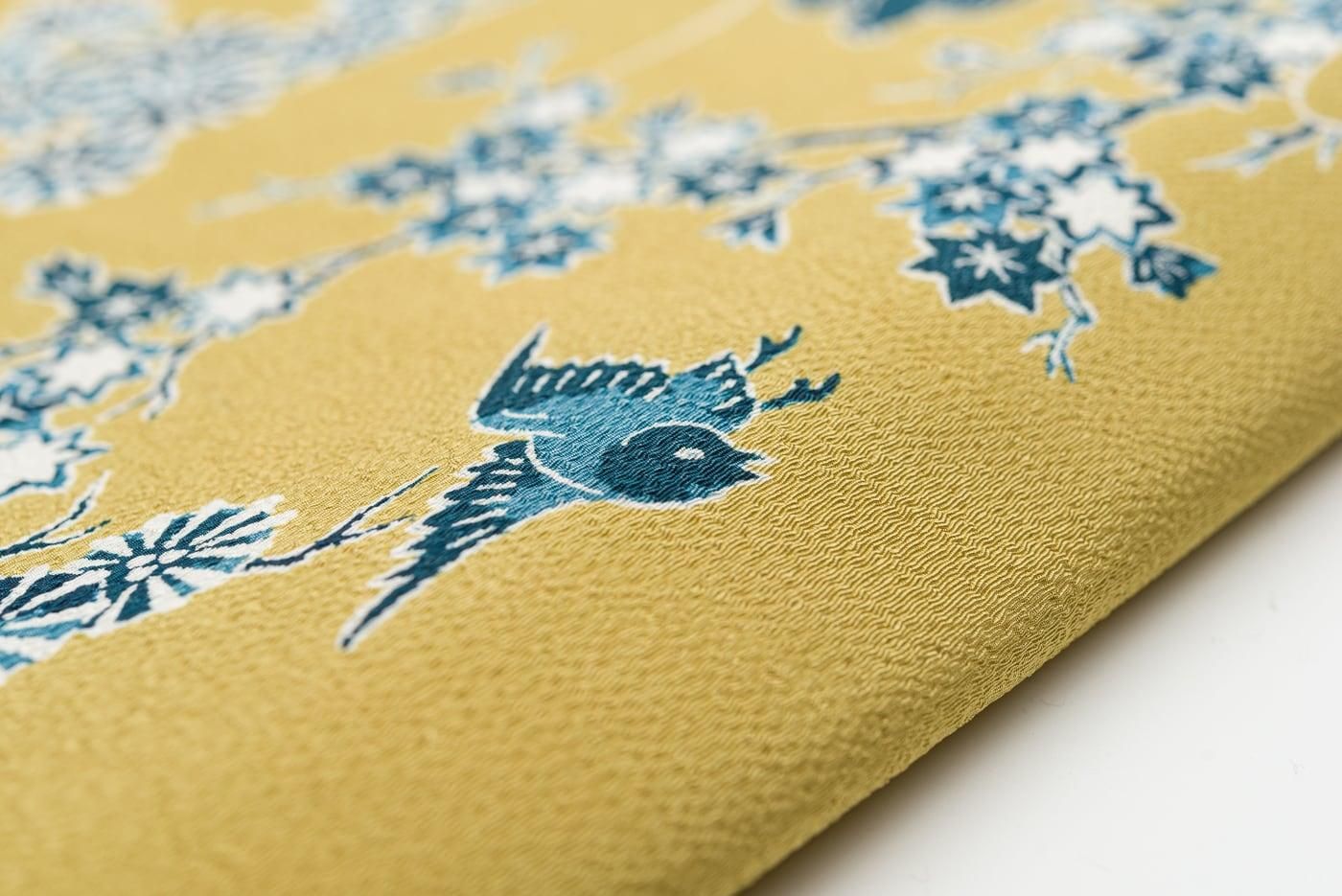 桜、楓、松と小鳥を染めた縮緬地の九寸名古屋帯です。