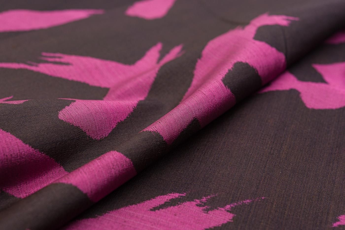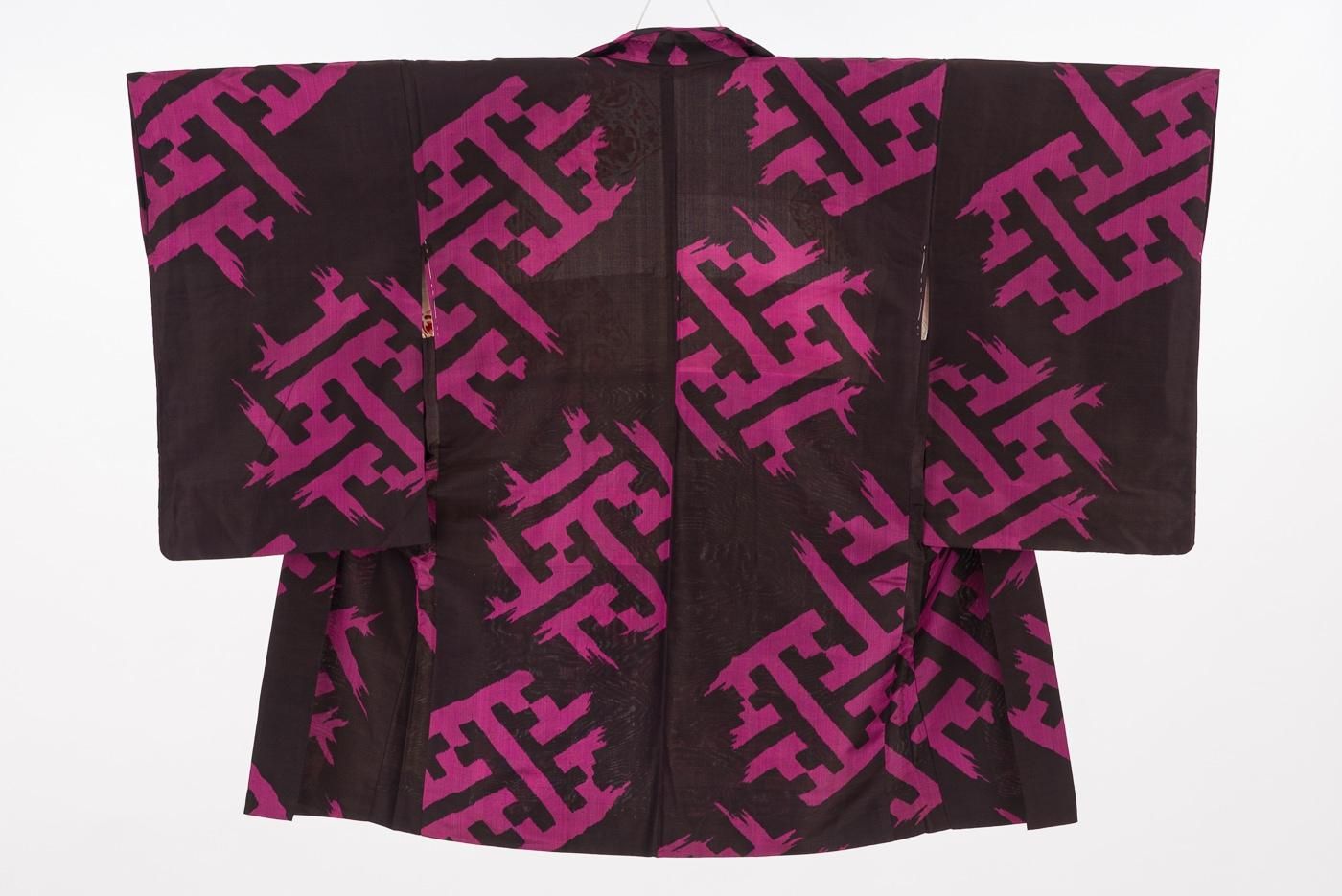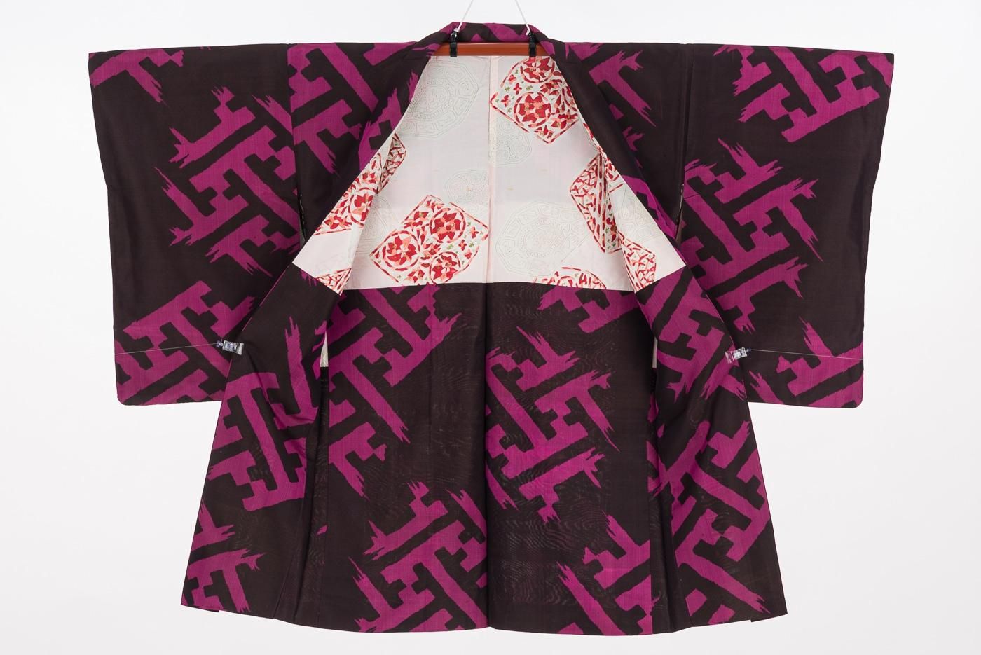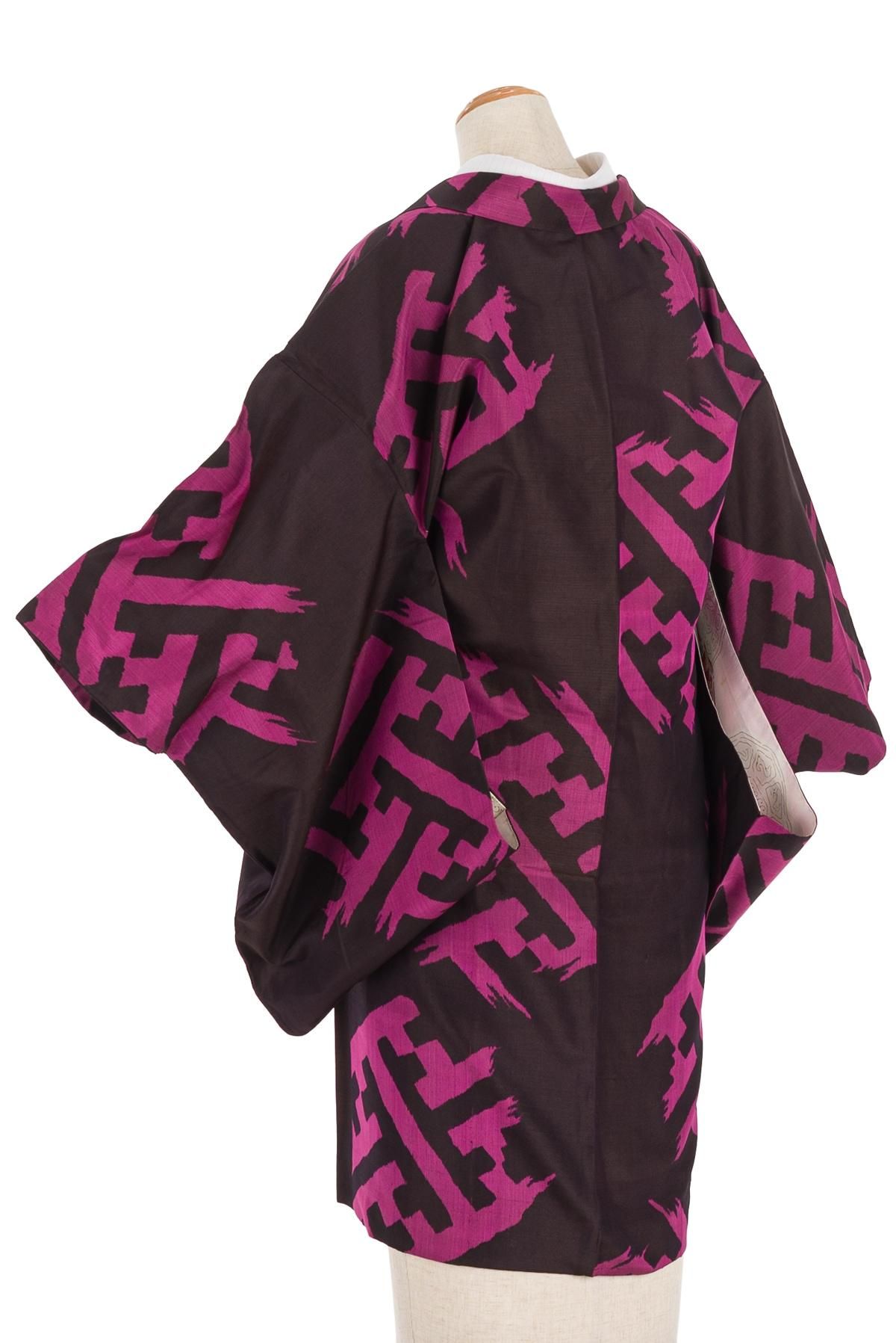 黒地にヴィヴィッドなピンクで紗綾型を織り出したアンティーク銘仙の長羽織です。