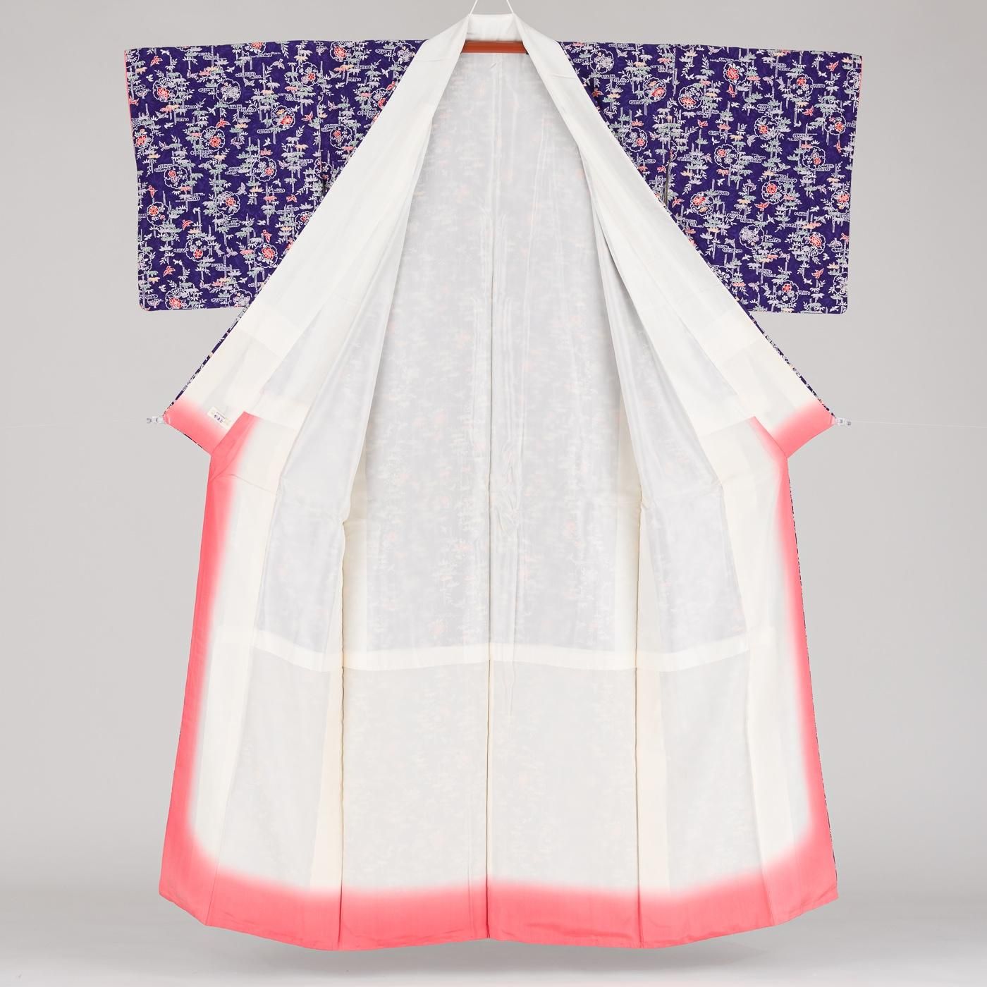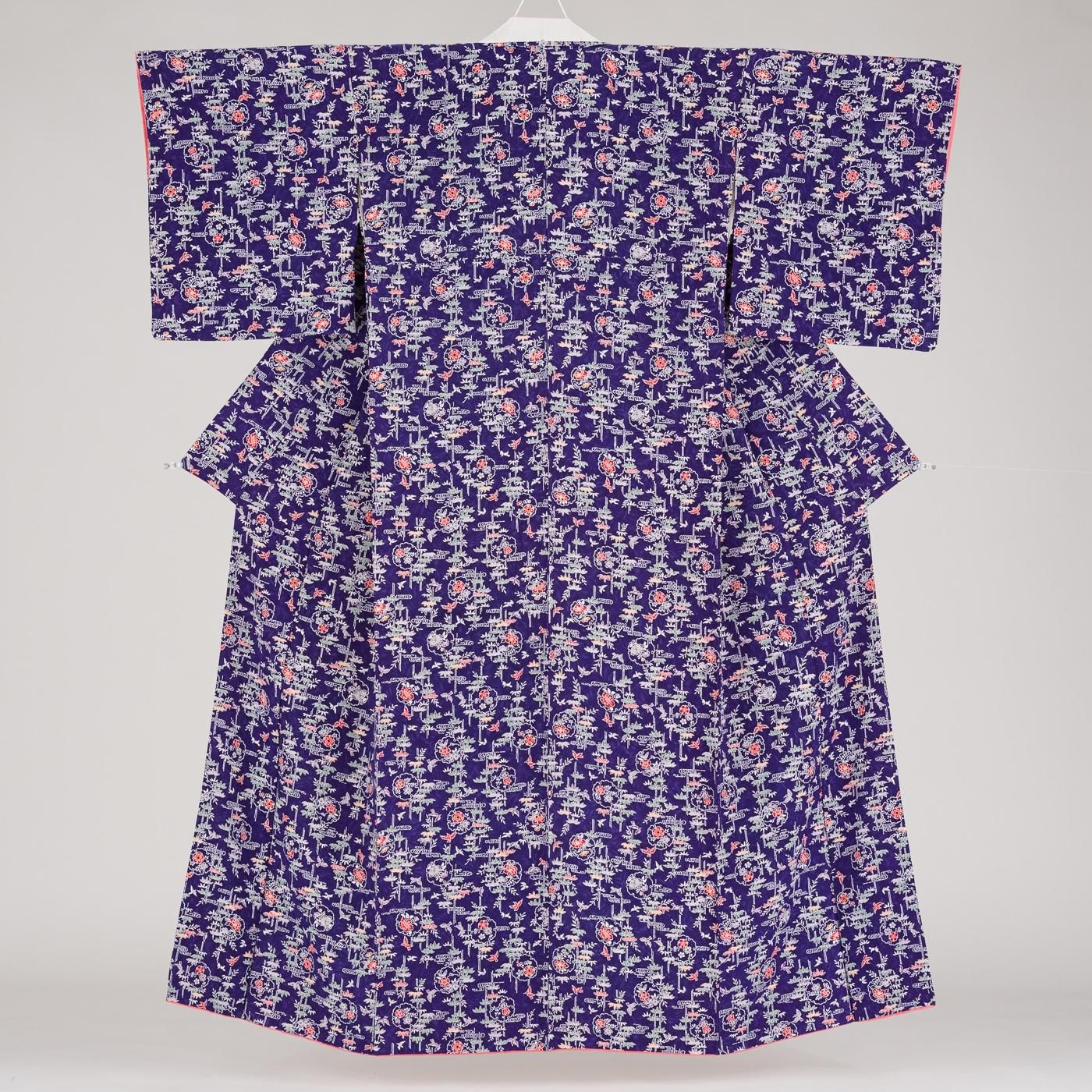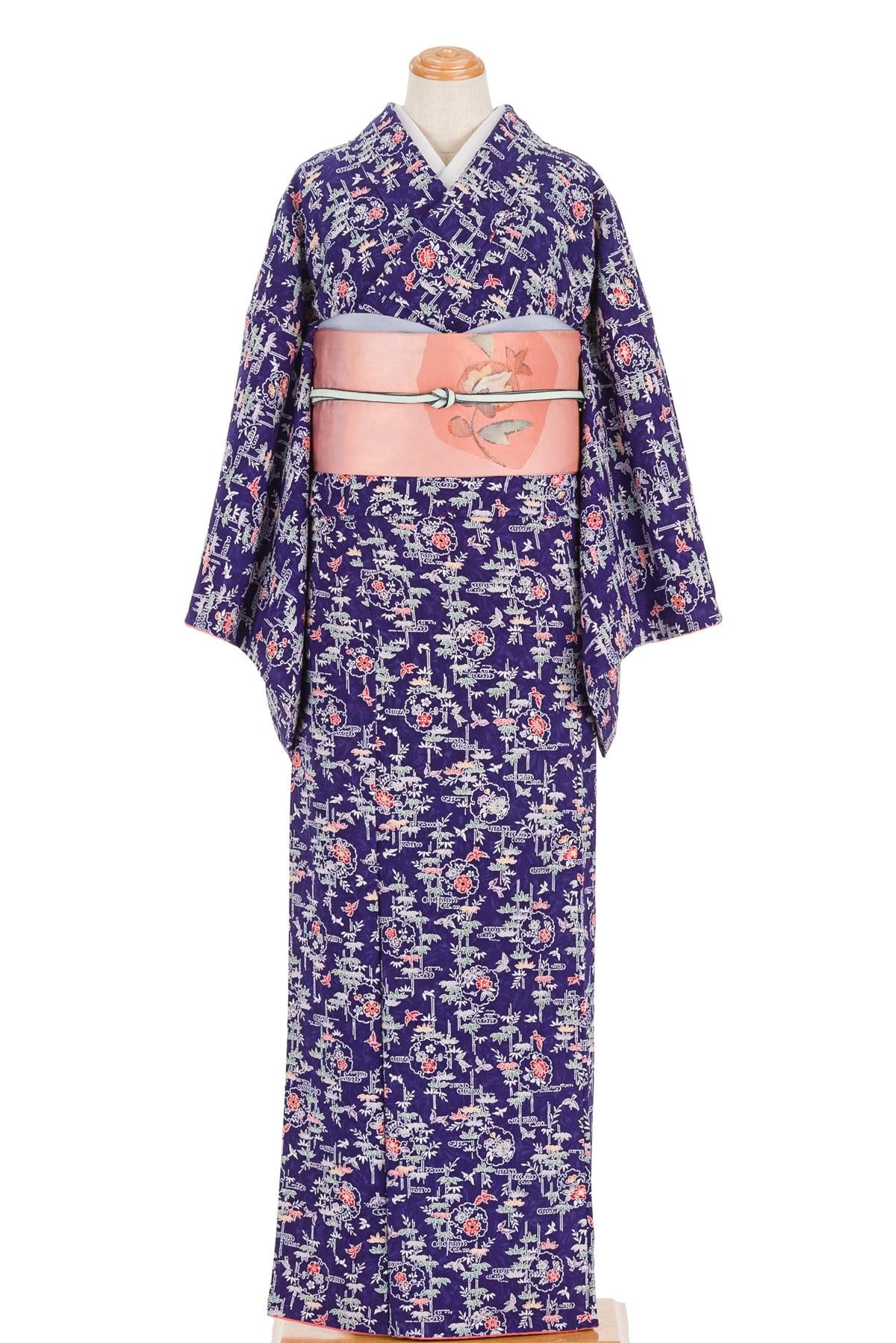 紫紺色の地に雪輪、花、小鳥などを染めた小紋の着物です。
