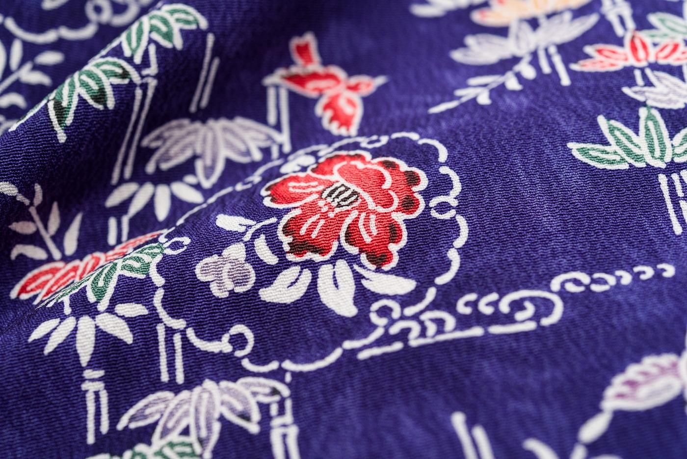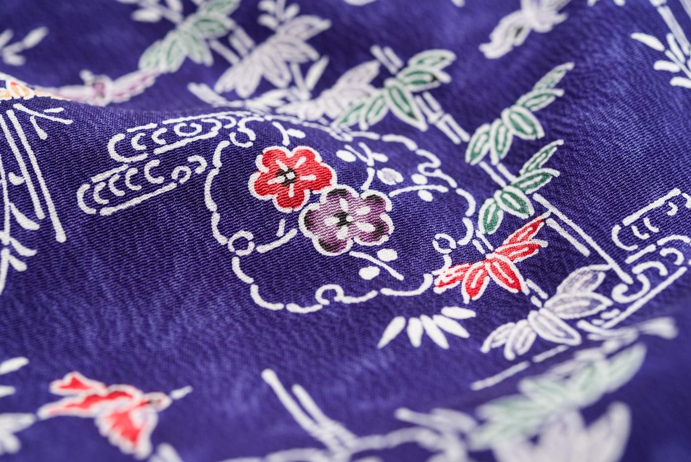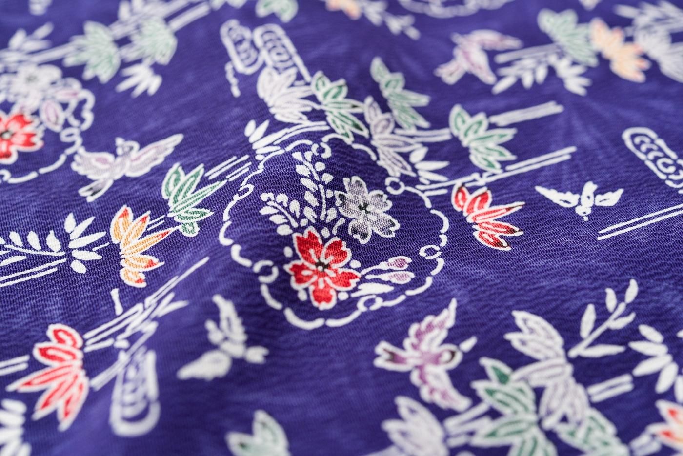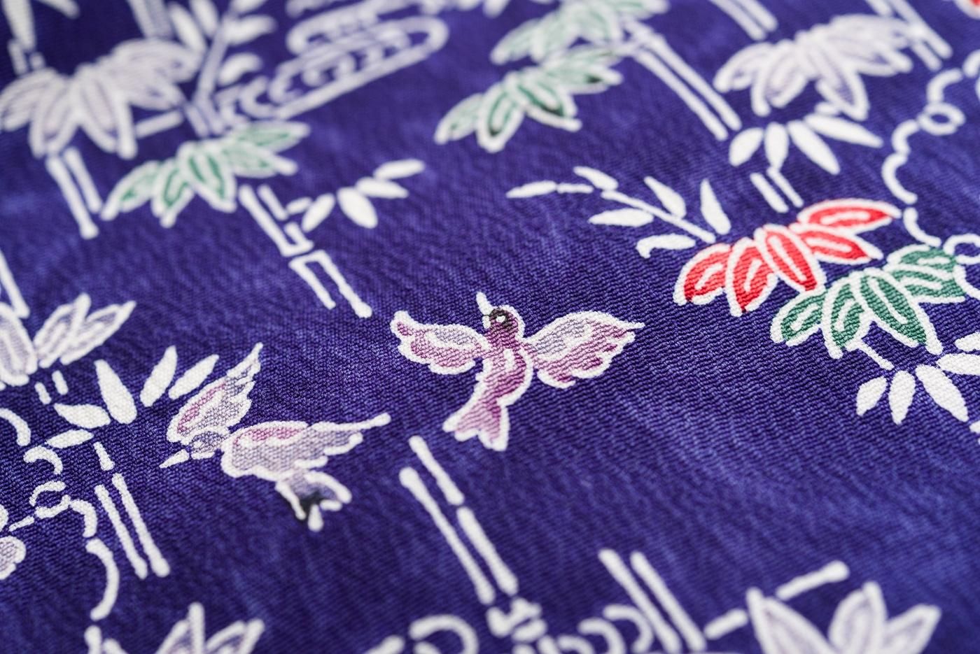 紫紺色の地に雪輪、花、小鳥などを染めた小紋の着物です。