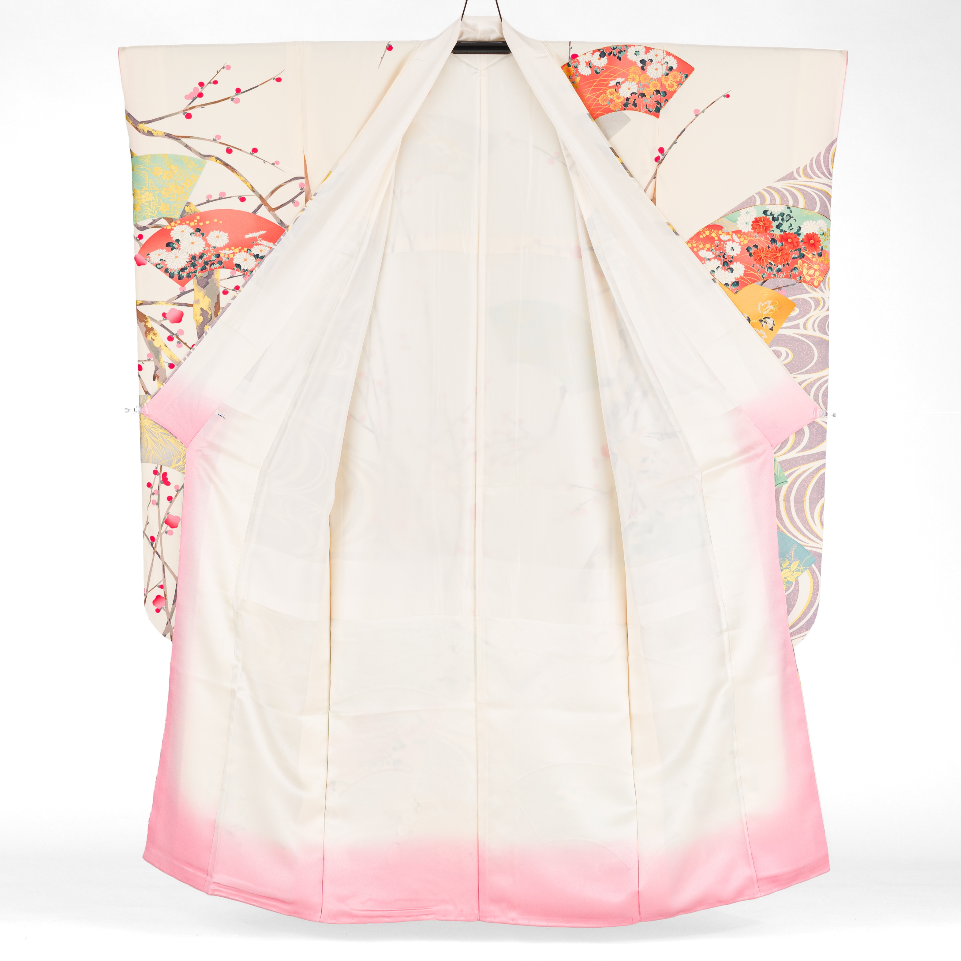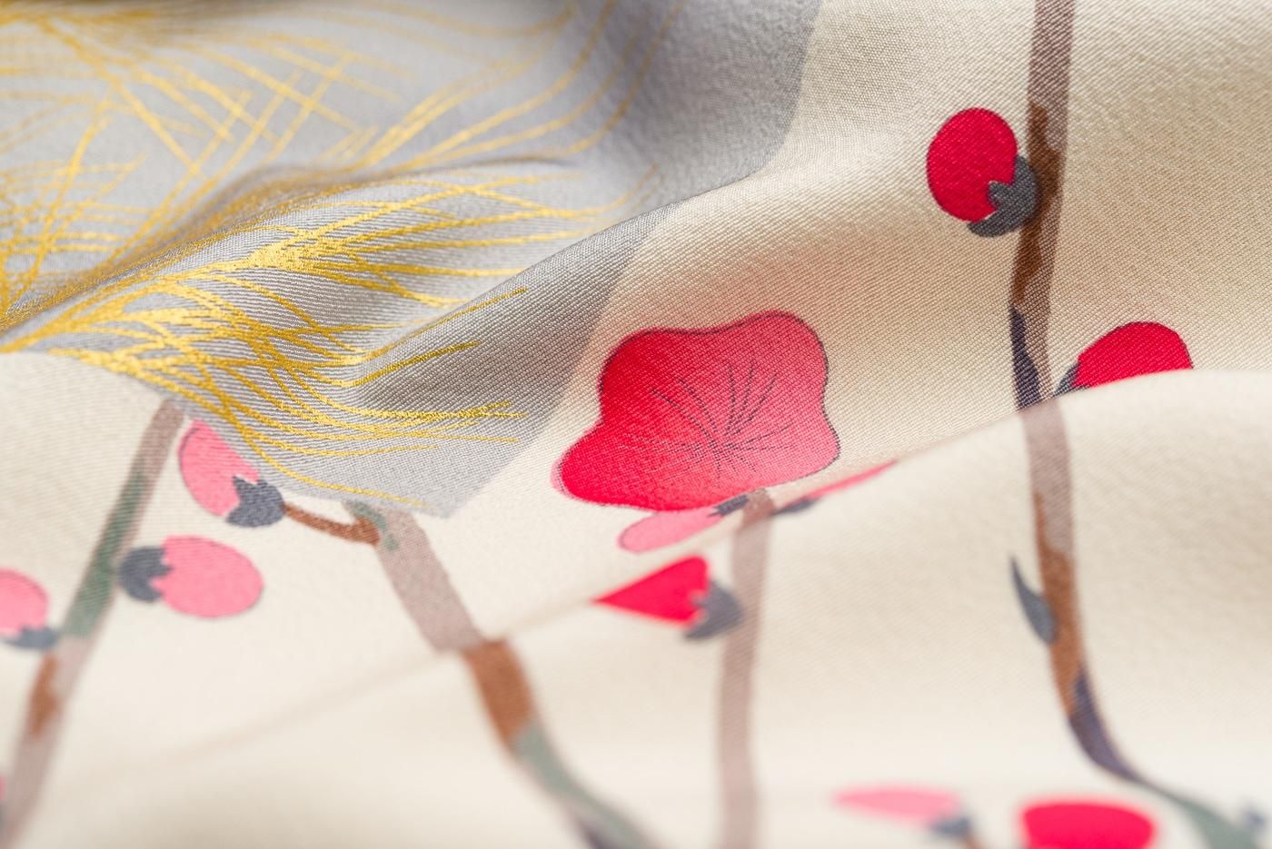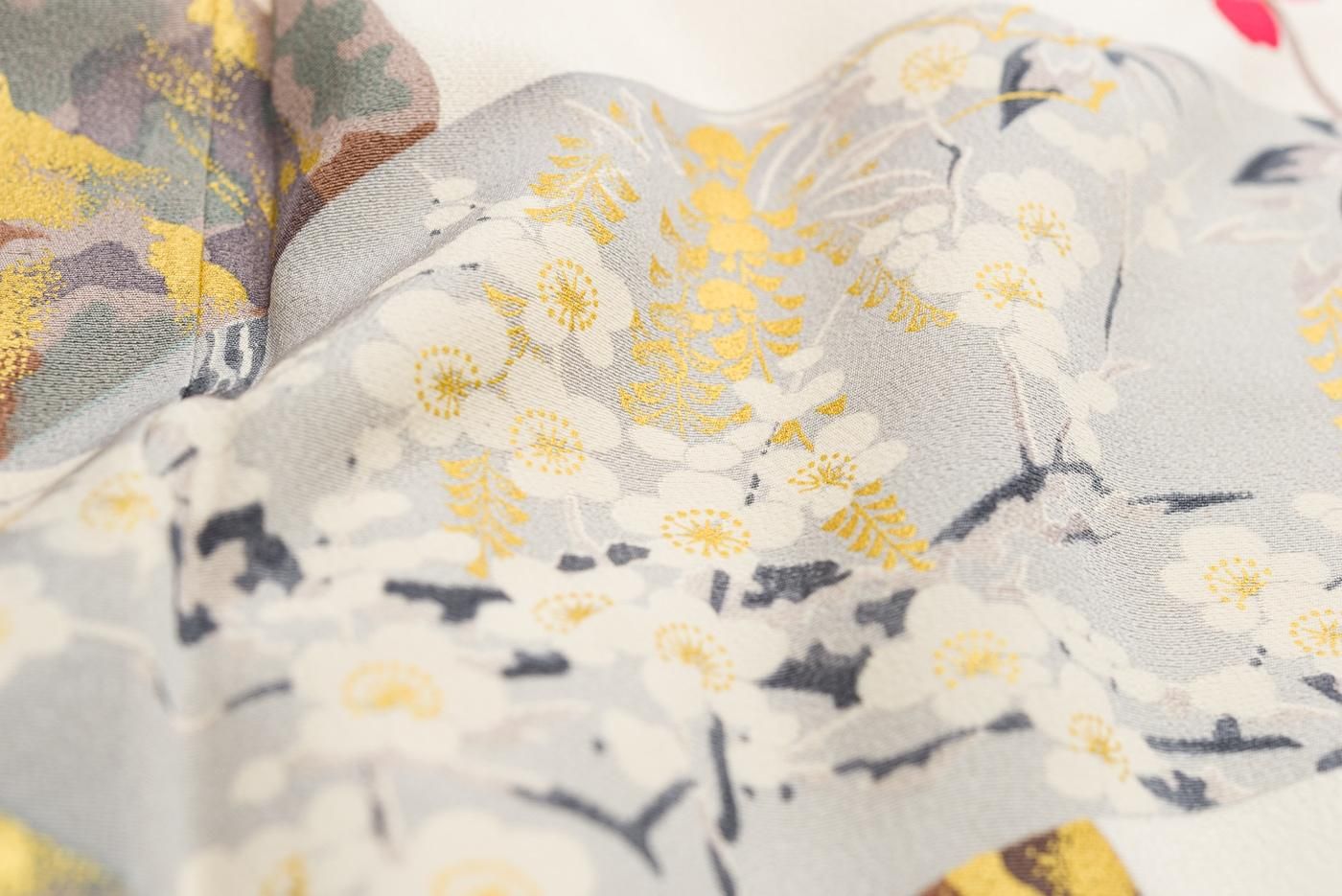 紅色の蕾も美しい枝梅を生き生きと描いた振袖です。