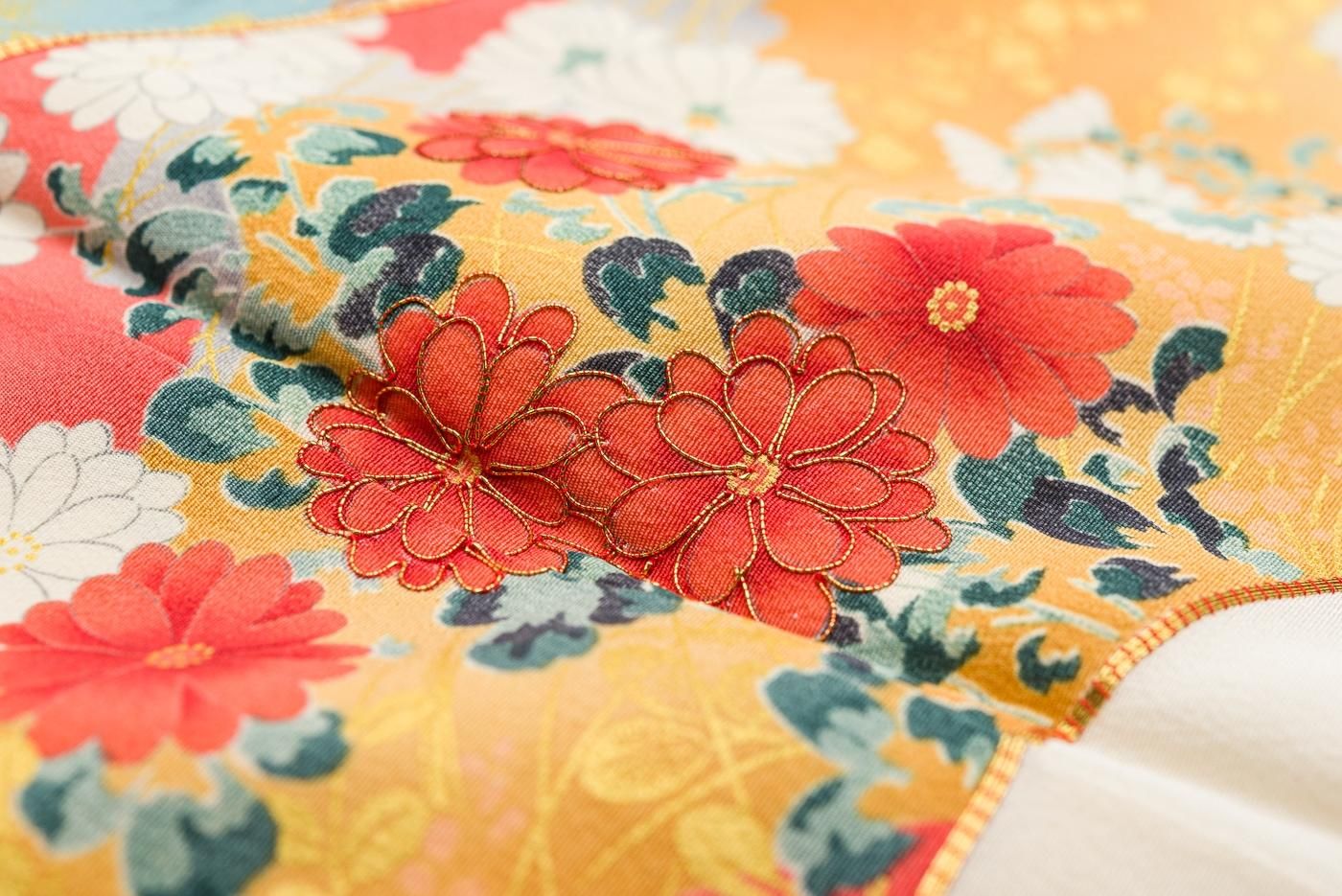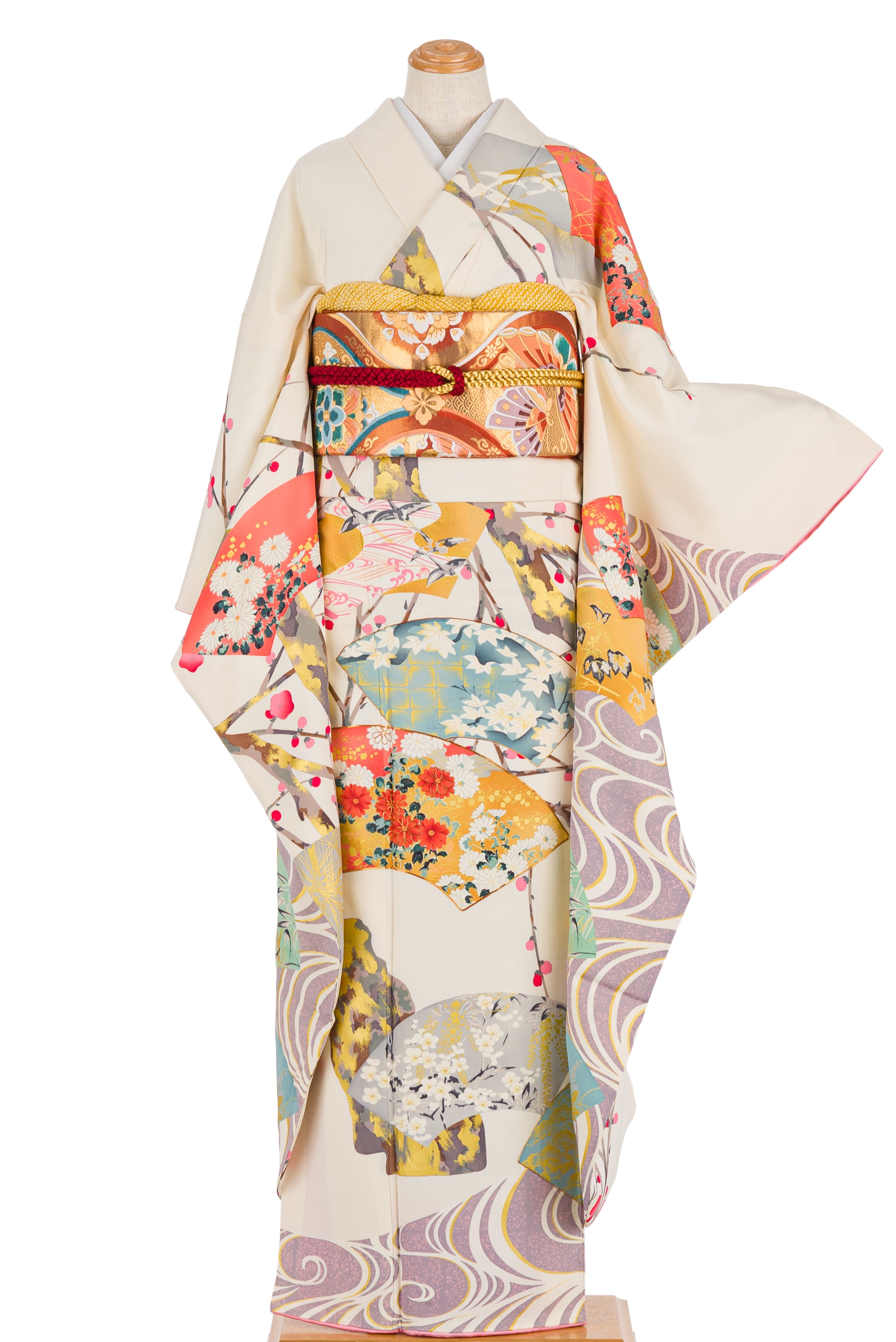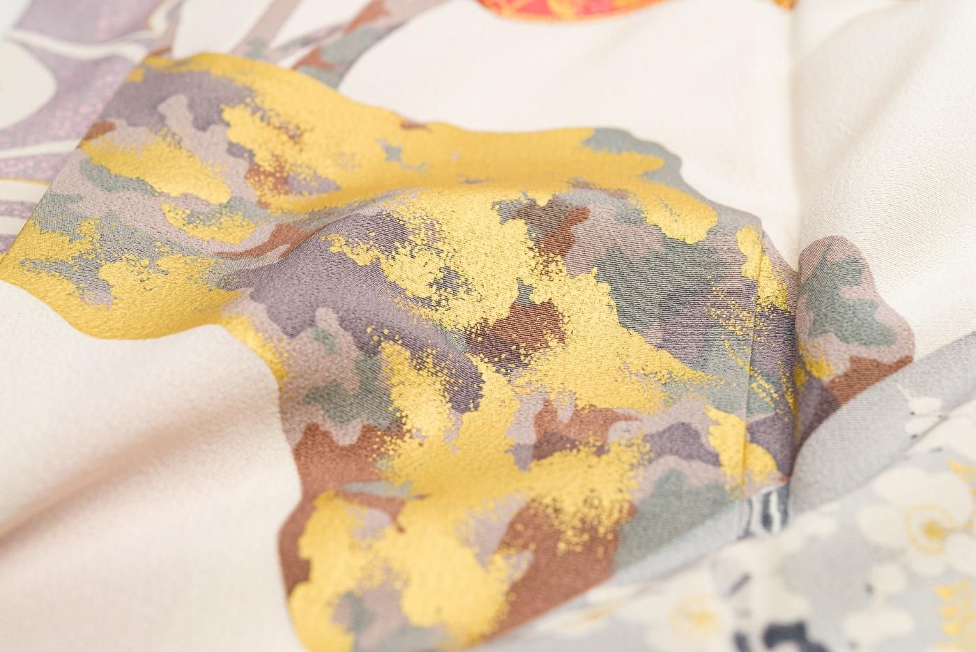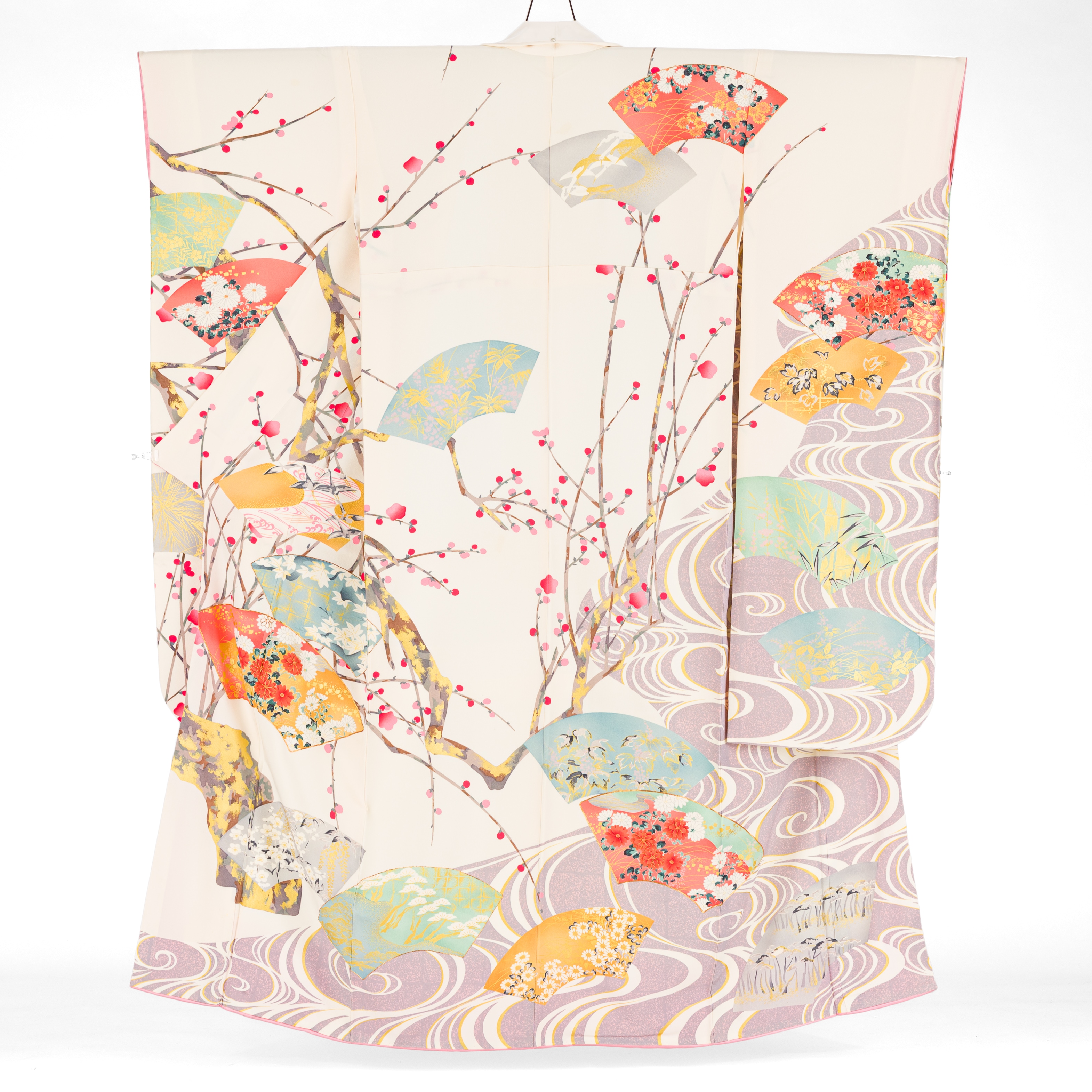 紅色の蕾も美しい枝梅を生き生きと描いた振袖です。