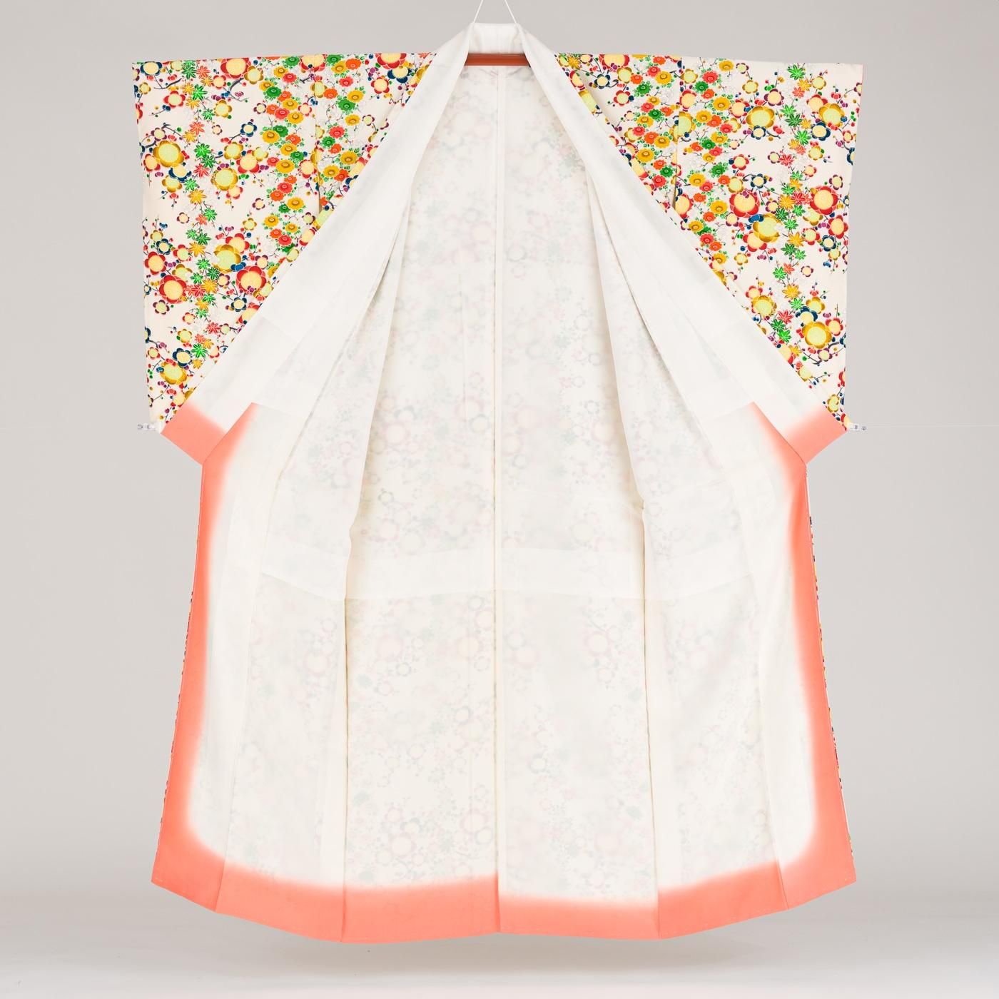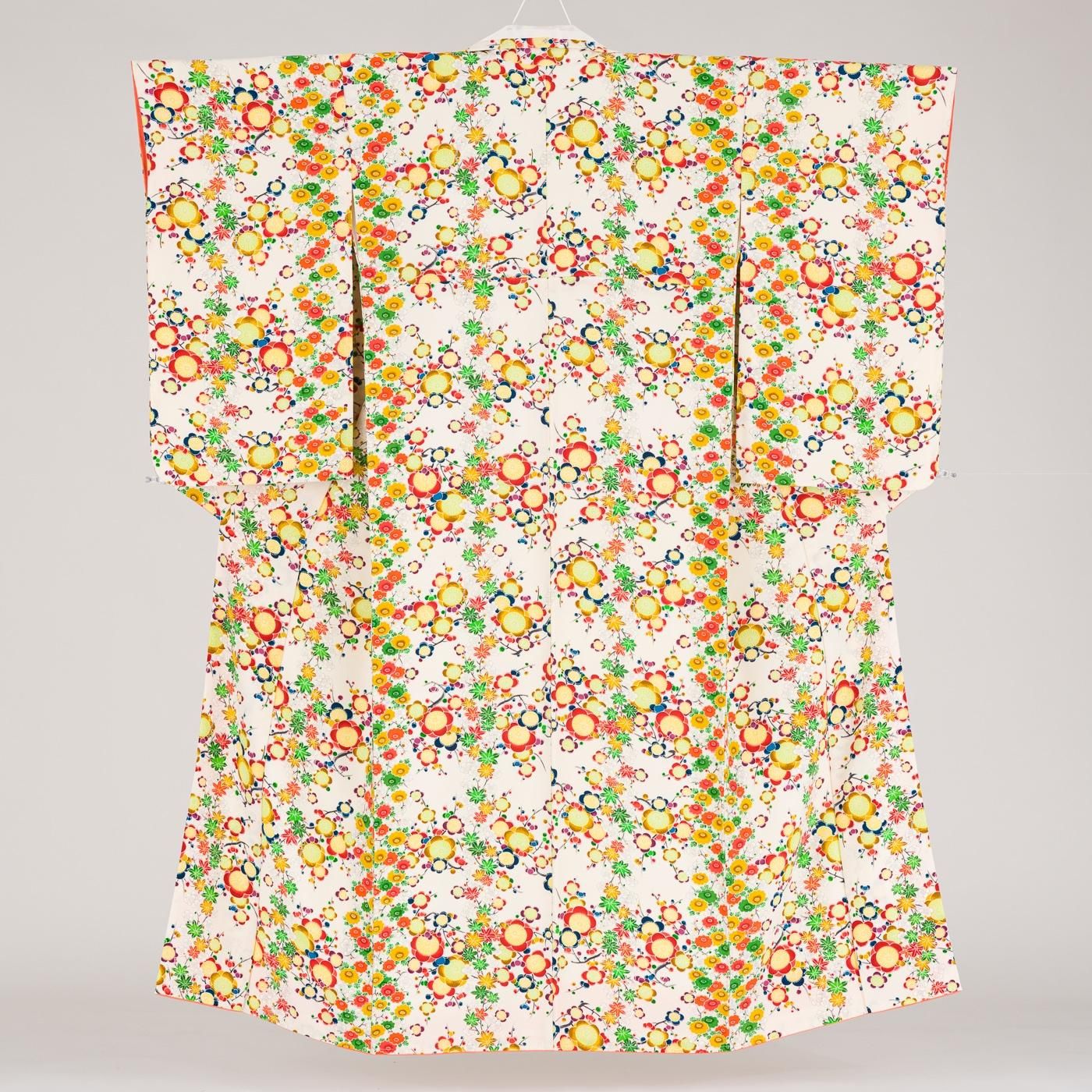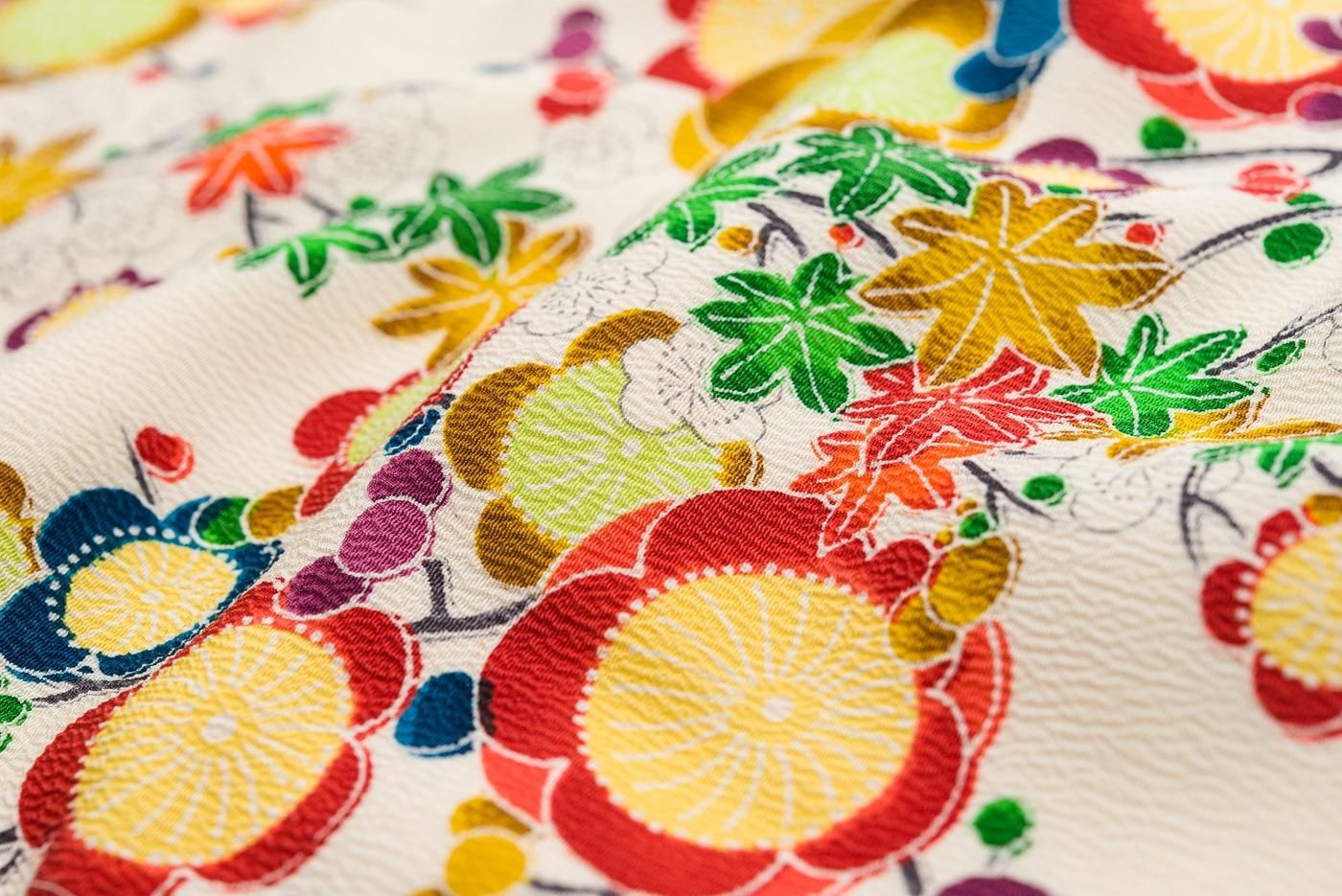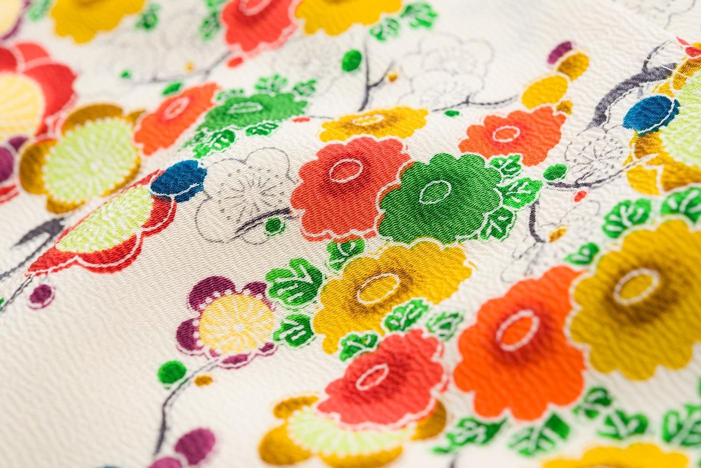 くっきりとしたカラフルな色彩でデザインされた可愛らしい着物ですね。