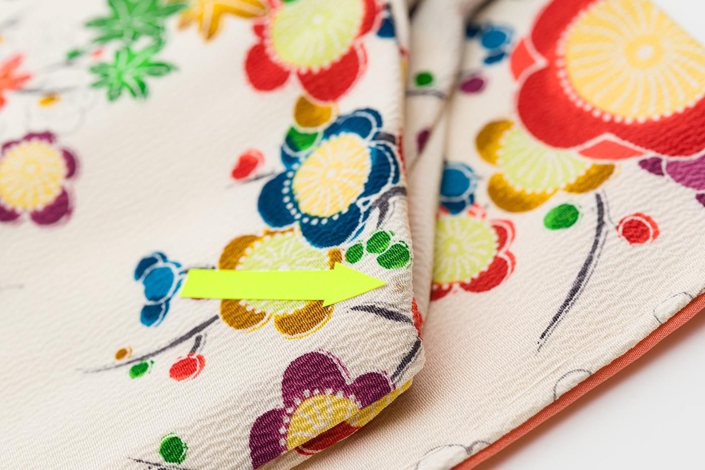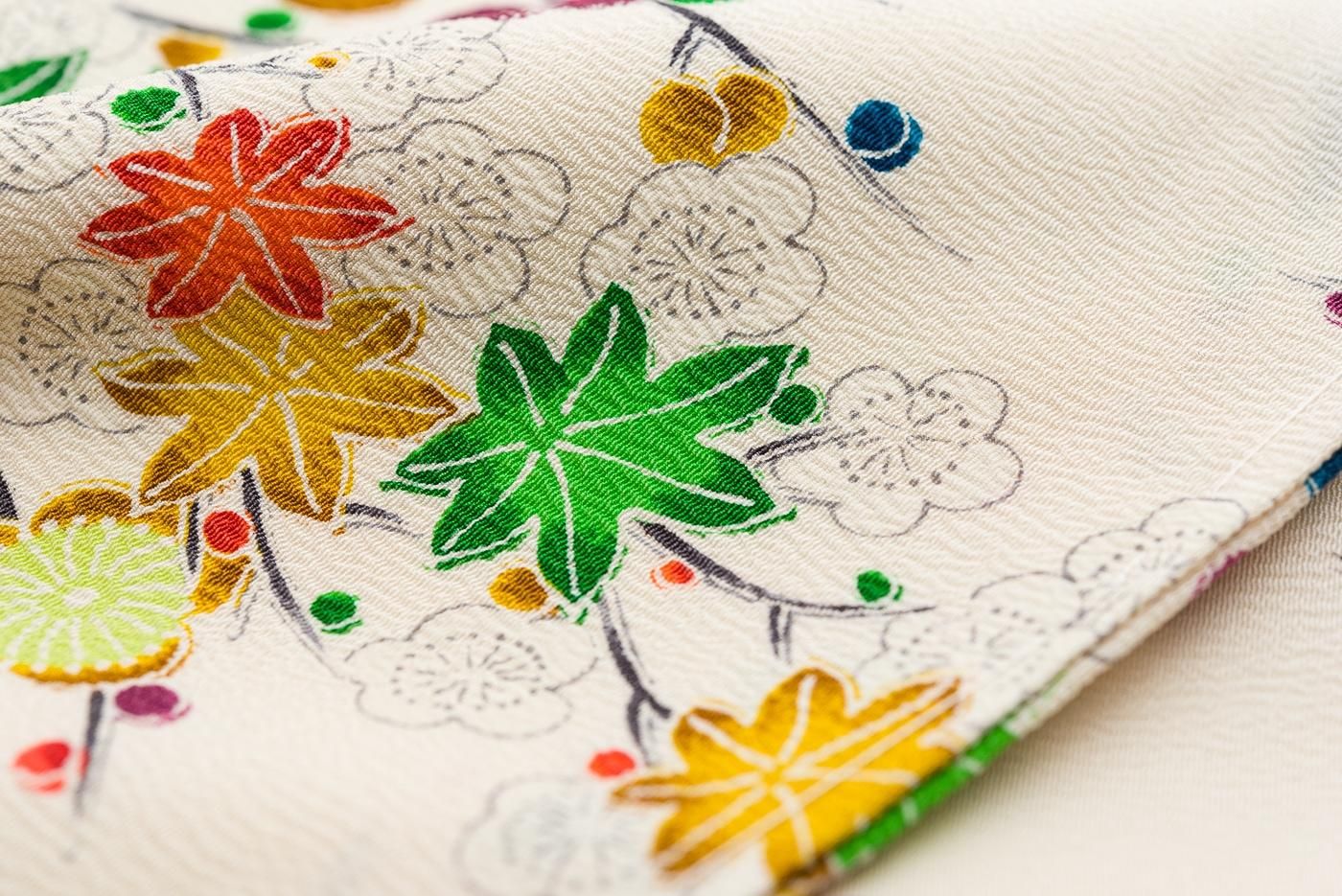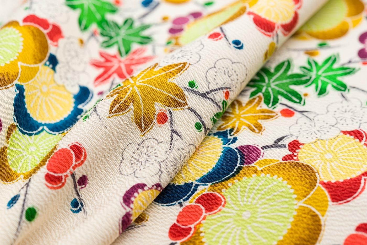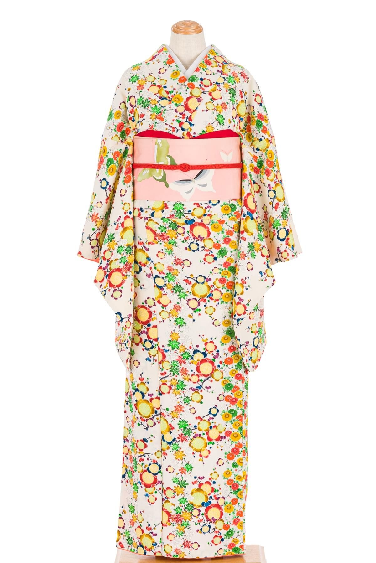 くっきりとしたカラフルな色彩でデザインされた可愛らしい着物ですね。