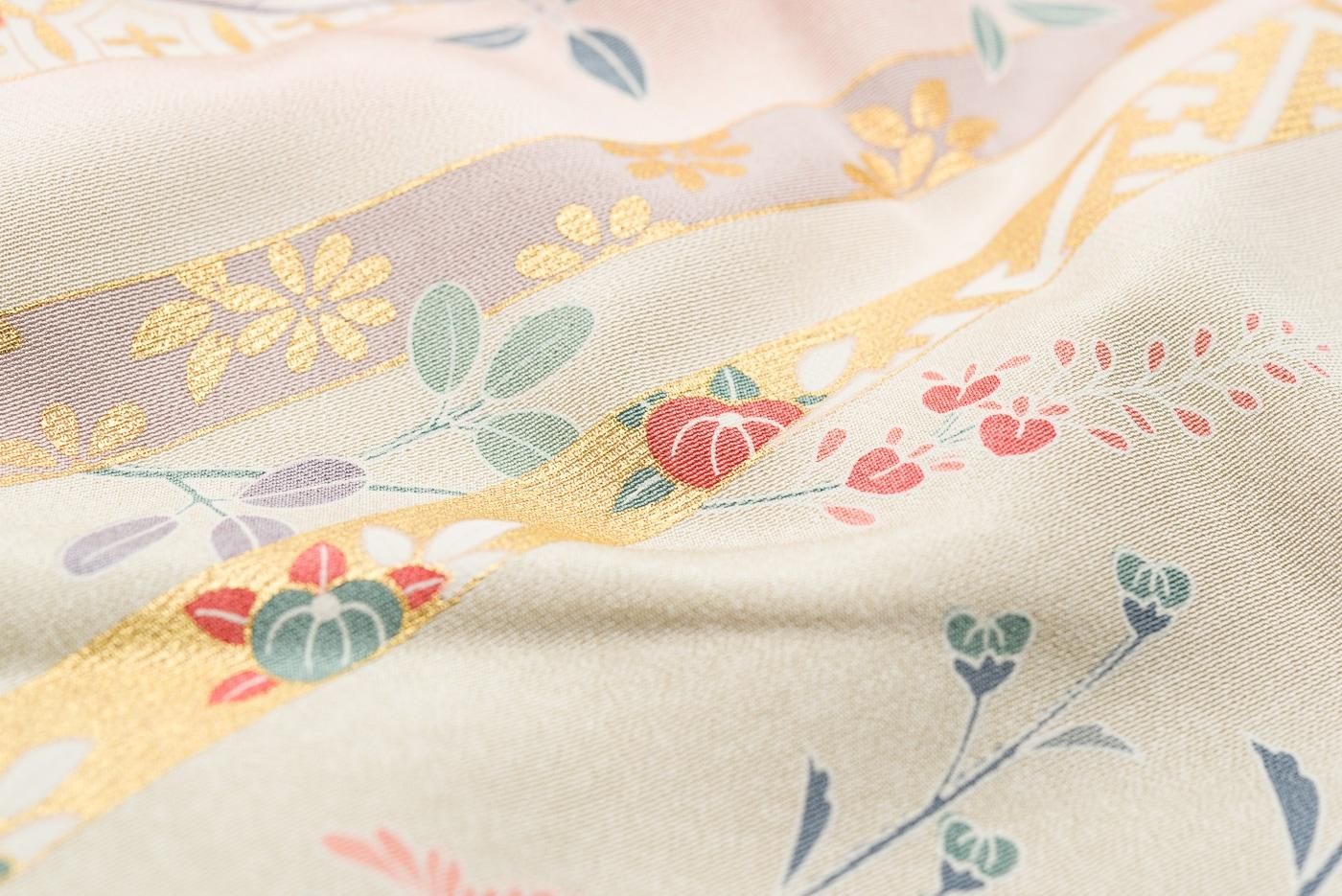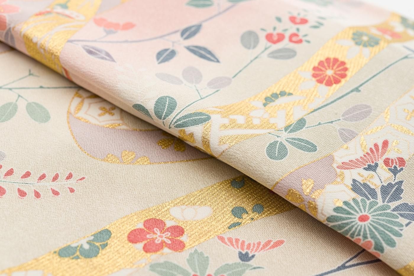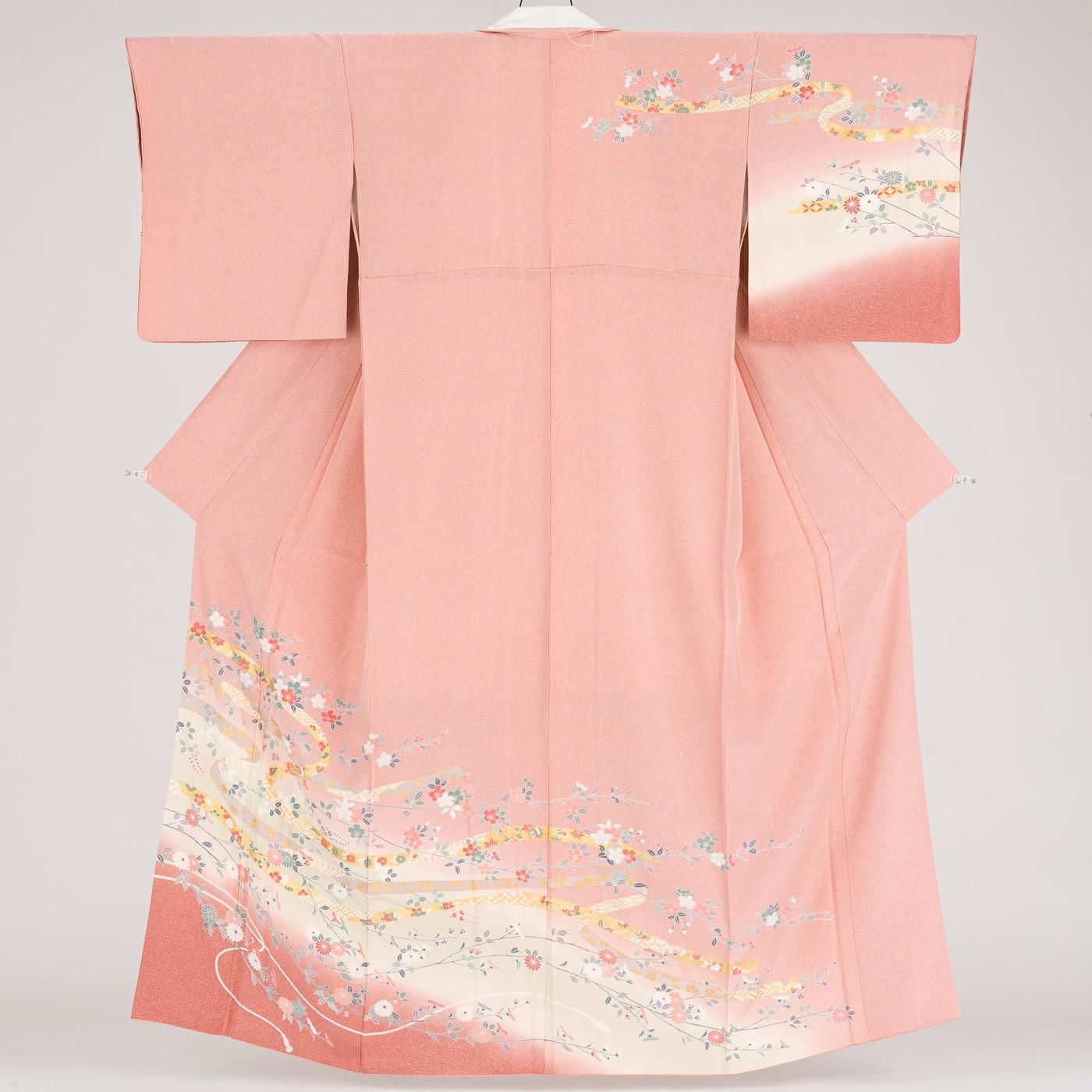 ゆったりと伸びる熨斗に桜、橘、菊、梅など四季の花を添えた訪問着です。