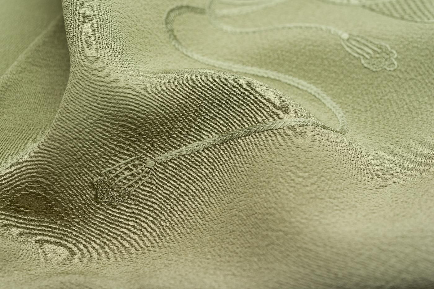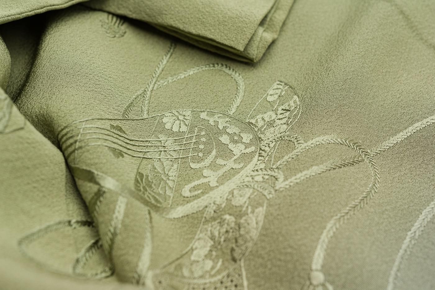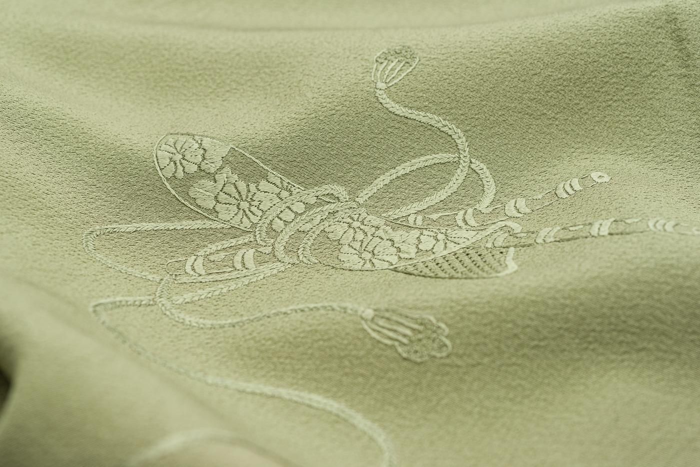 落ち着いた緑の暈し地に琵琶、横笛、檜扇などを刺繍した付下げです。