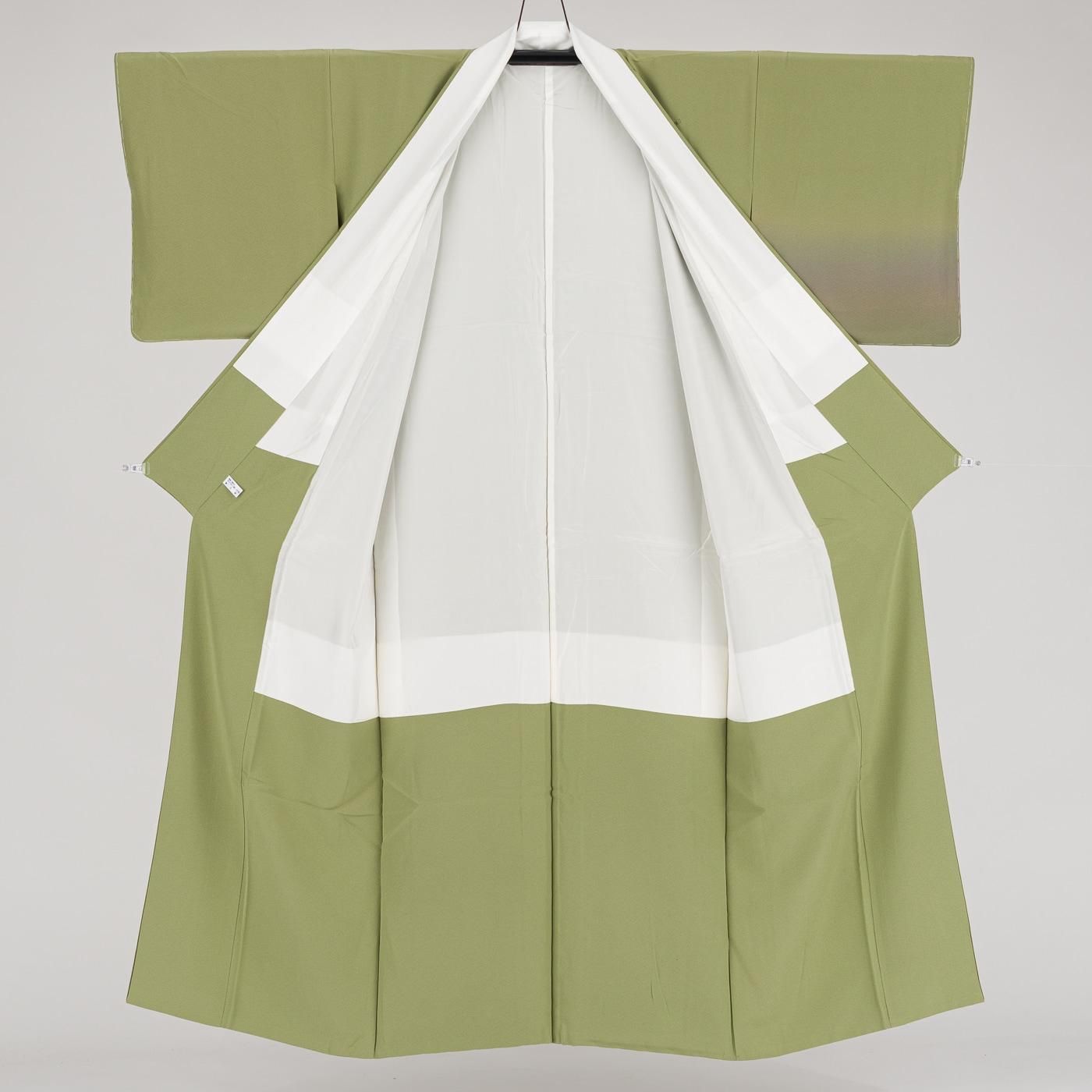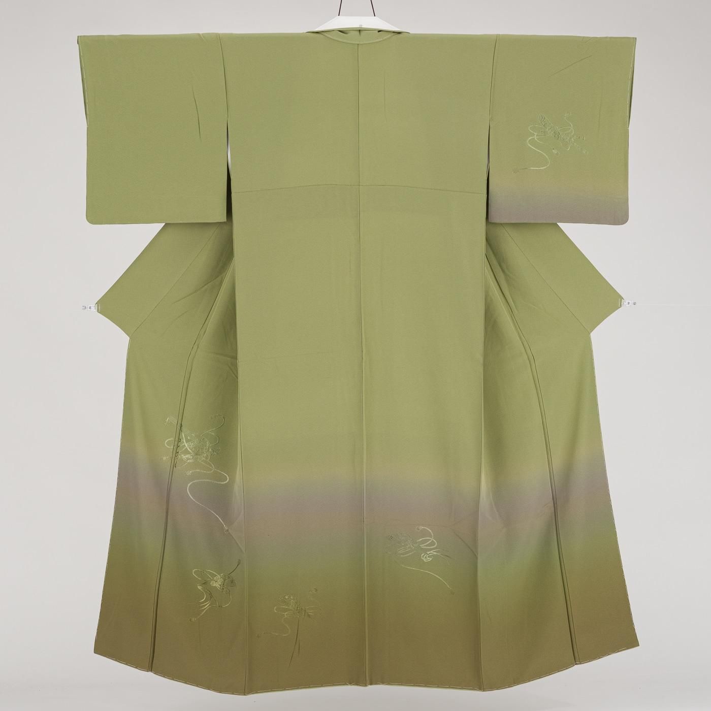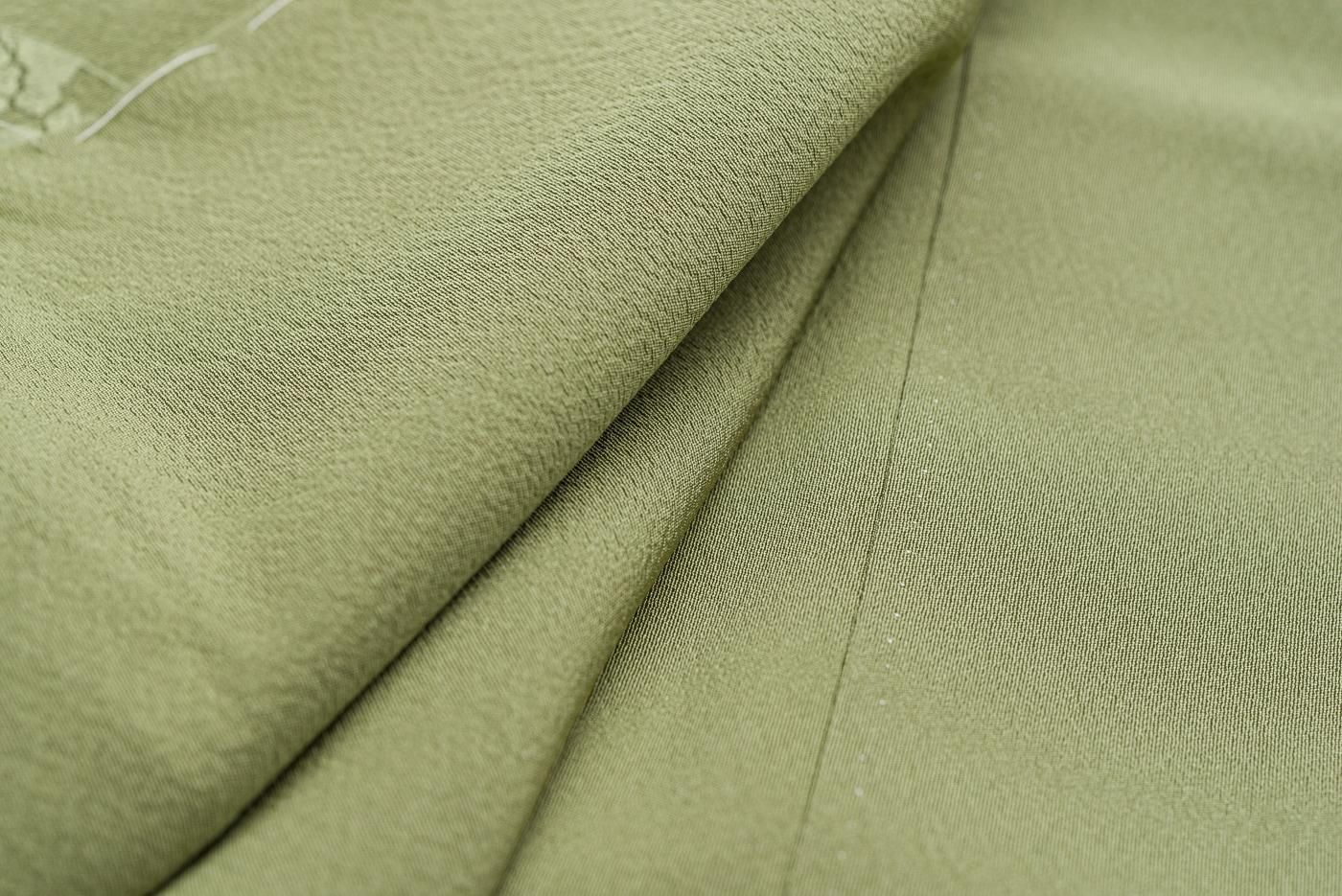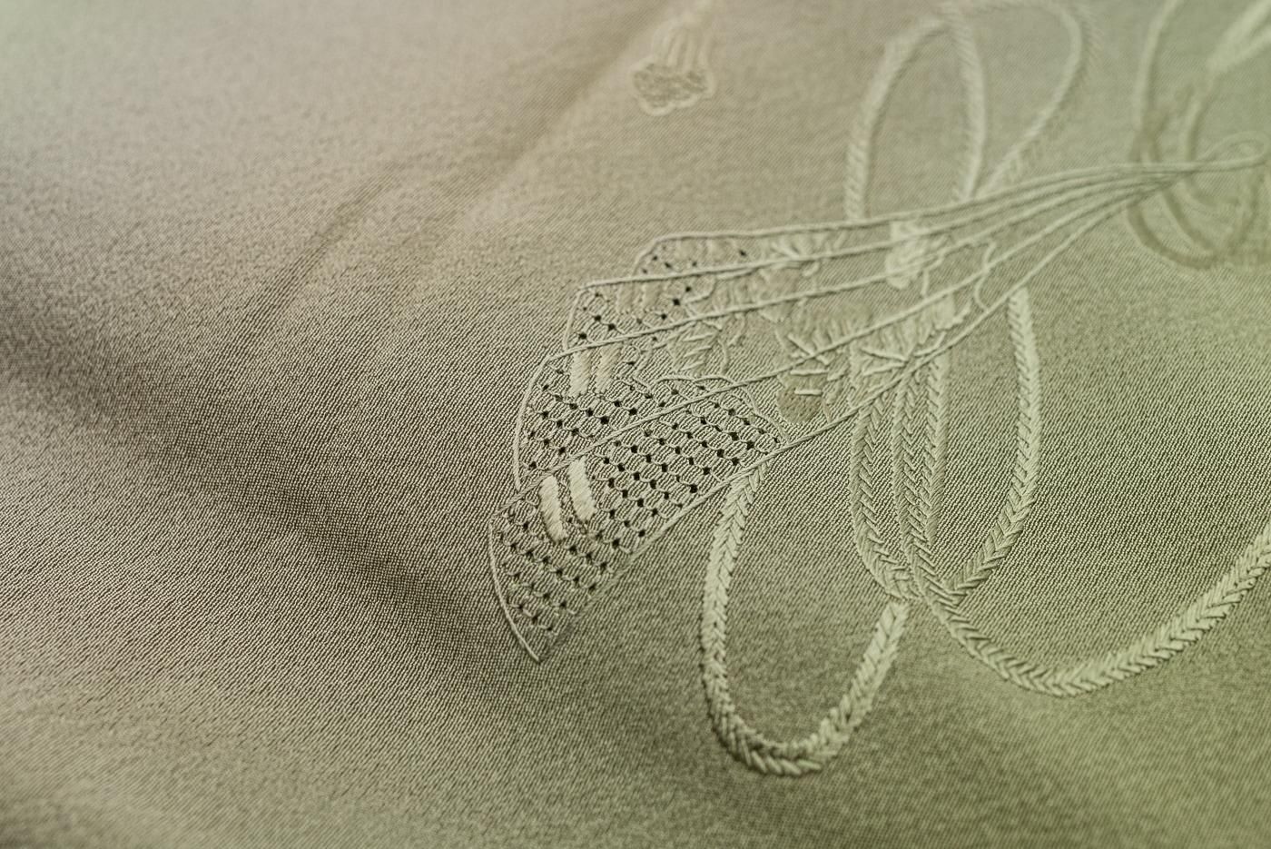 落ち着いた緑の暈し地に琵琶、横笛、檜扇などを刺繍した付下げです。