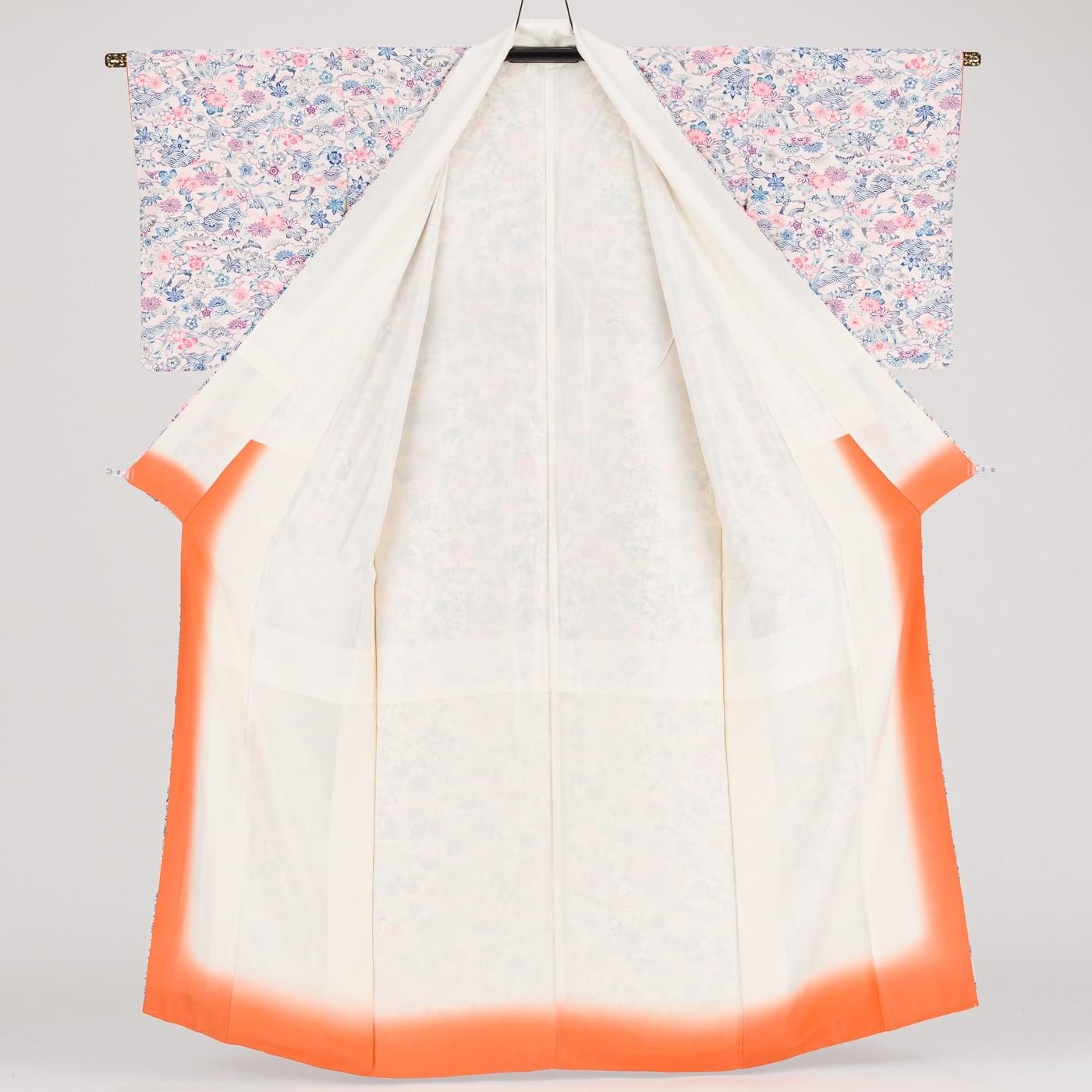 淡い桃色の地に梅、菊、あやめ、撫子などを染めた小紋の着物です。