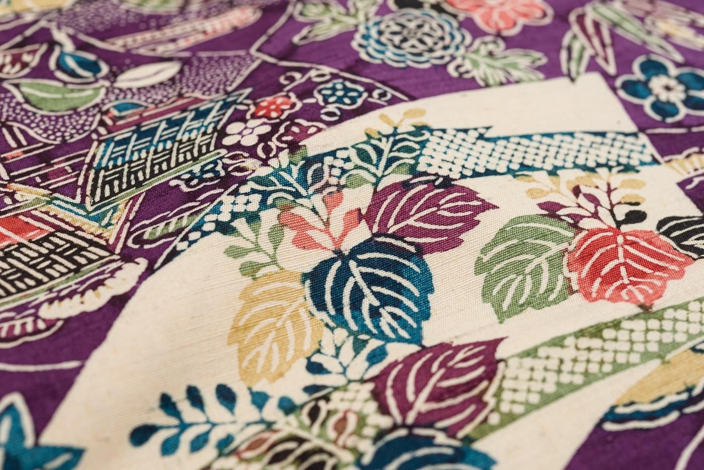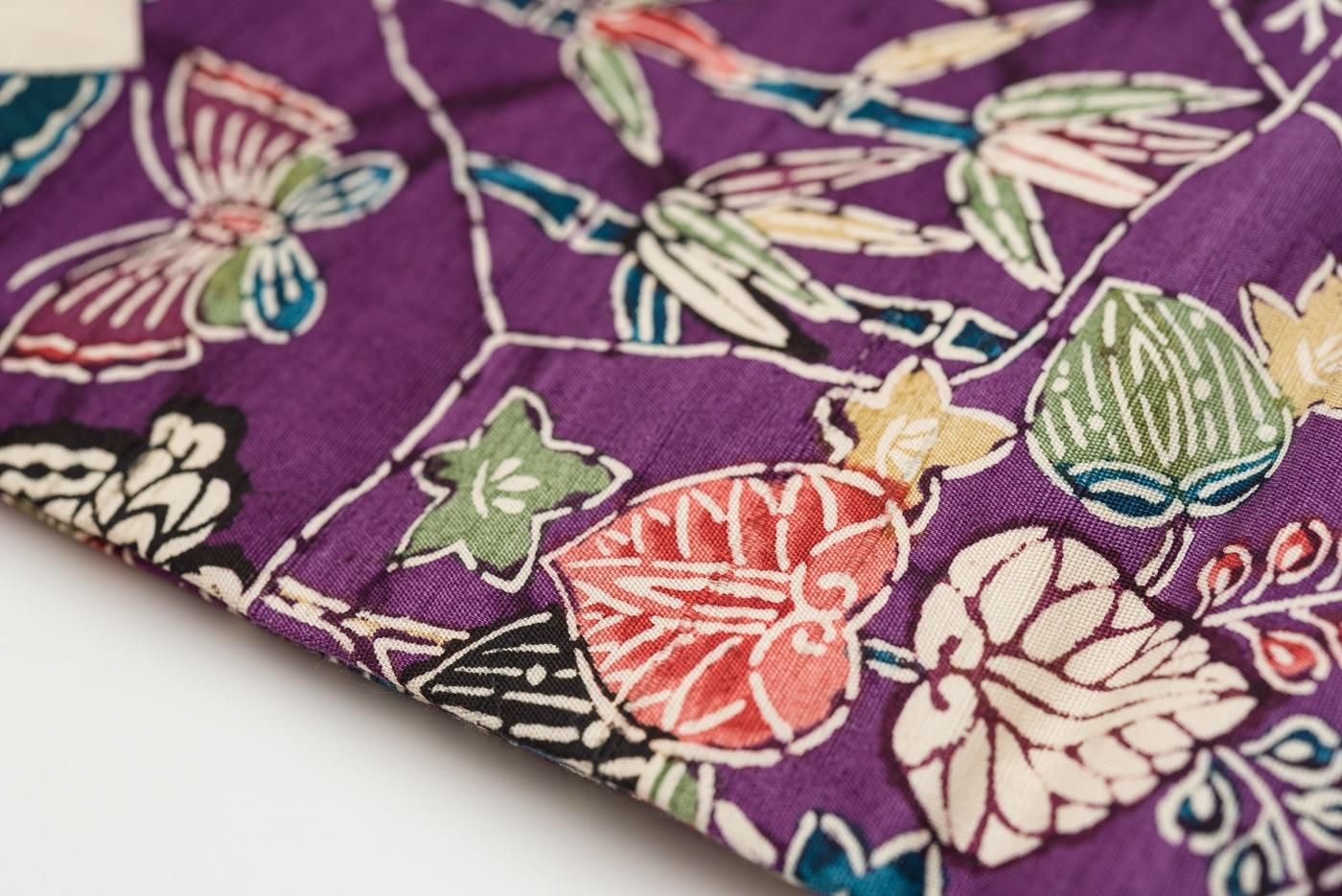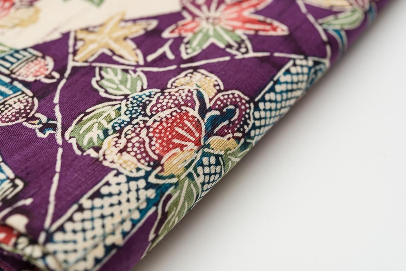 紫色の紬地に四季の花と鶴の姿を染めた九寸名古屋帯です。