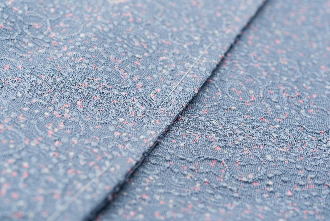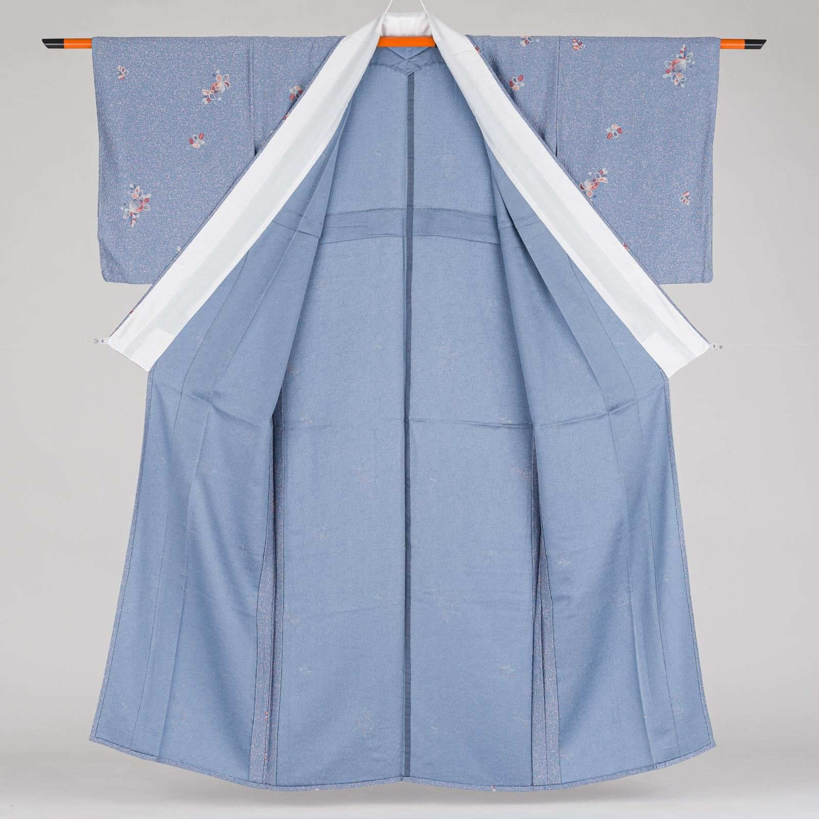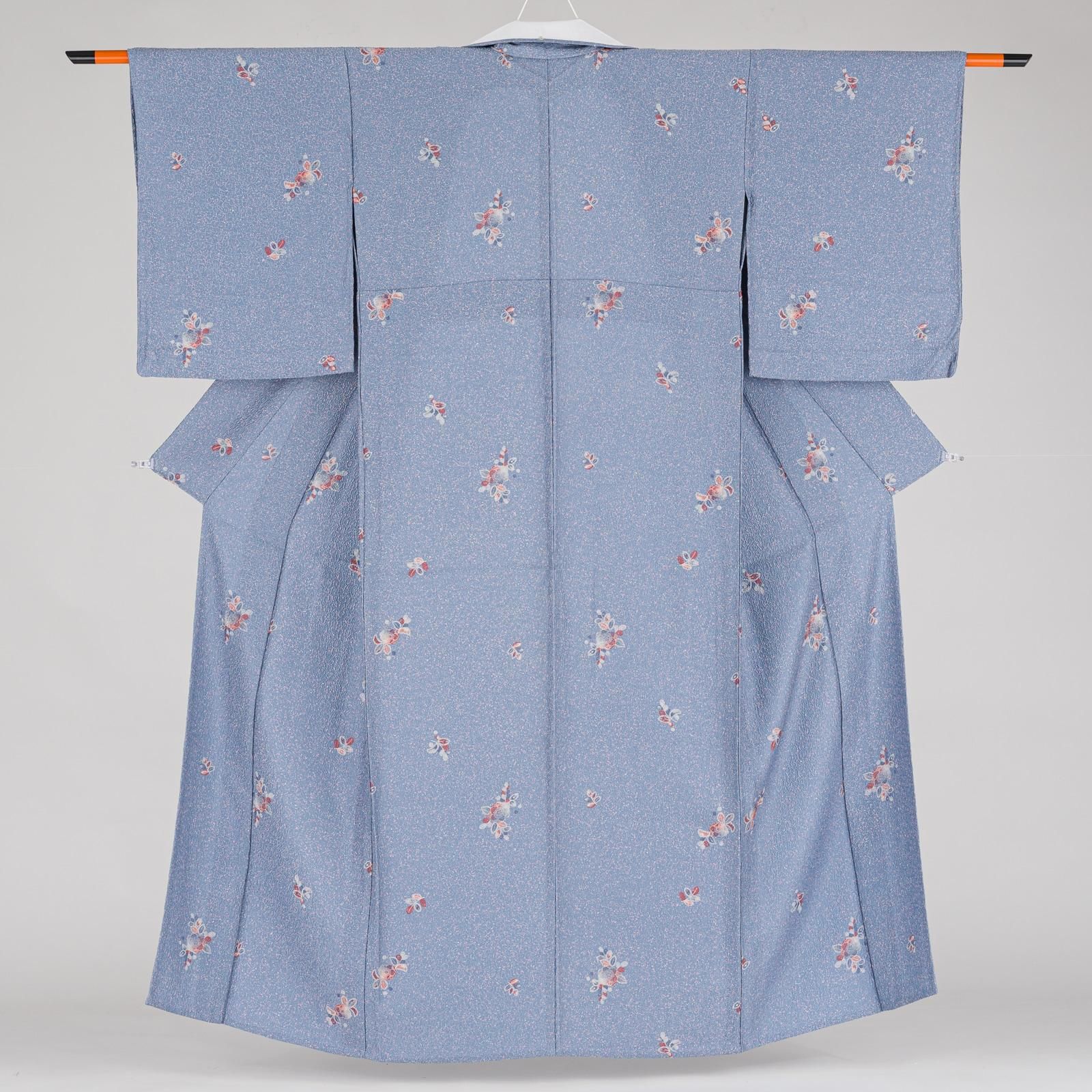 落ち着いた青色の地に小花柄を染めた単衣の小紋です。