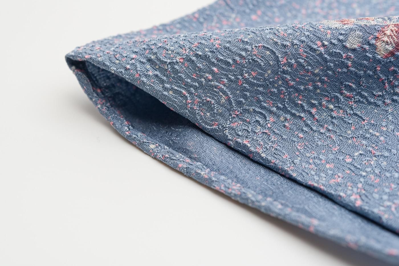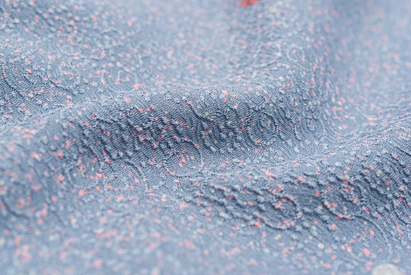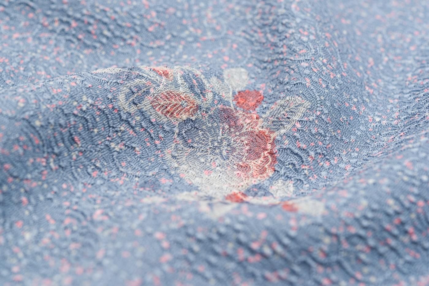 落ち着いた青色の地に小花柄を染めた単衣の小紋です。