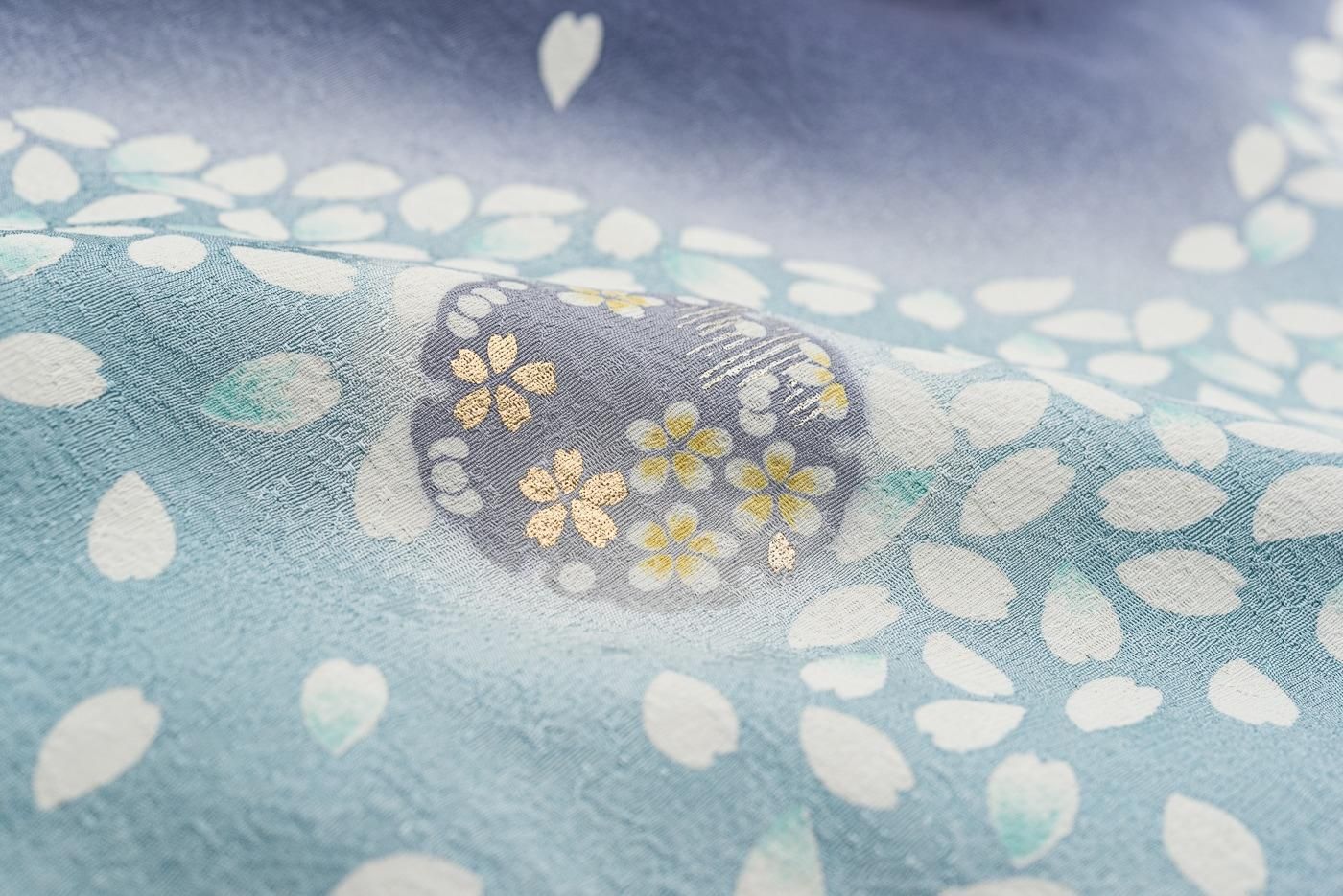 裾や袖に添えた小さな雪輪には白や金の小花が添えられています。