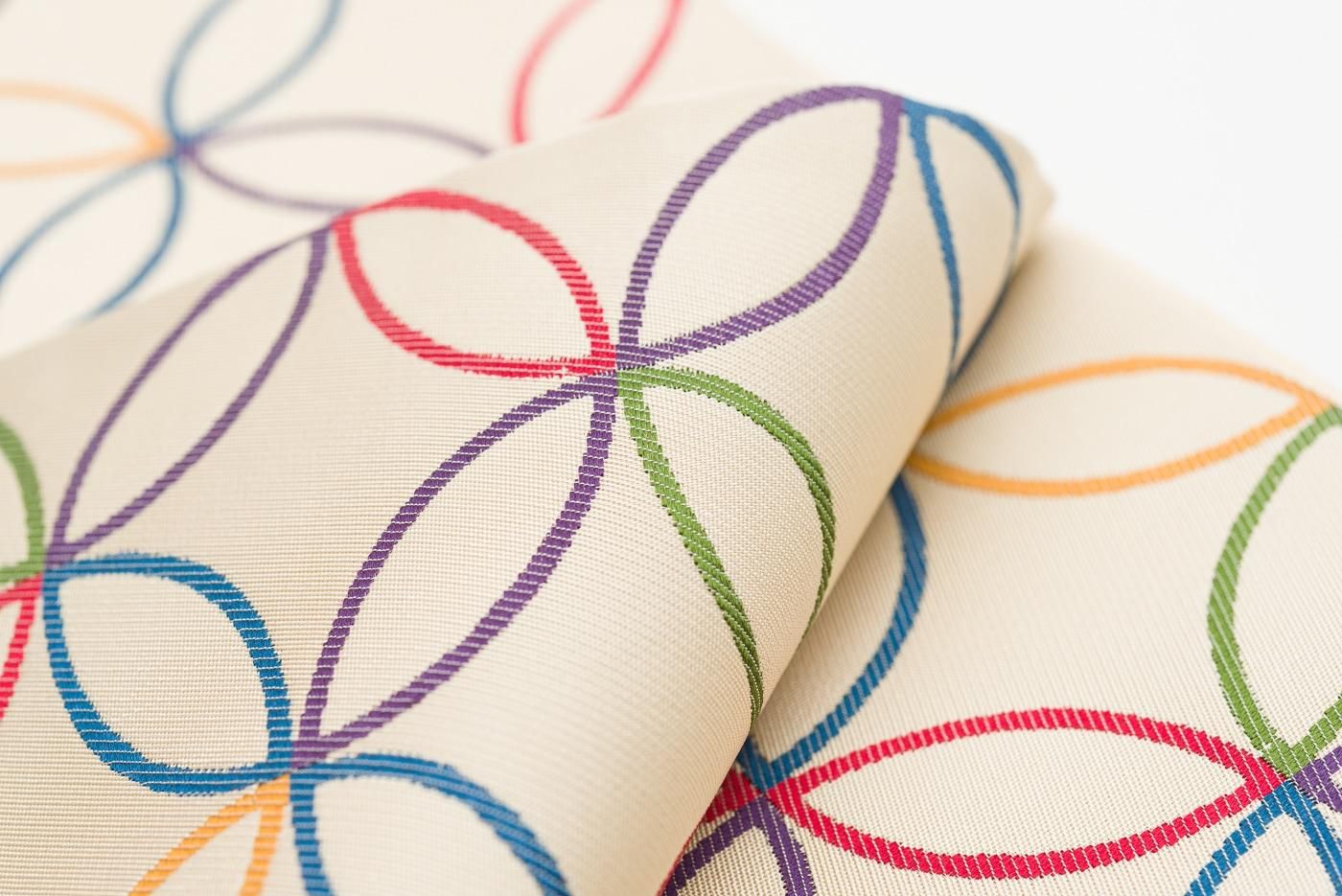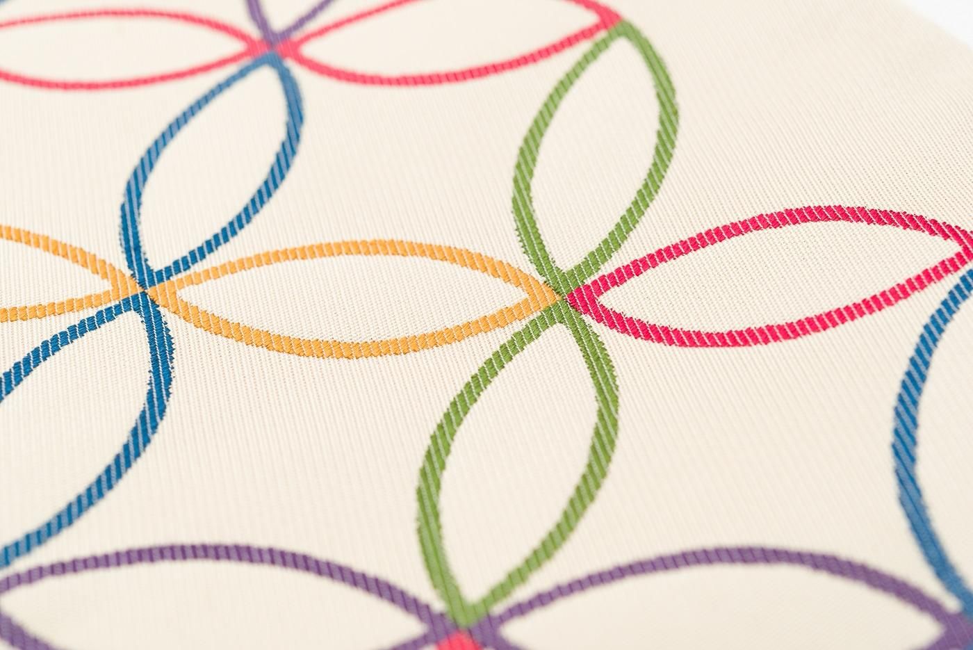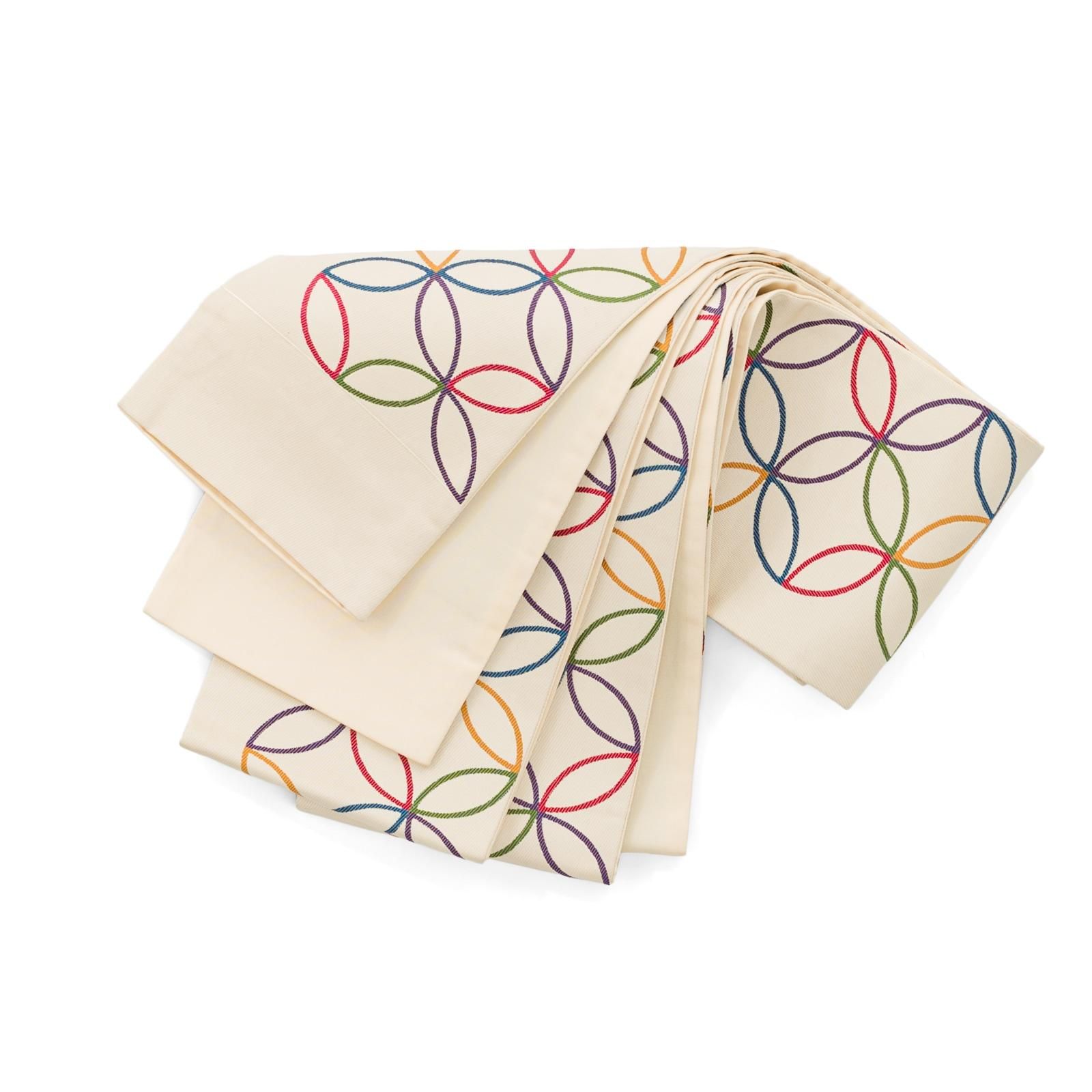 カラフルな七宝文様を織り出した博多織の紋小袋帯です。