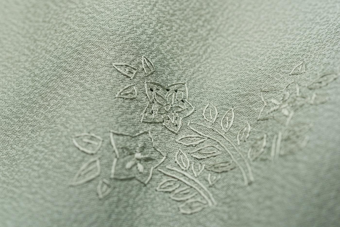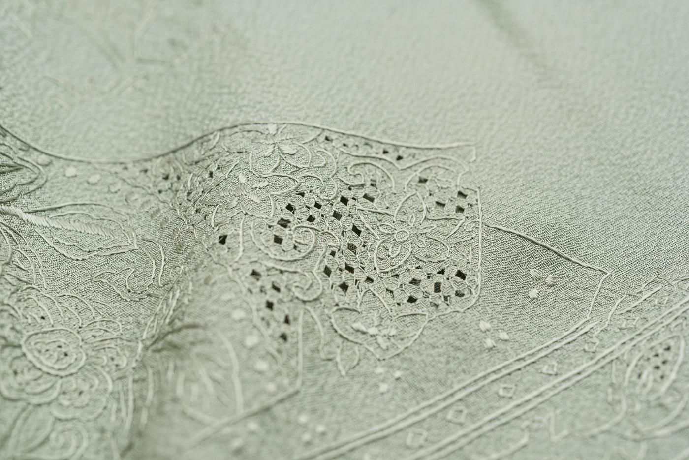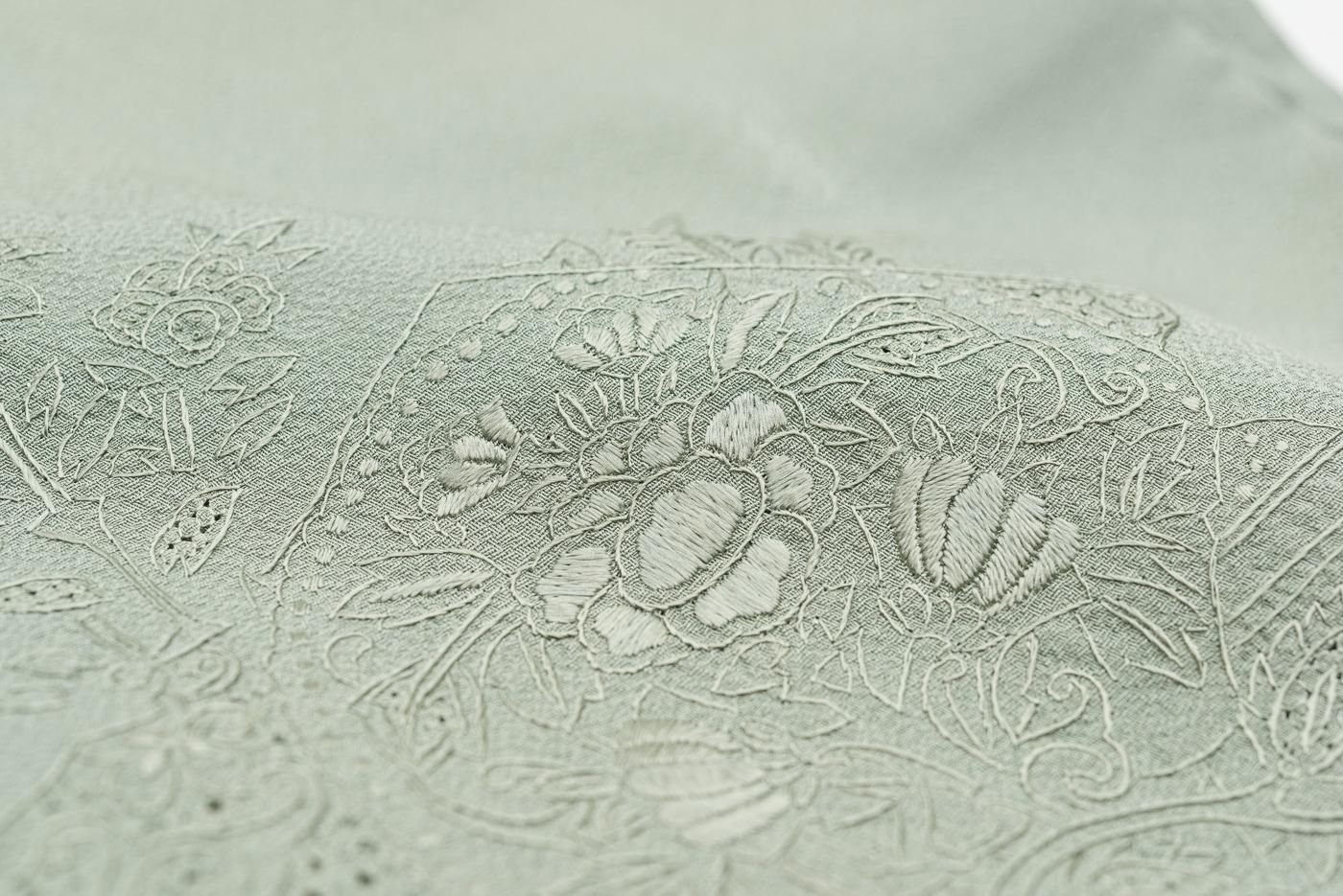 白緑、あるいは淡い山葵色と言ったふうな落ち着いたグリーンの地に汕頭刺繍の花更紗が浮かぶ付下げです。