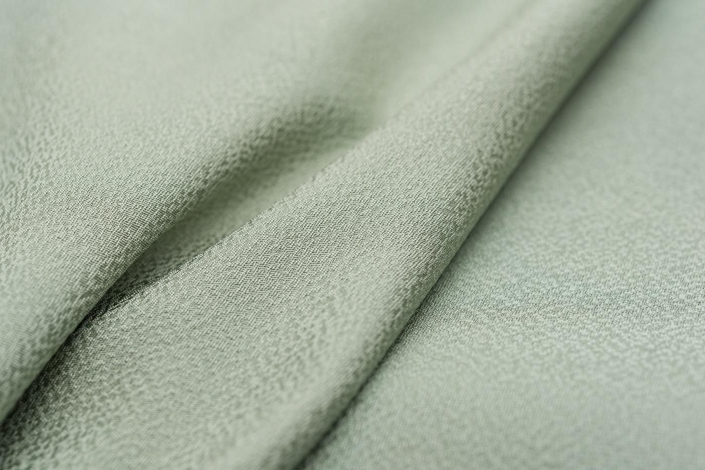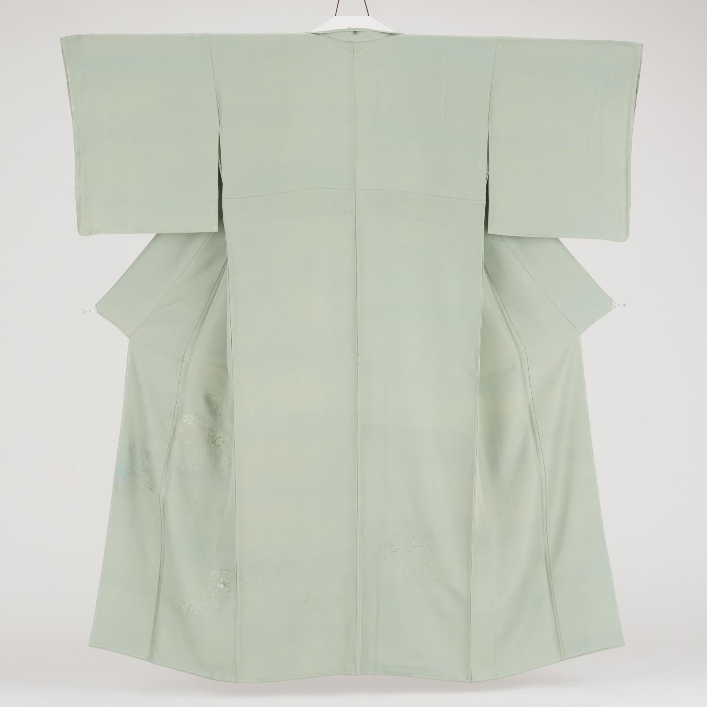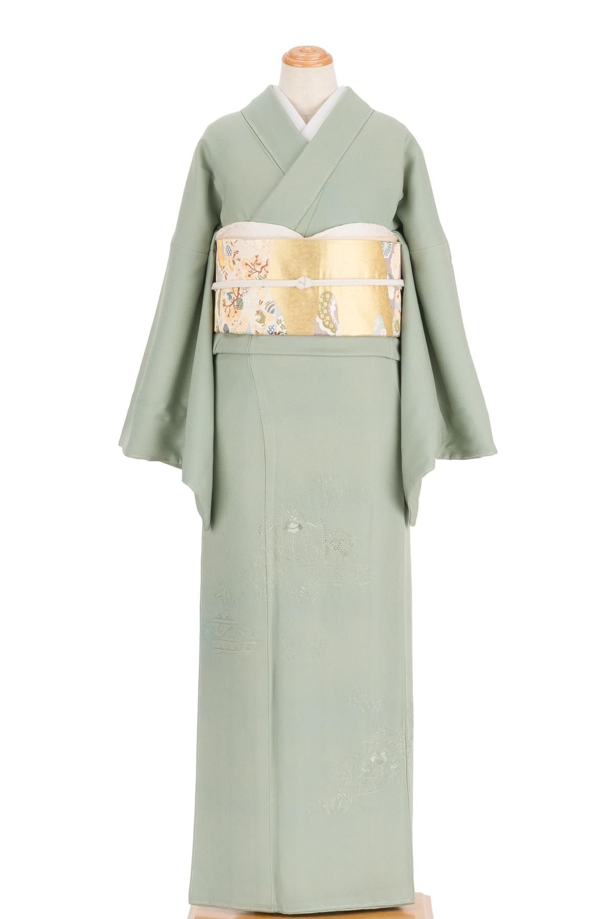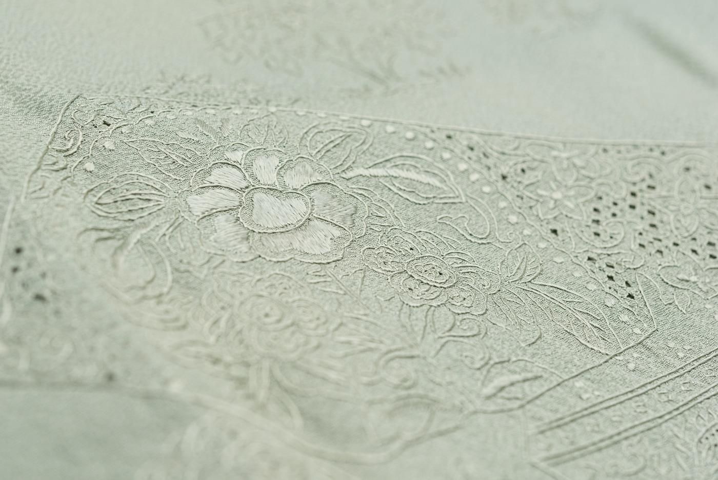 白緑、あるいは淡い山葵色と言ったふうな落ち着いたグリーンの地に汕頭刺繍の花更紗が浮かぶ付下げです。