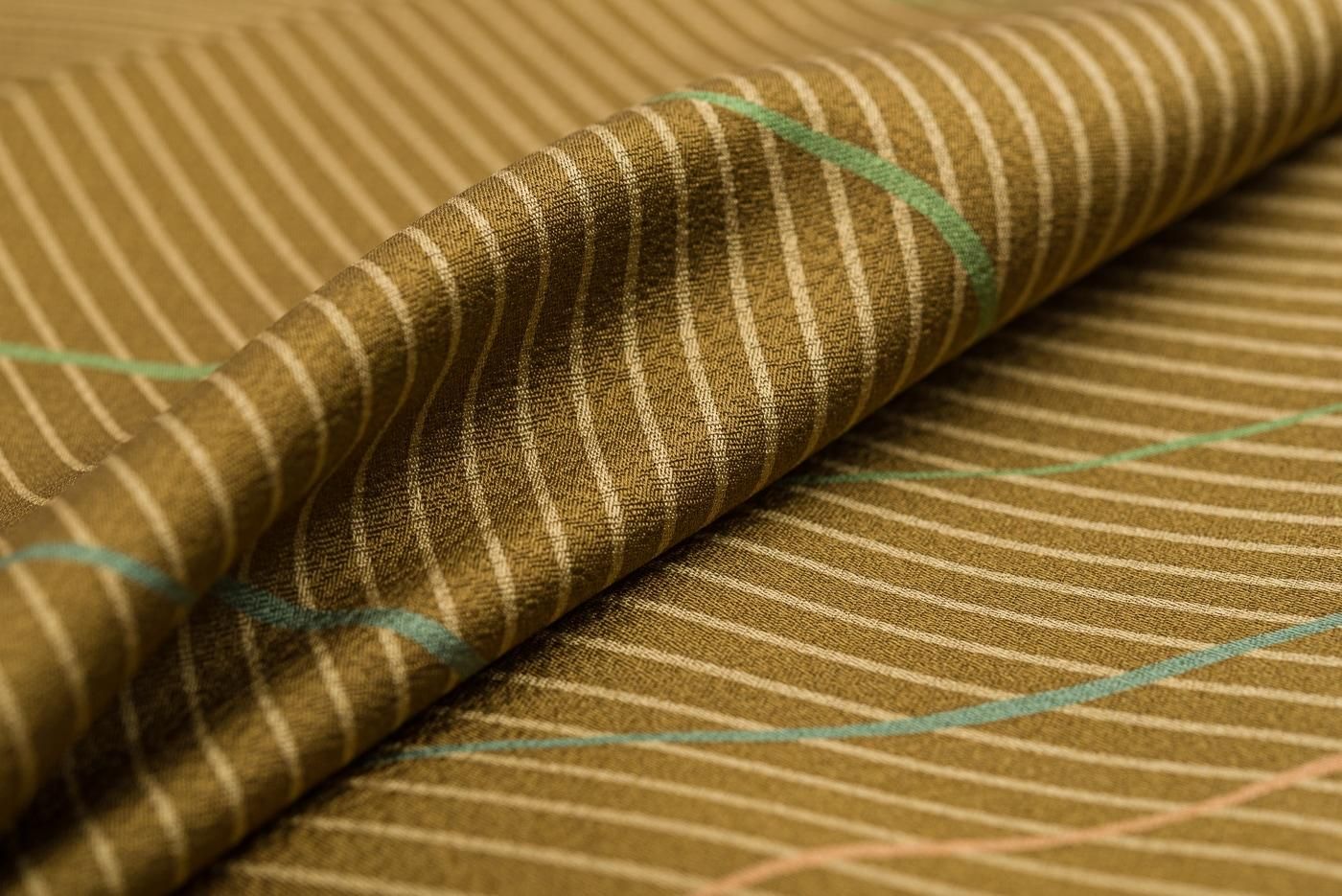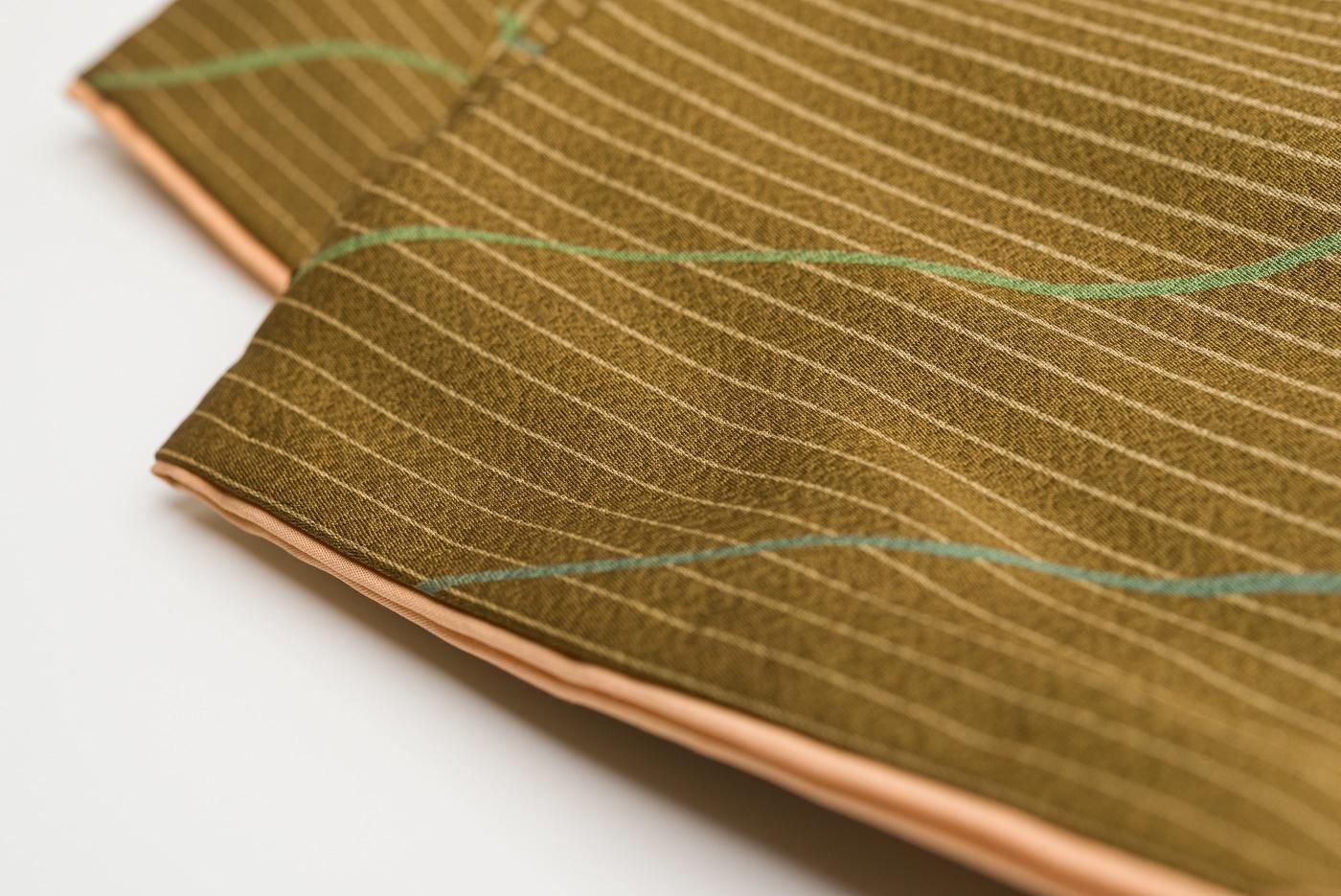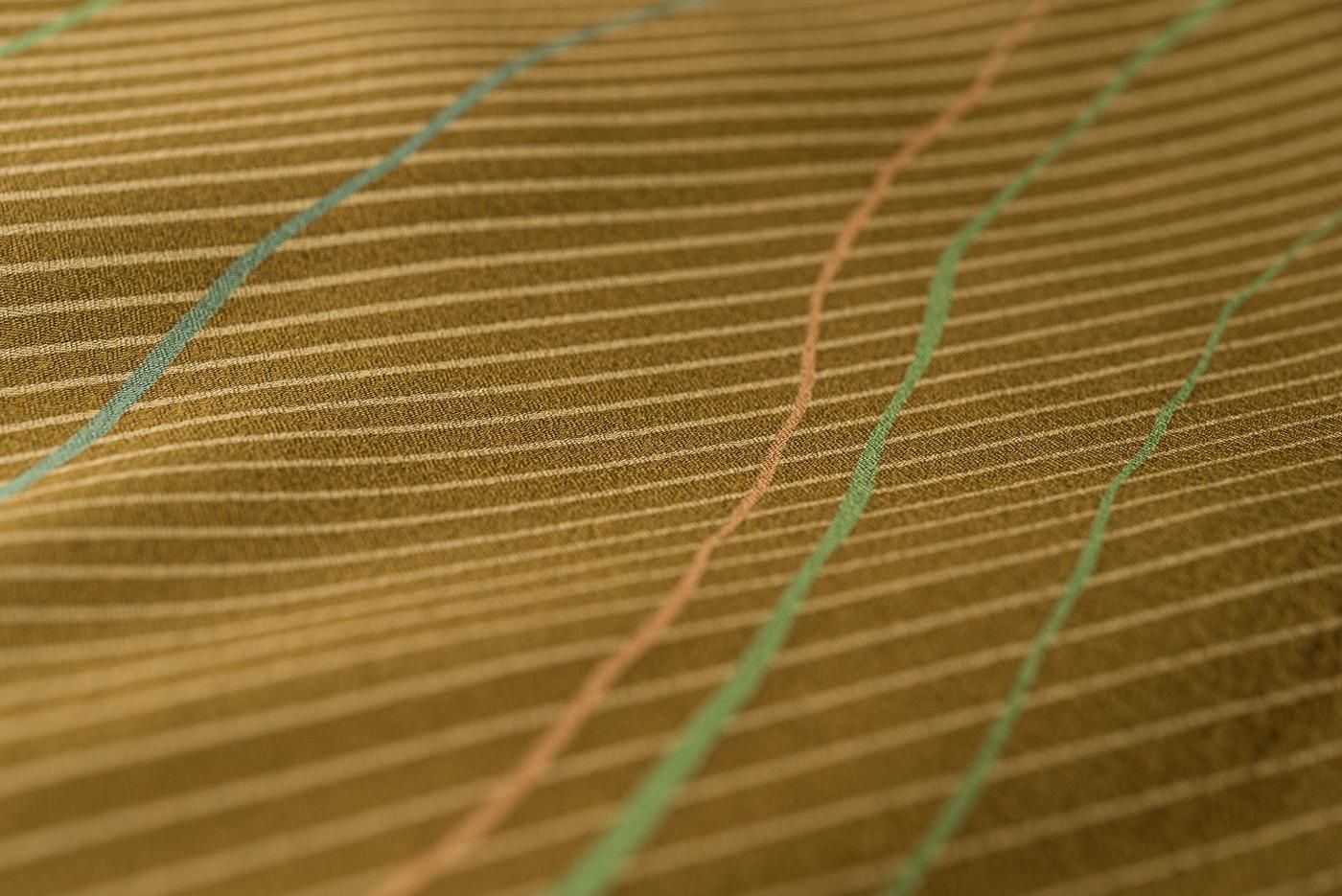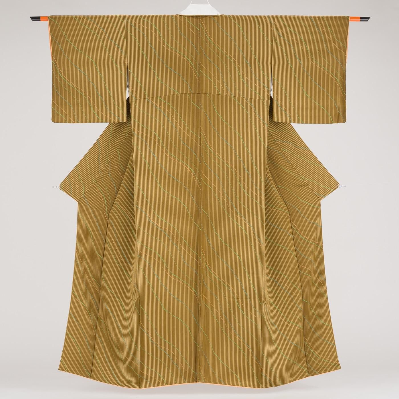 落ち着いた黄土色の地に細い縦縞と曲線を染めた小紋の着物です。