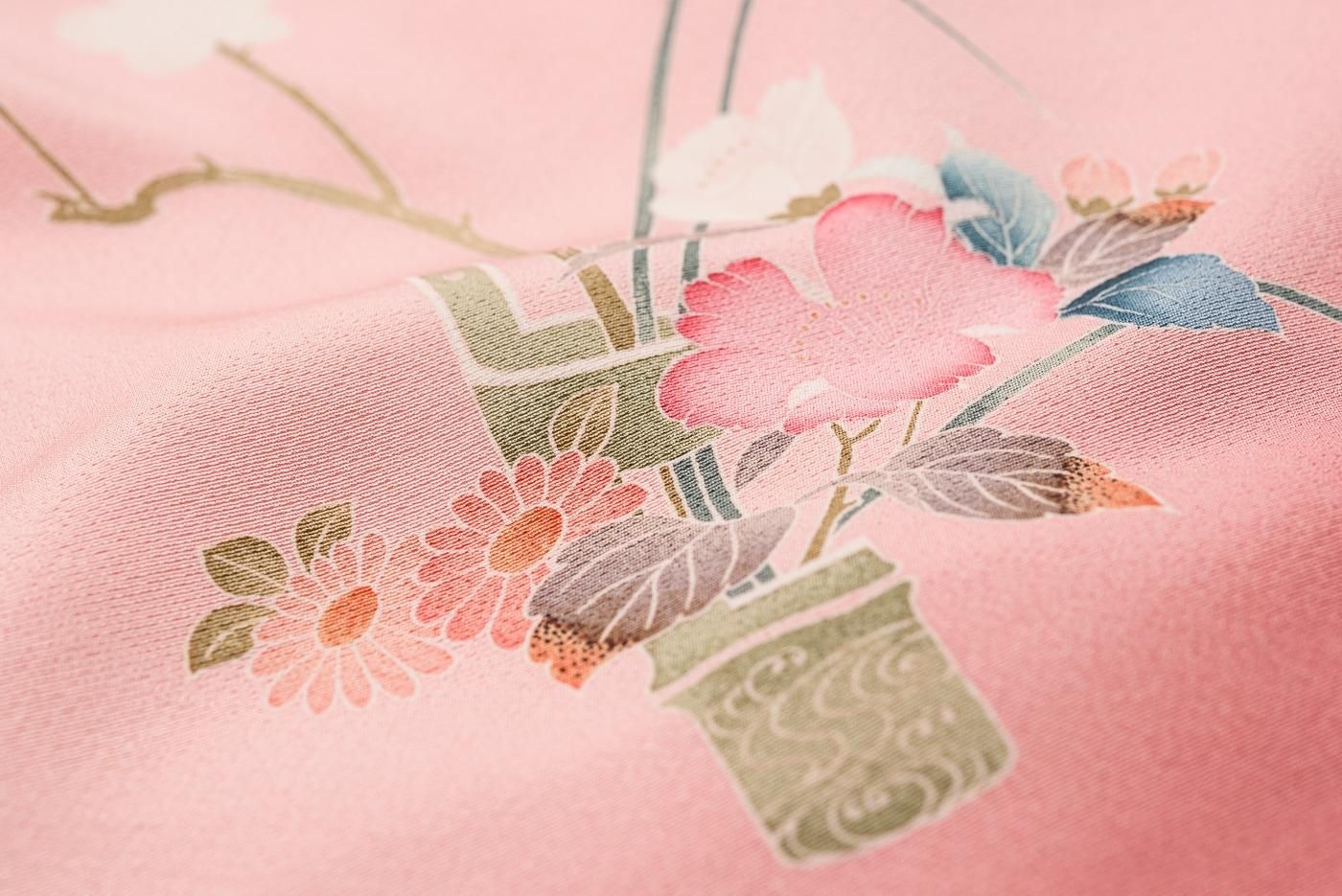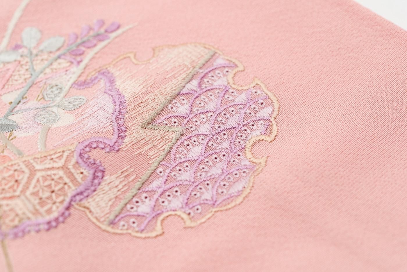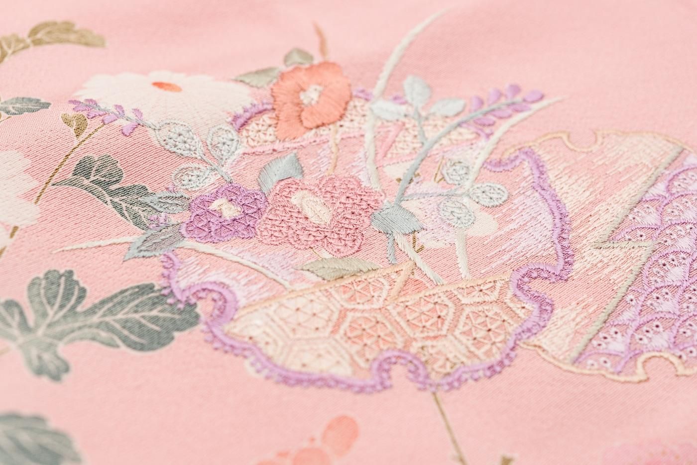 花に重ねた雪輪の刺繍も地色のピンクと良く似合って可愛らしい雰囲気です。