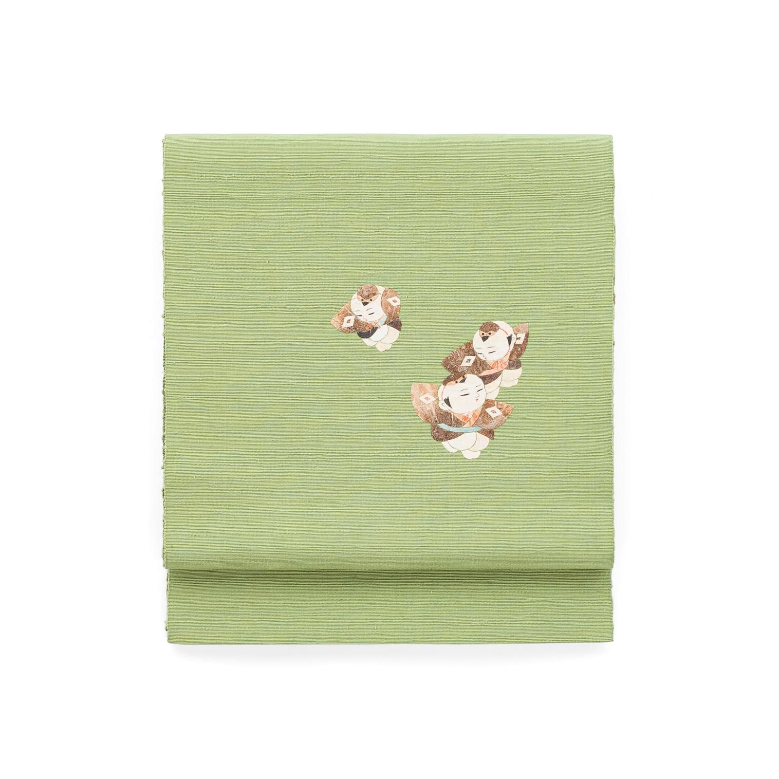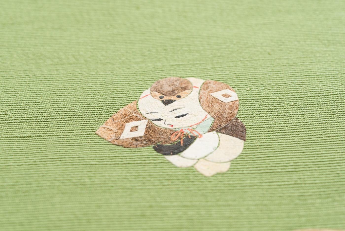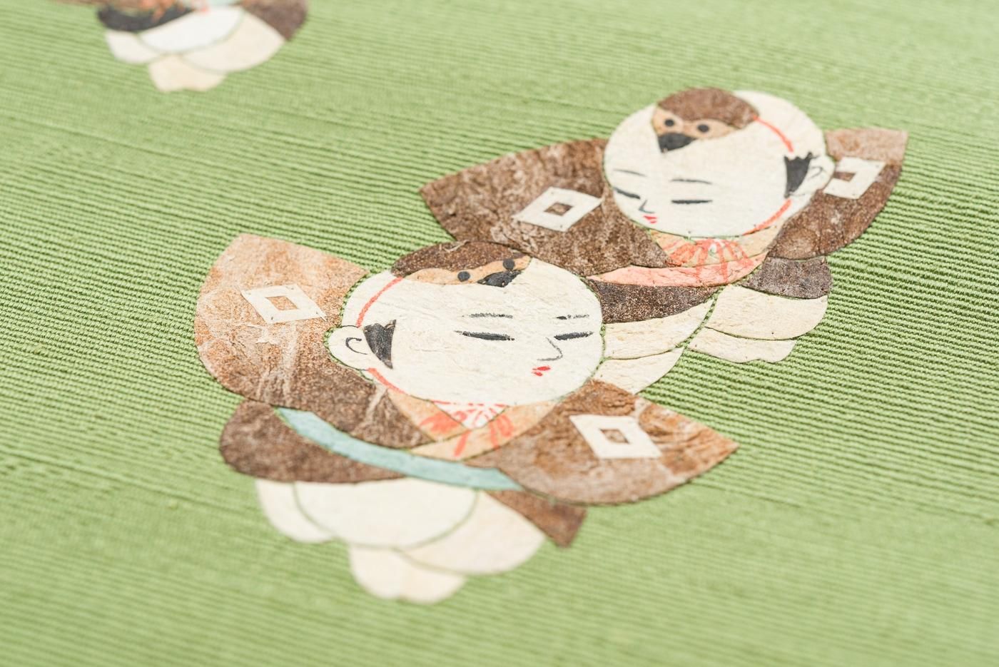 草色の結城紬の帯地に奴人形が踊る何とも愛らしい柄ですね。