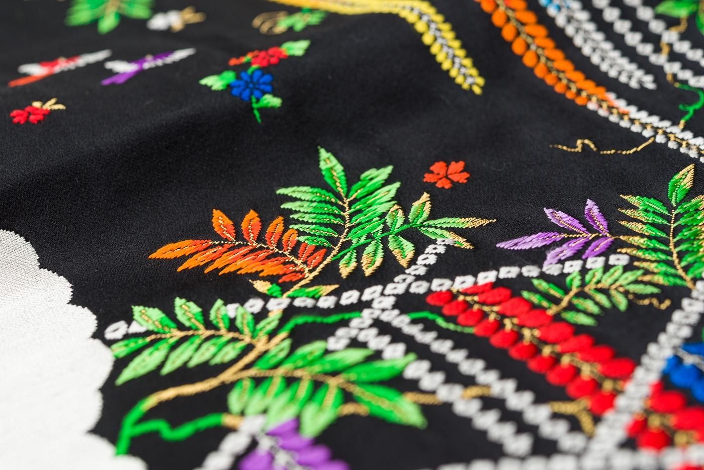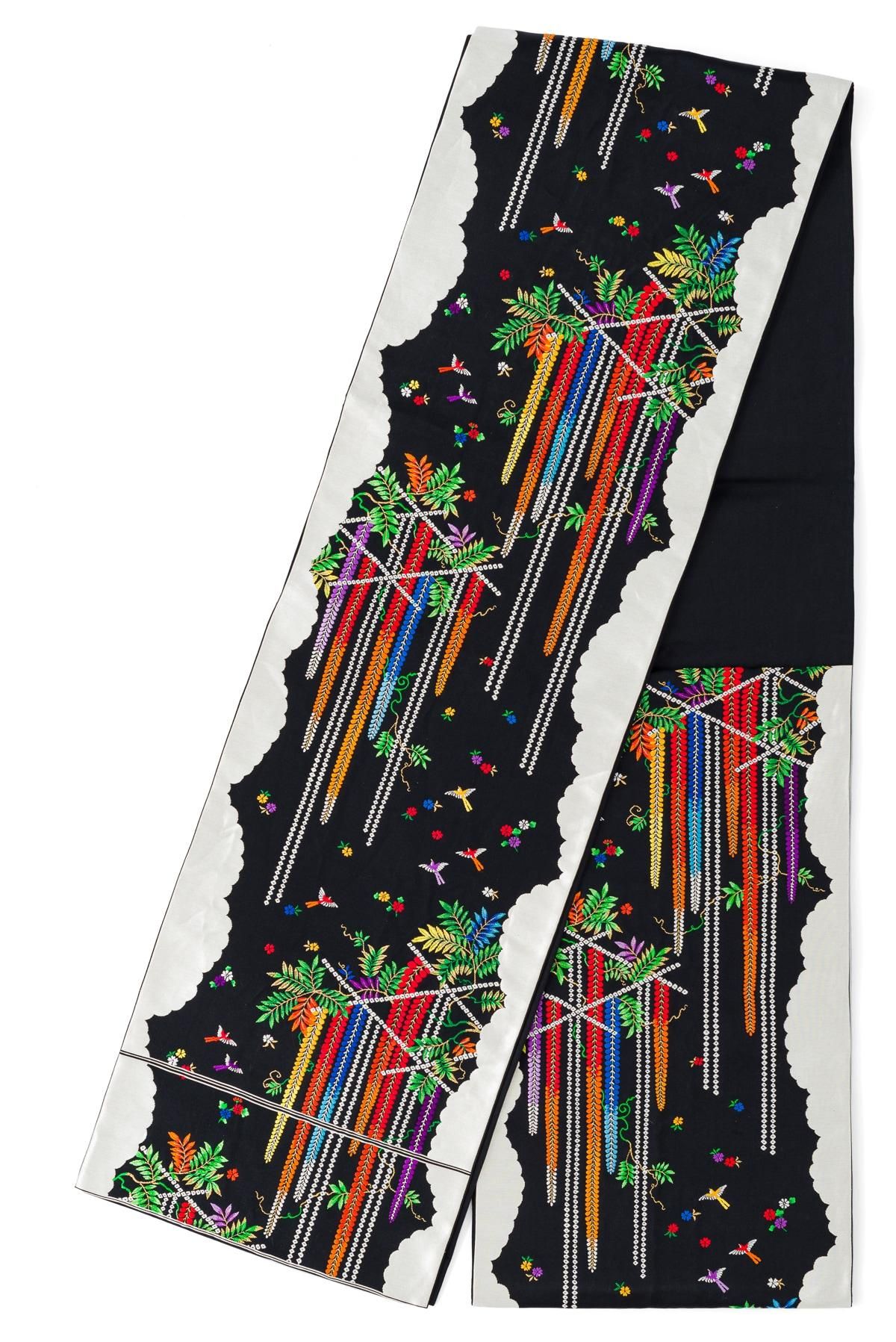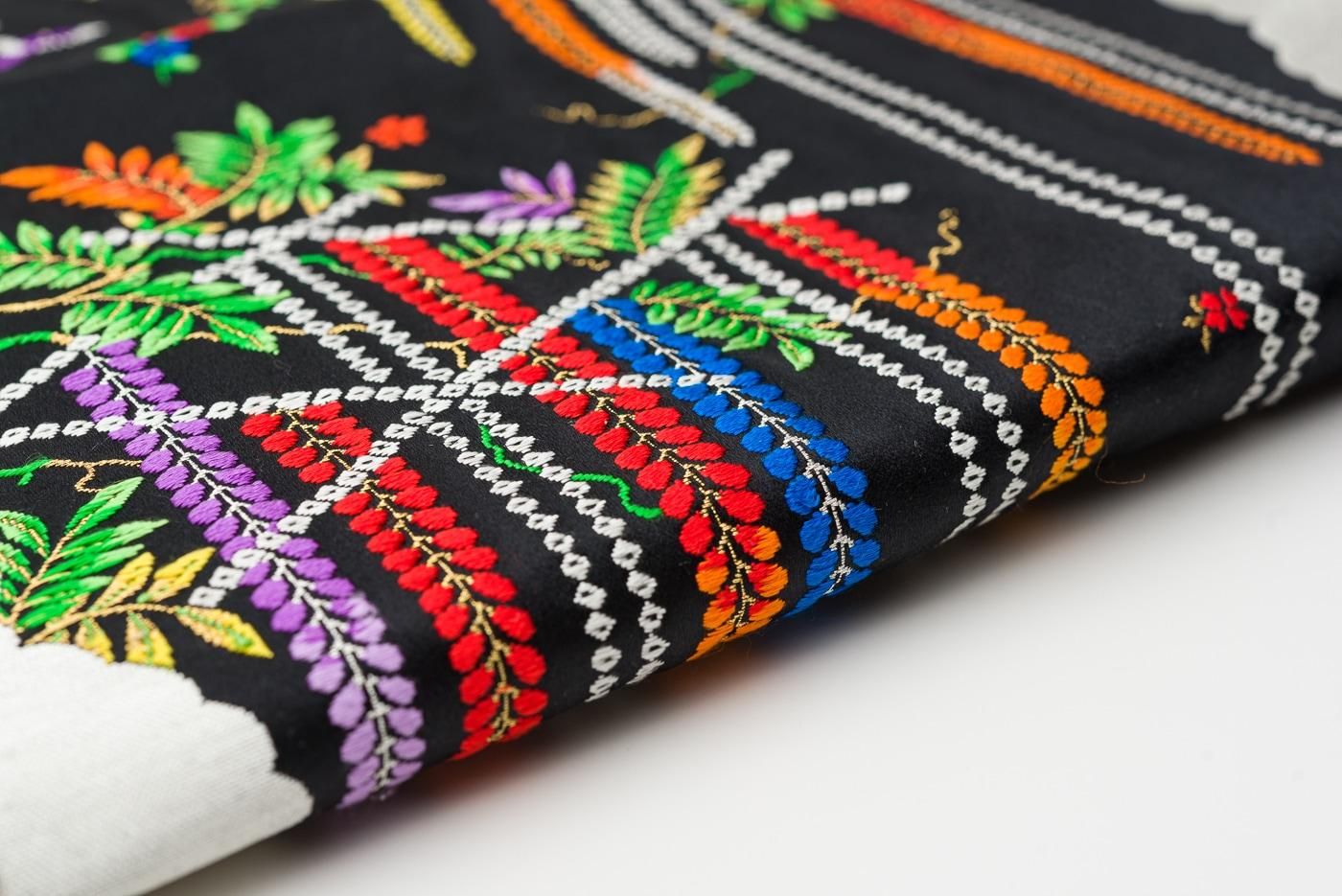 黒の地にヴィヴィッドな柄の色が映える印象的なデザインです。