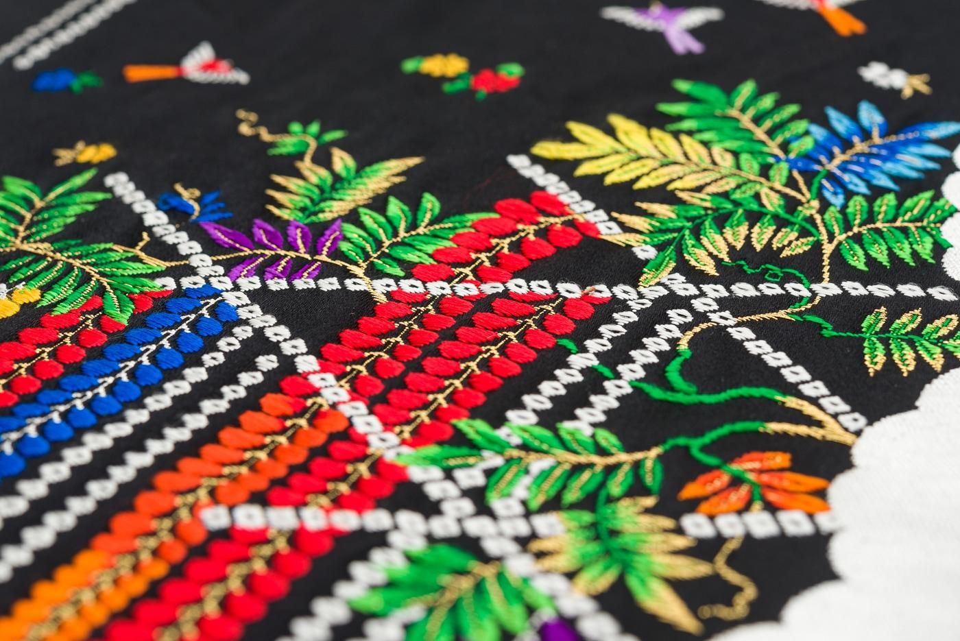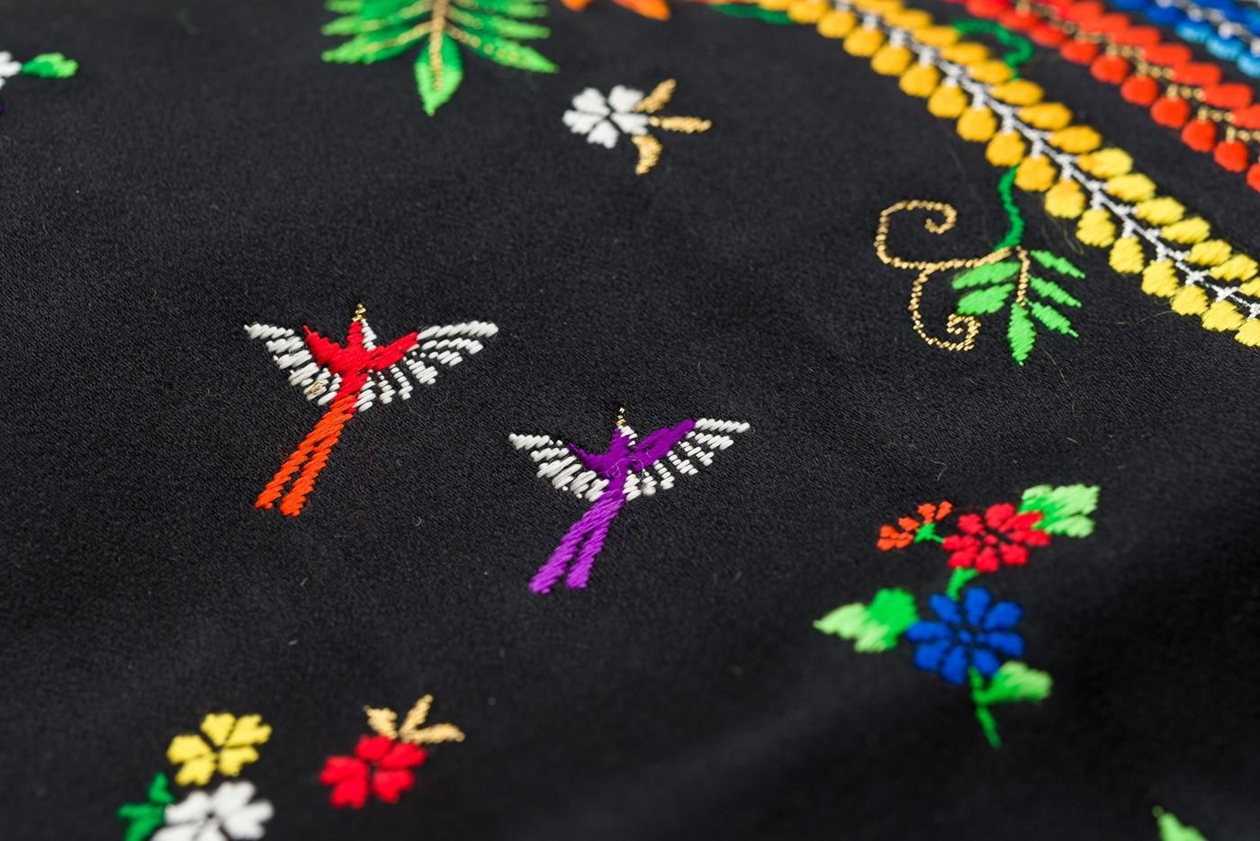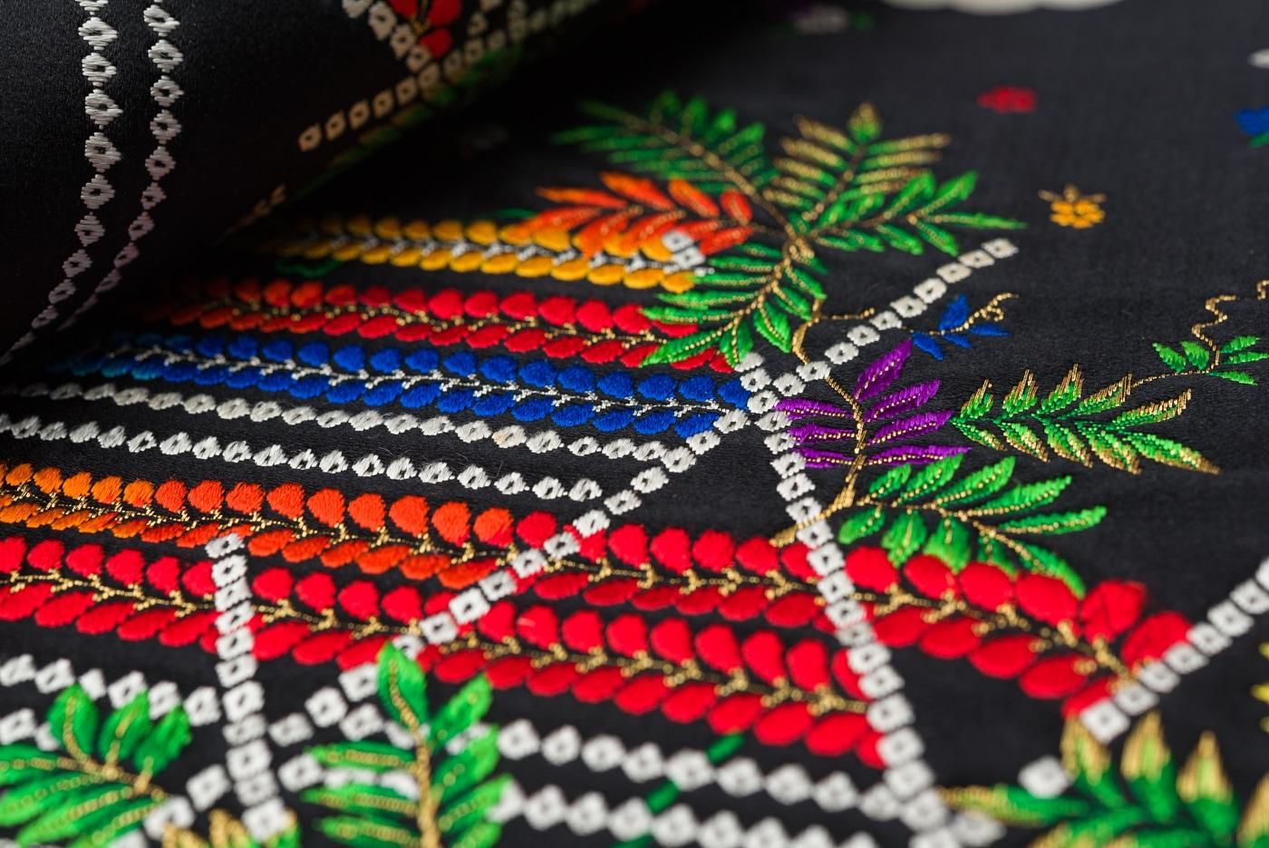 黒の地にヴィヴィッドな柄の色が映える印象的なデザインです。