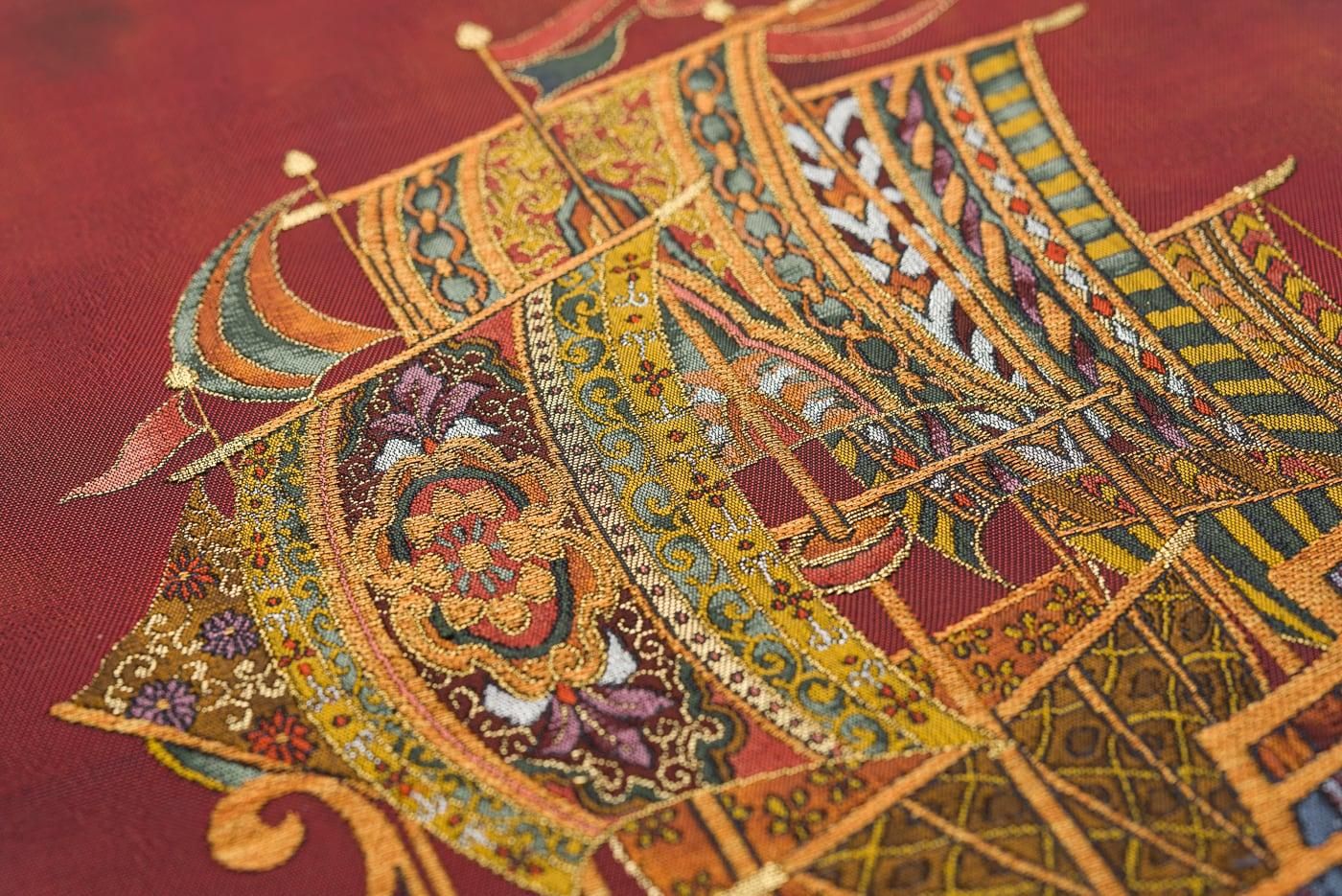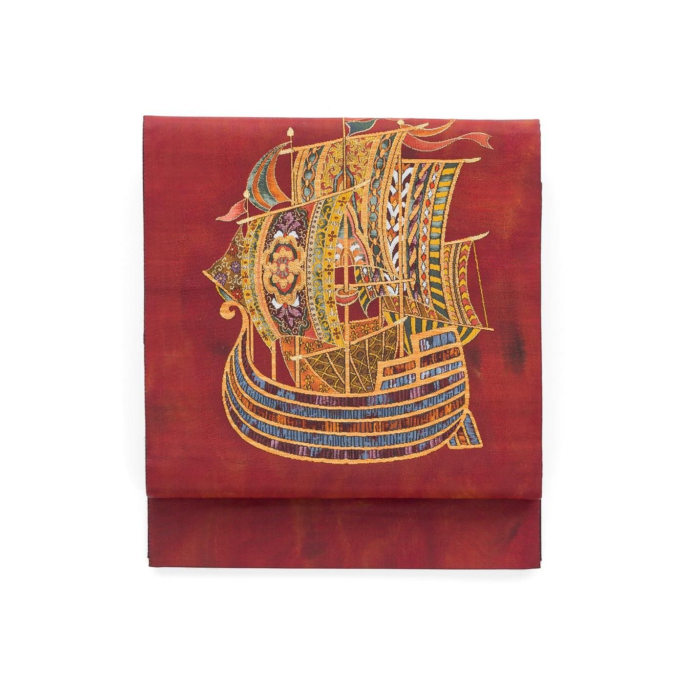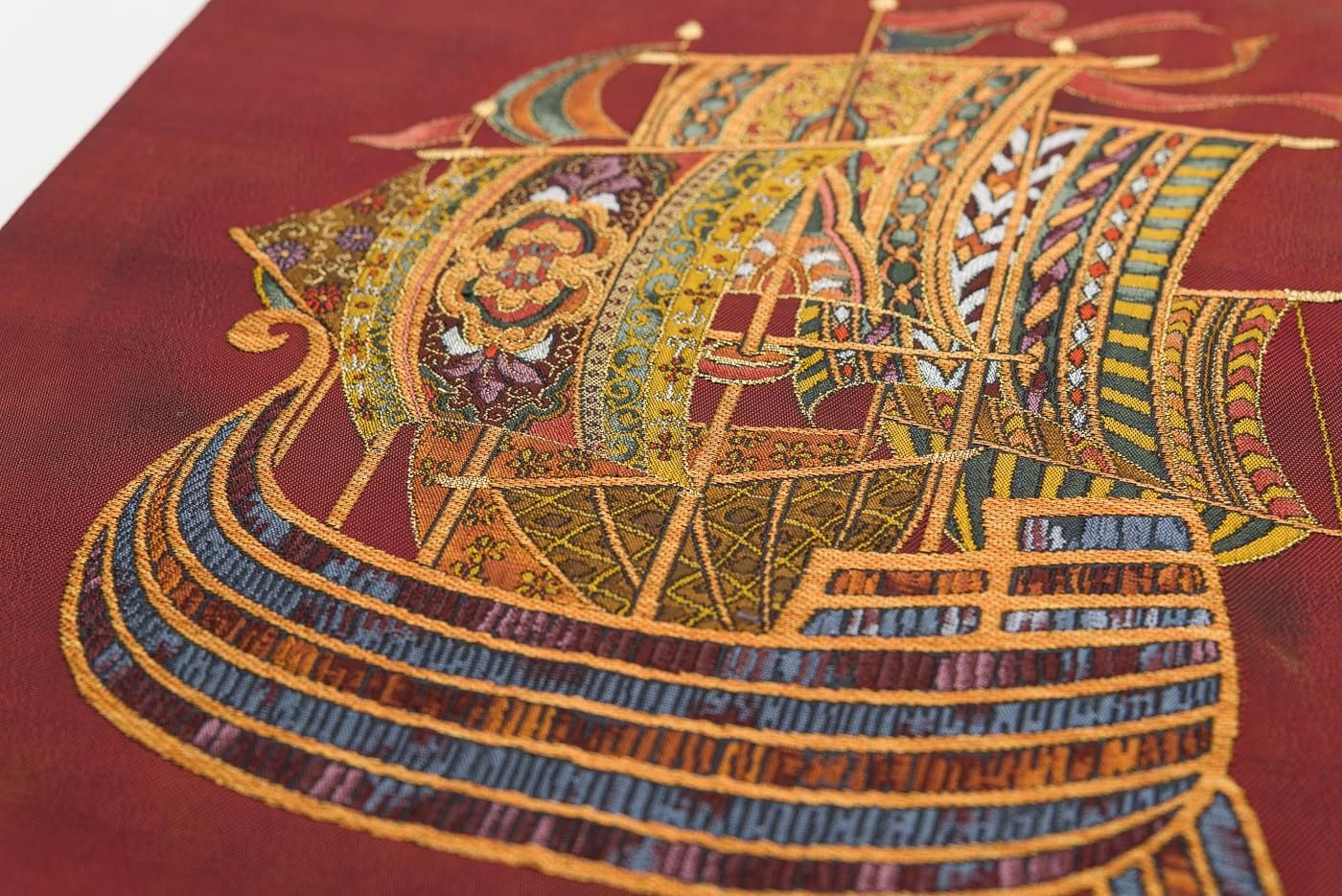 華やかな帆を掲げた帆船をお太鼓に大きく織り出した洒落袋帯です。