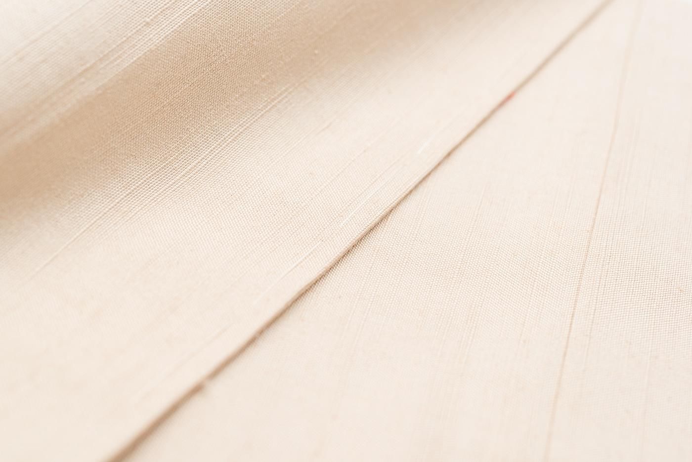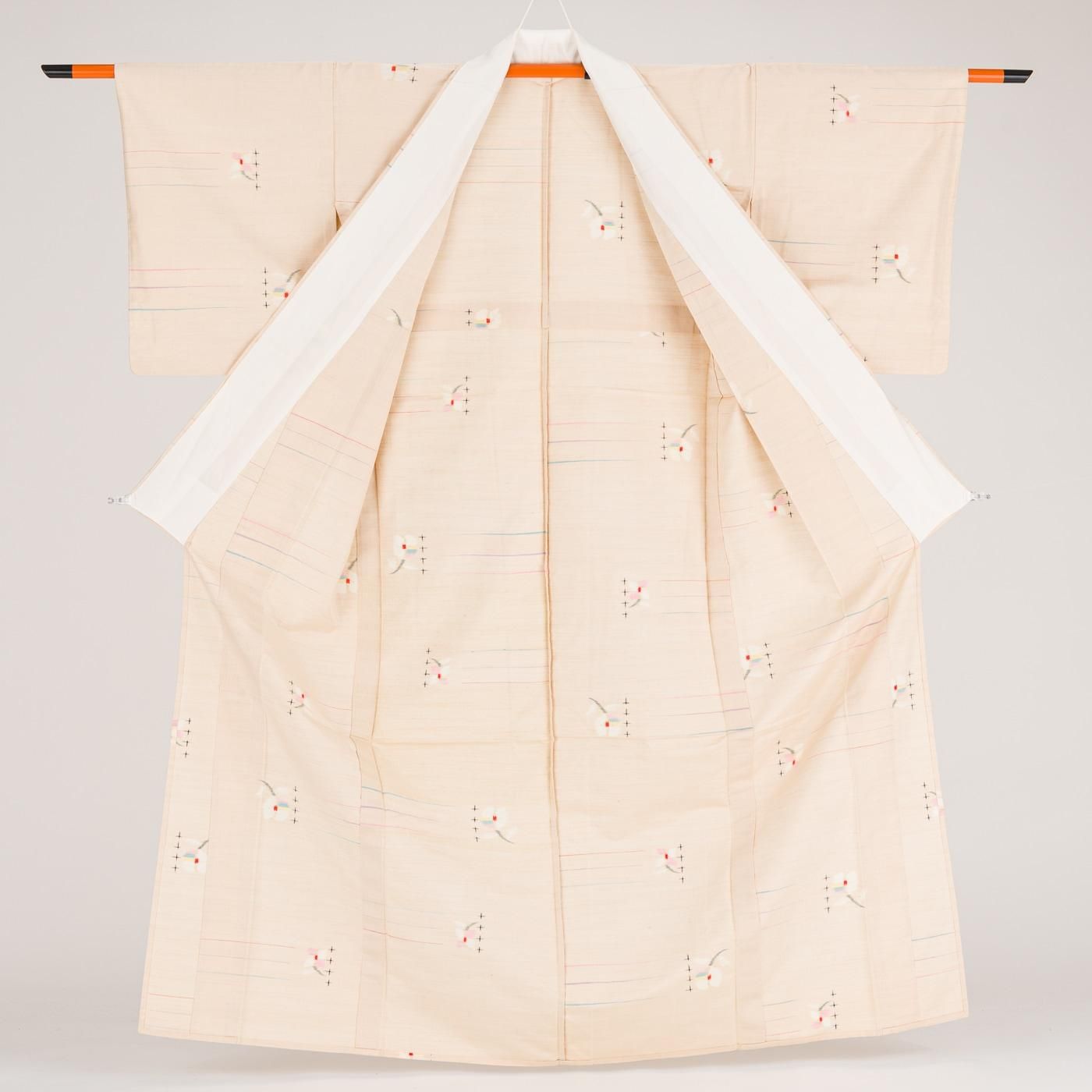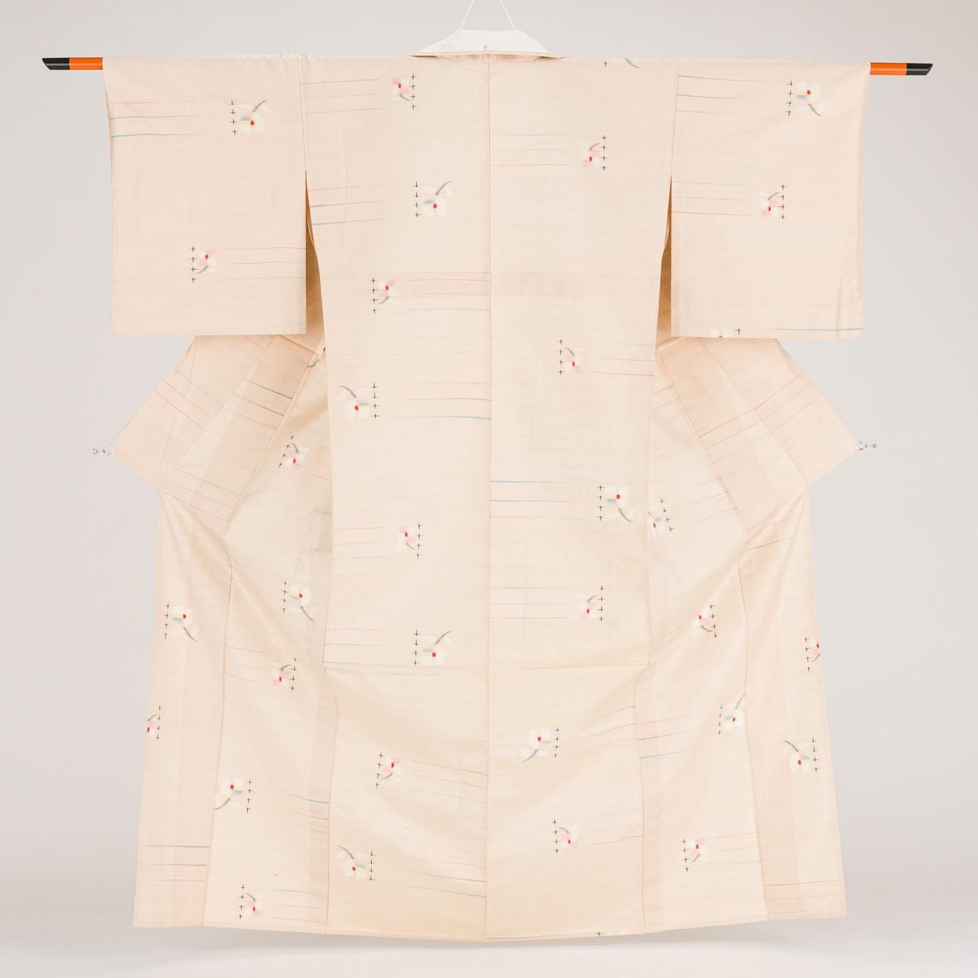 ほんのりピンクがかったベージュ地に小花を織り出した単衣の紬です。