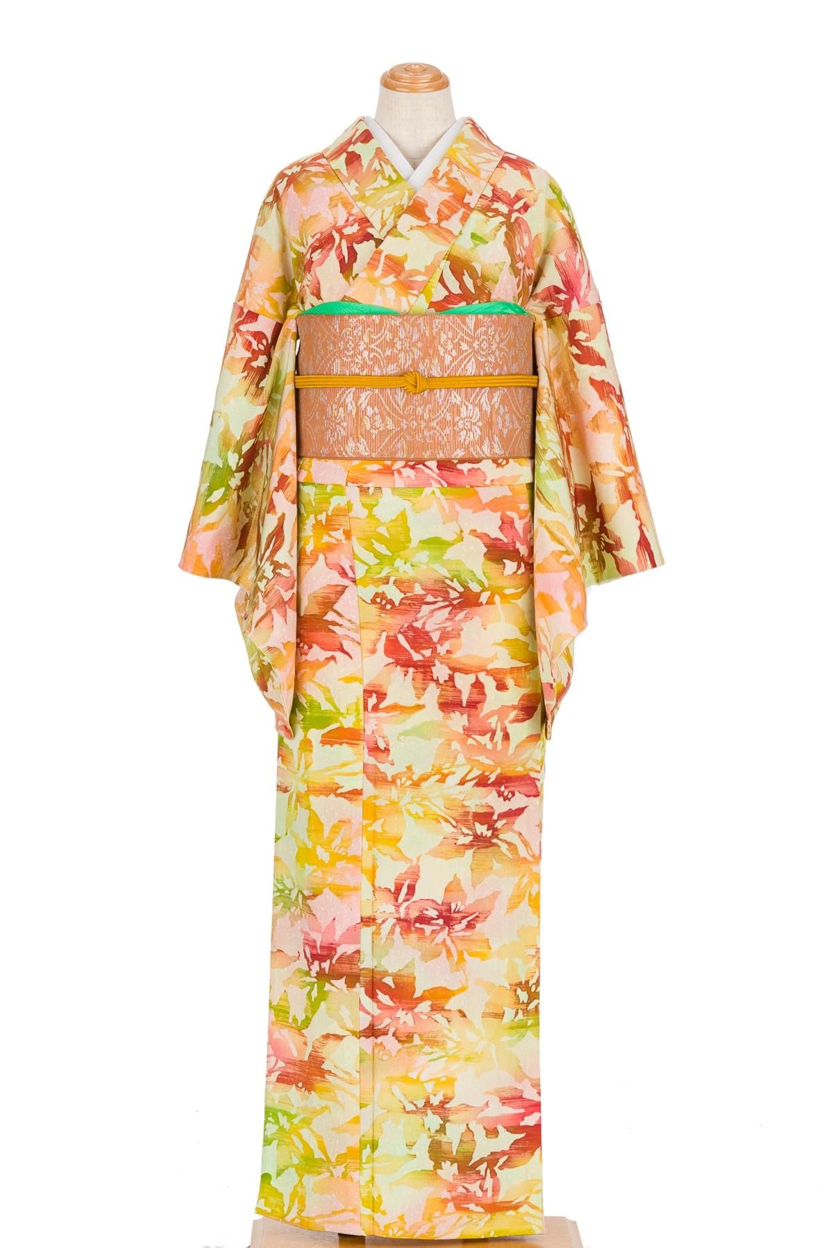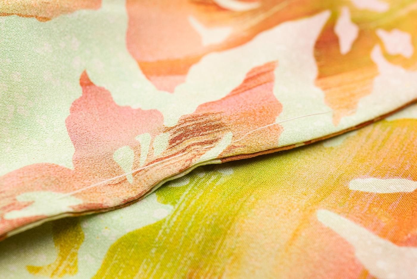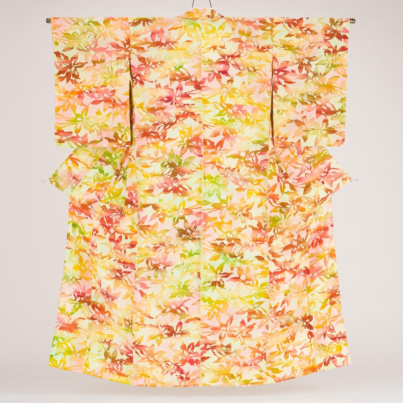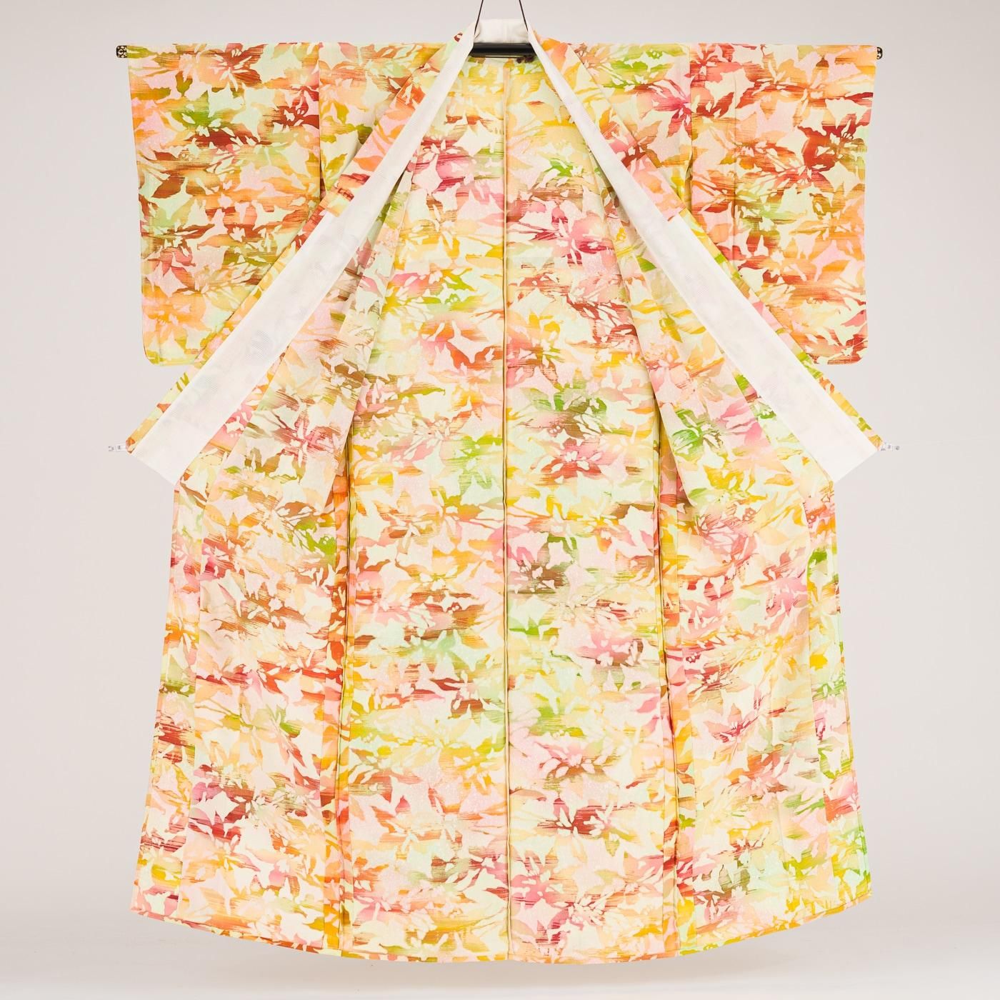 黄色、緑、赤と色がグラデーションする花模様の単衣小紋です。