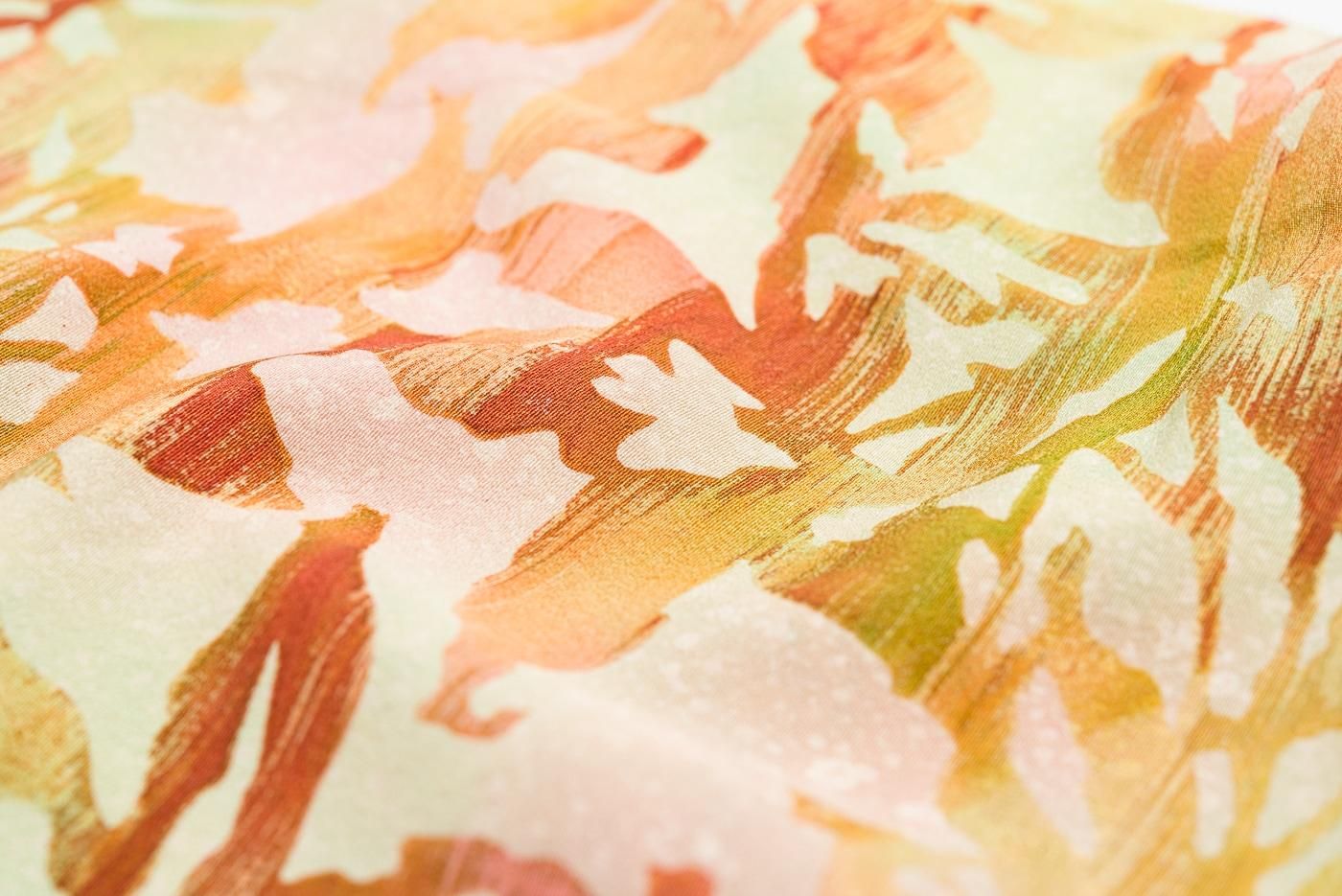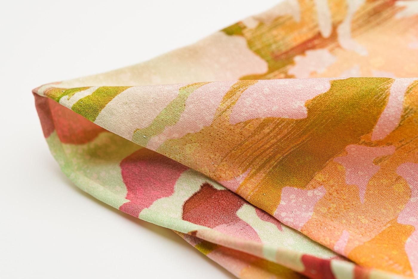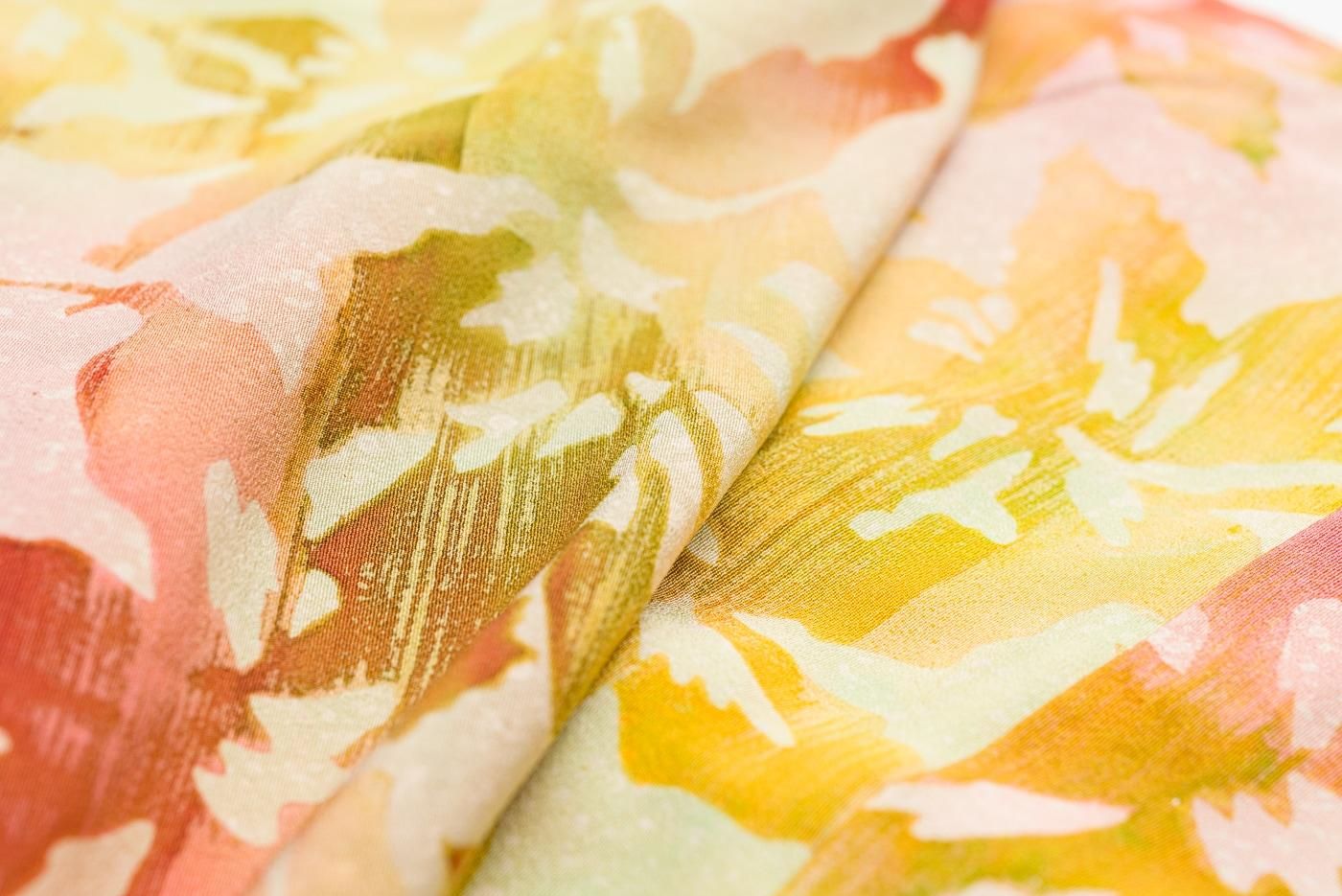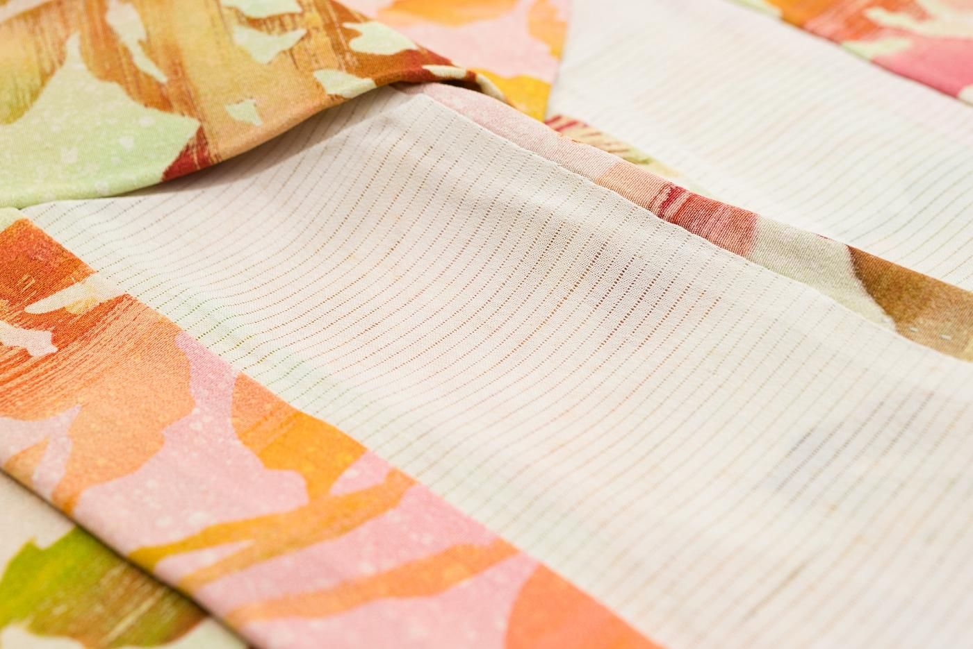 黄色、緑、赤と色がグラデーションする花模様の単衣小紋です。