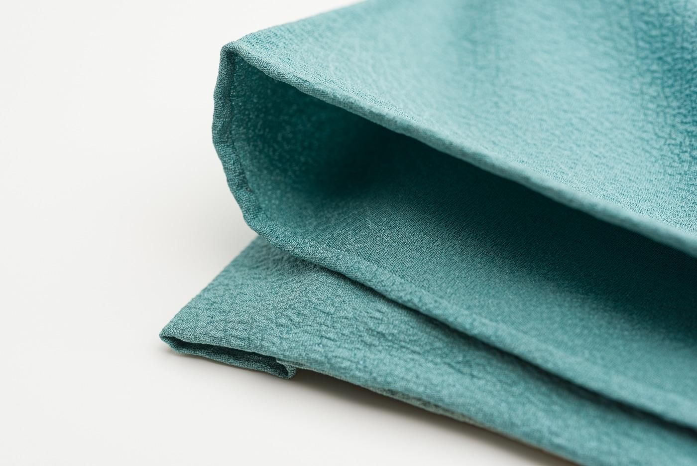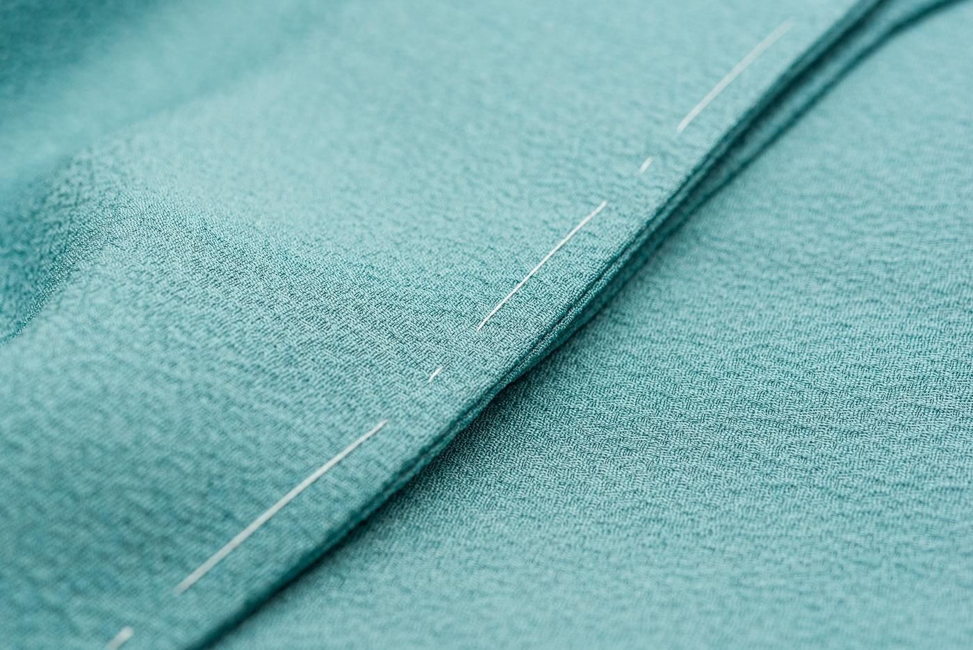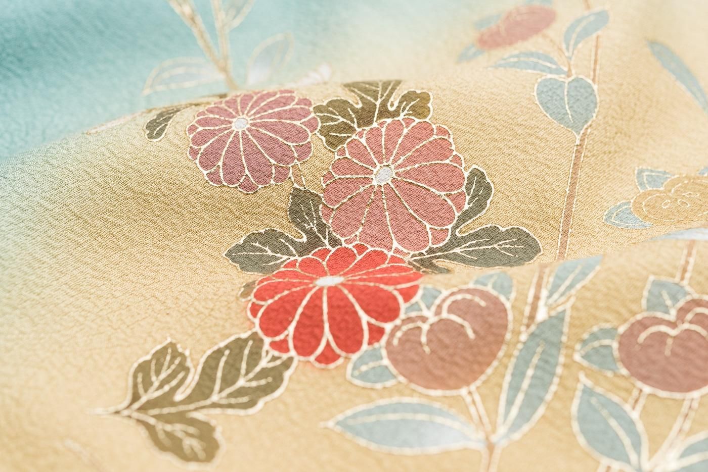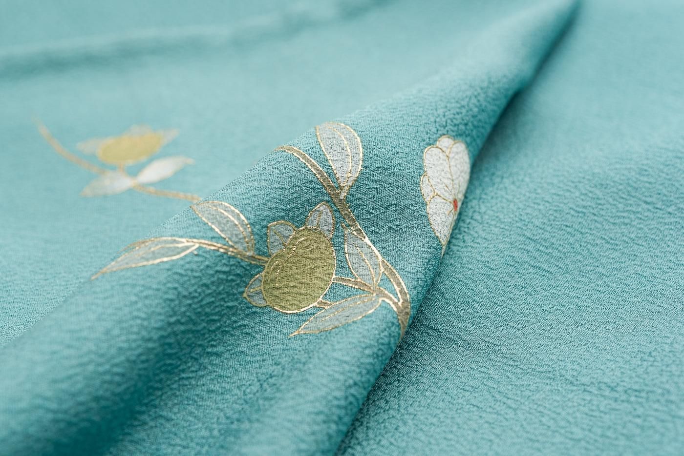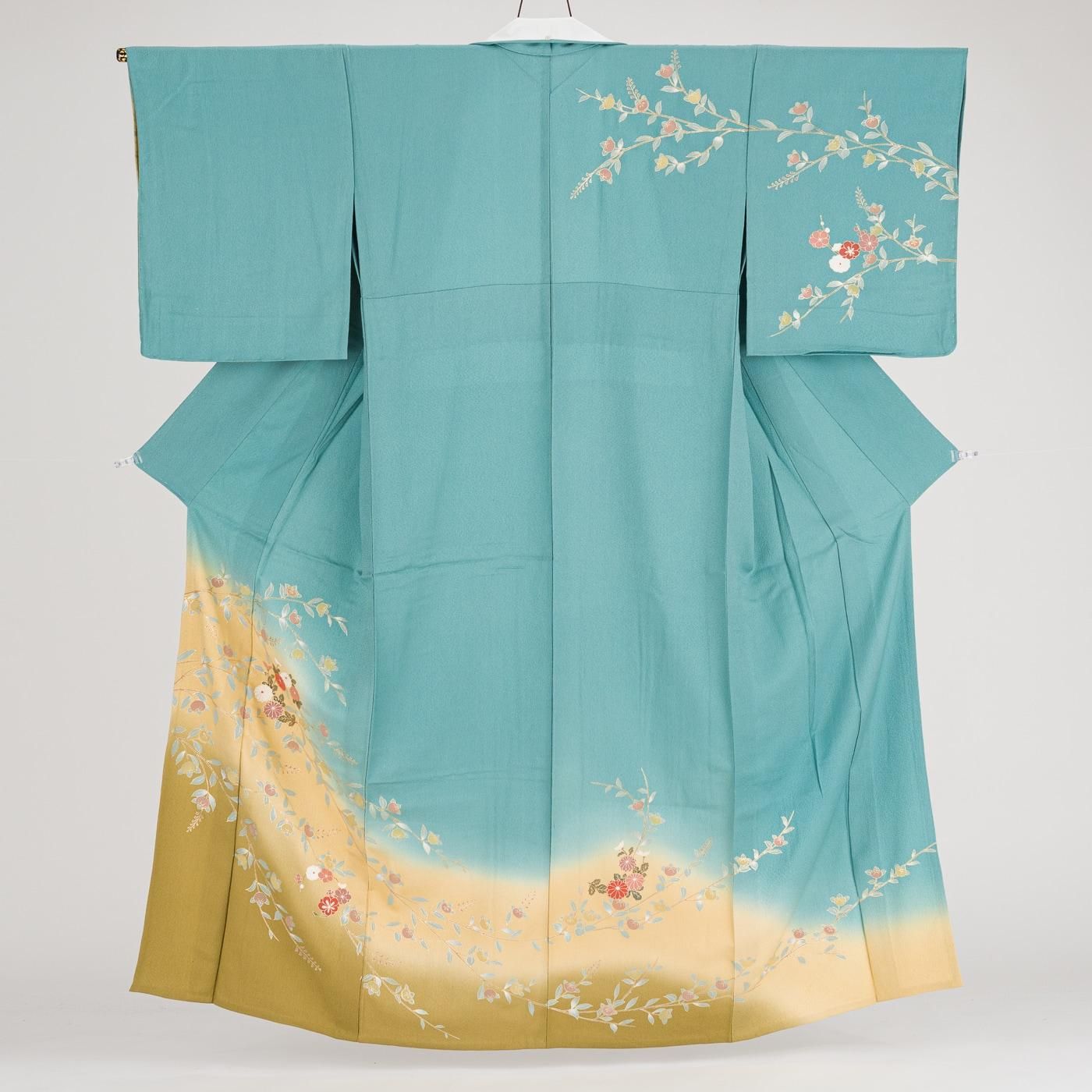 青緑の地に菊と橘を描いた単衣の訪問着です。