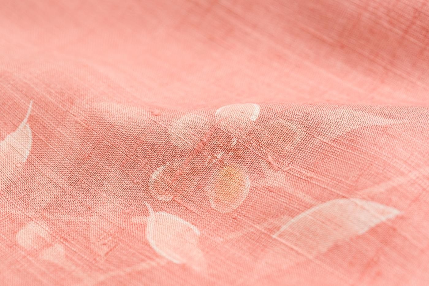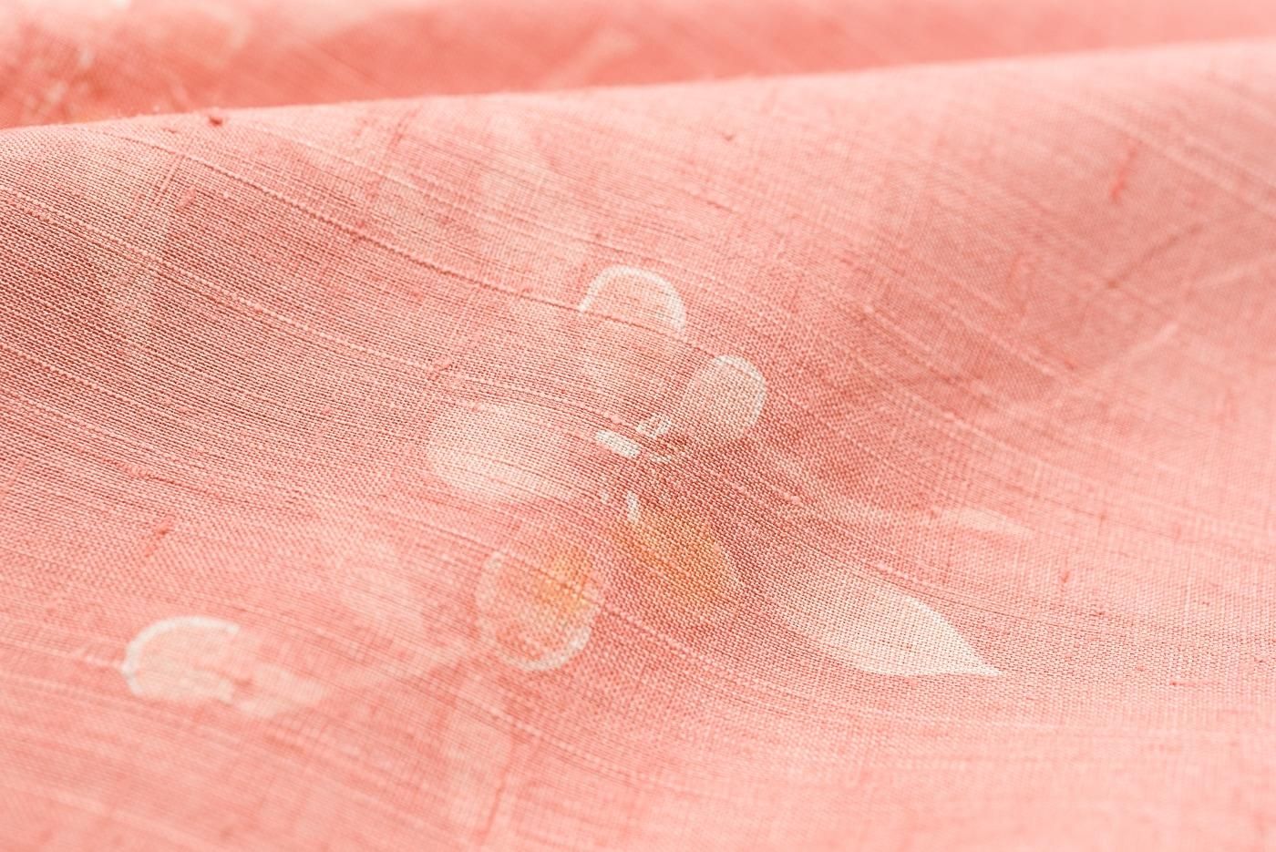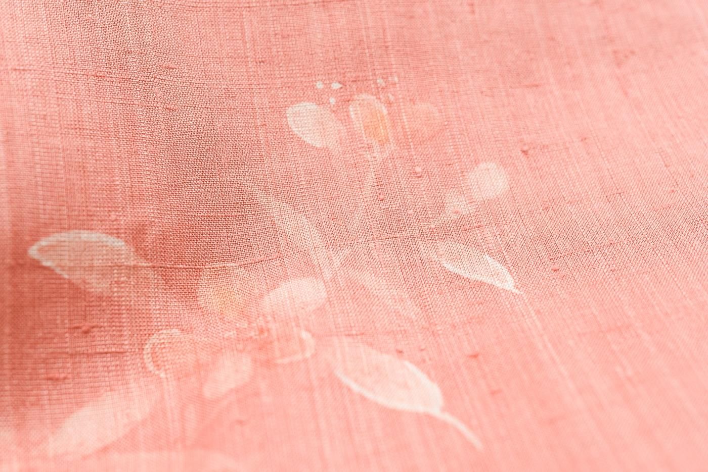 浅緋色の地に草花模様を染めた単衣の小紋です。