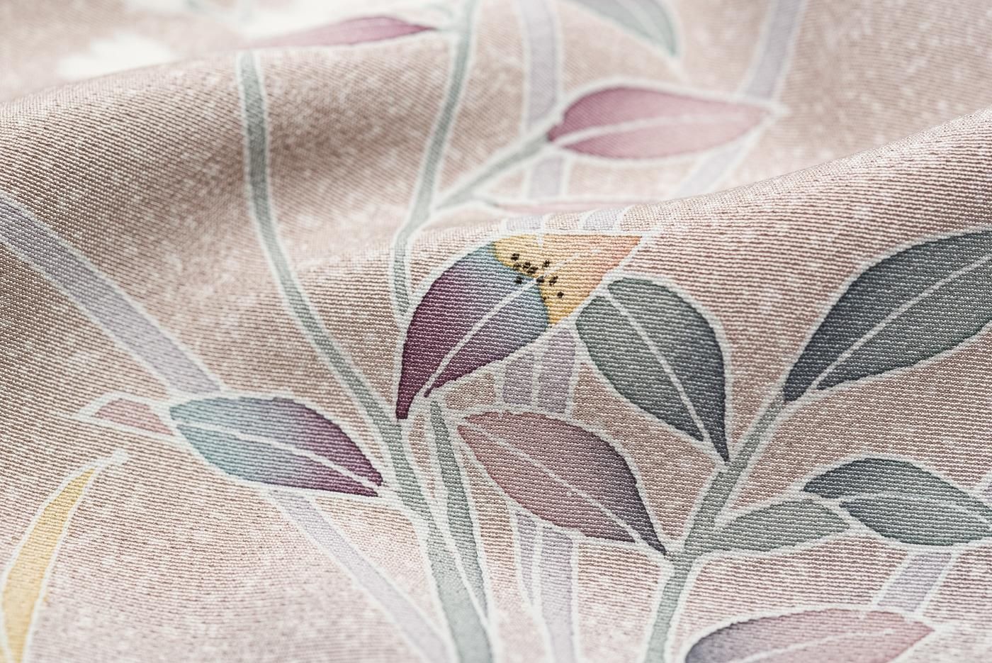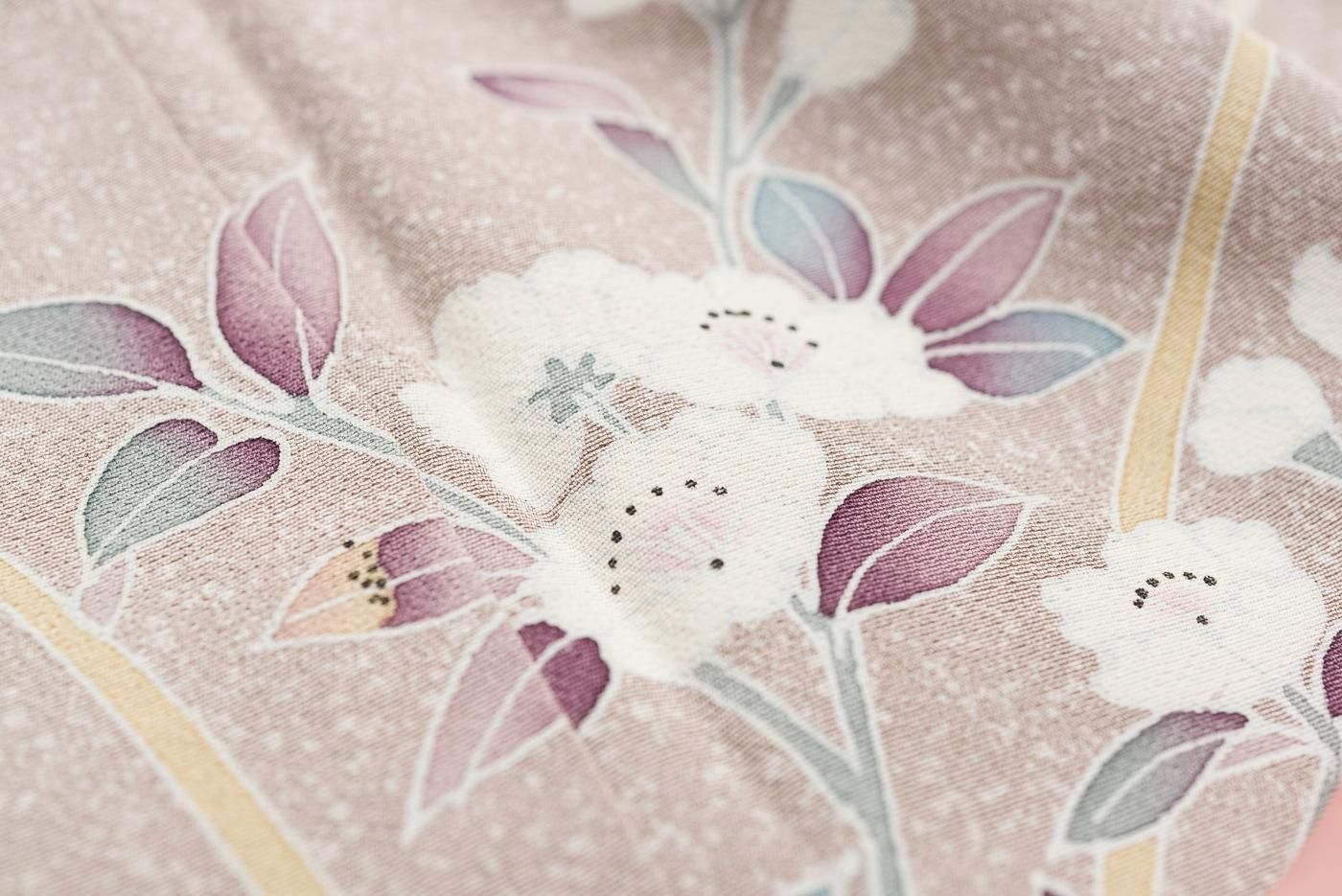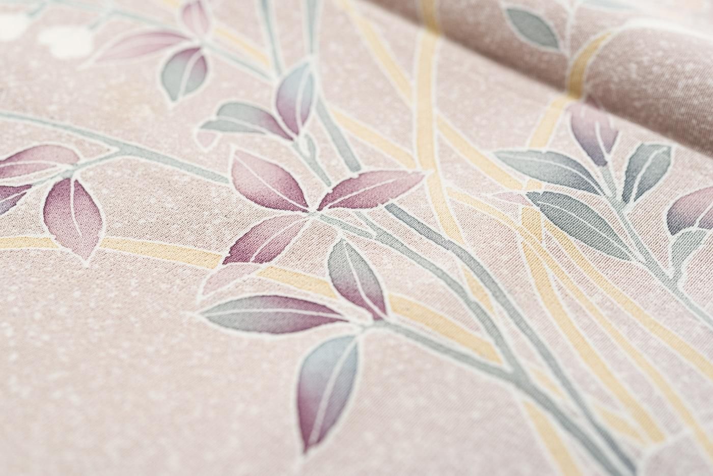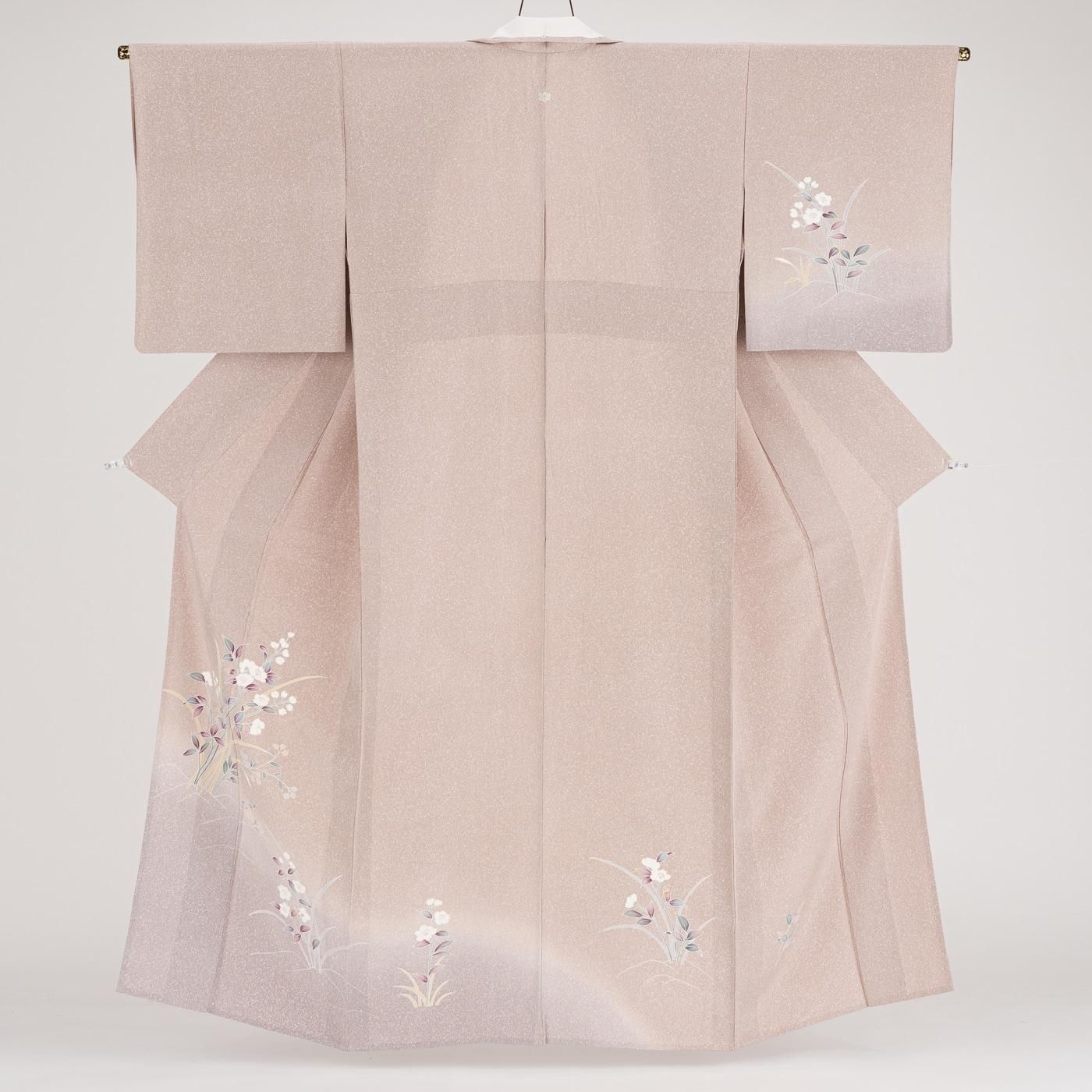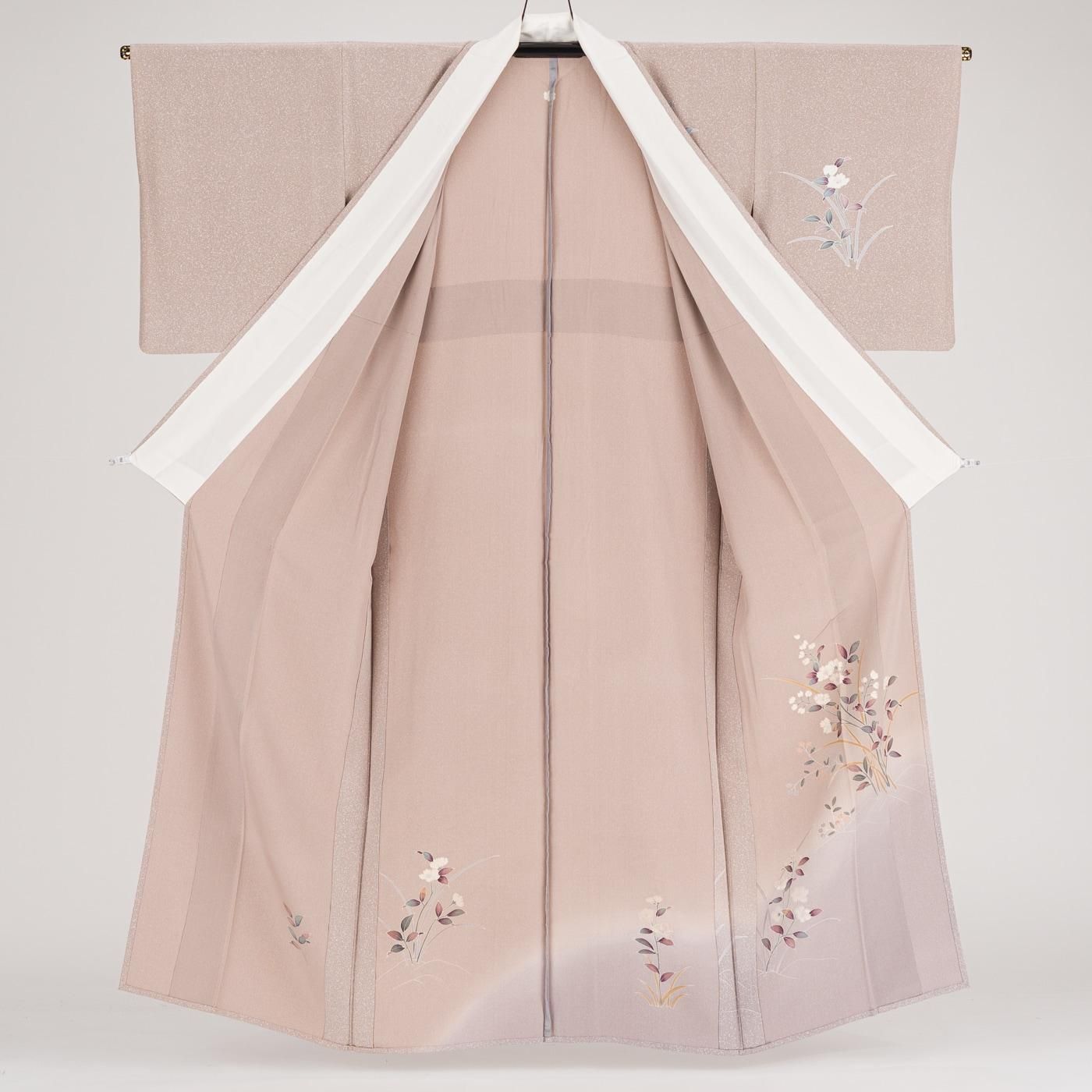 落ち着いた梅鼠色の地に加賀調の草花模様を描いた単衣の付下げ訪問着です。