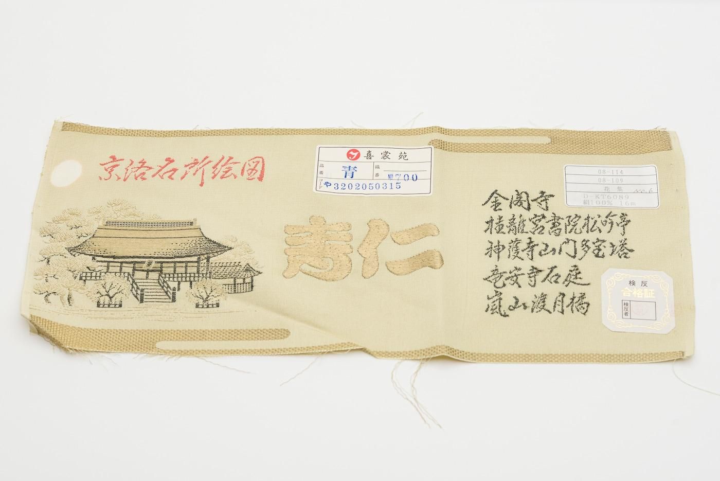 京洛名所絵図の題名通り、金閣寺、桂離宮、竜安寺など京都の名所の数々が地紋に織り出されています。